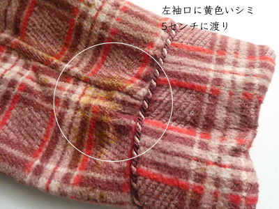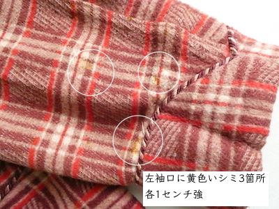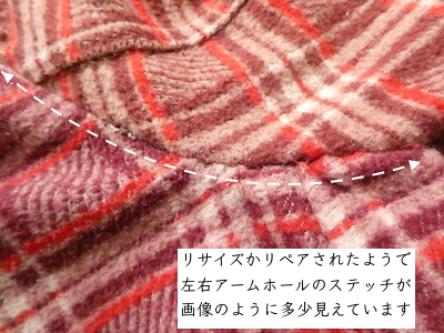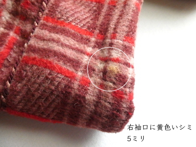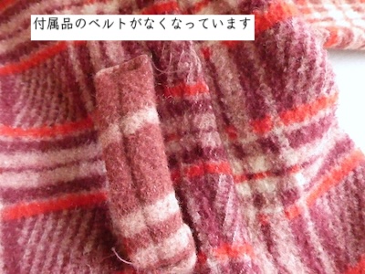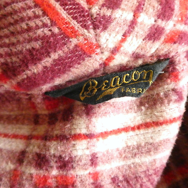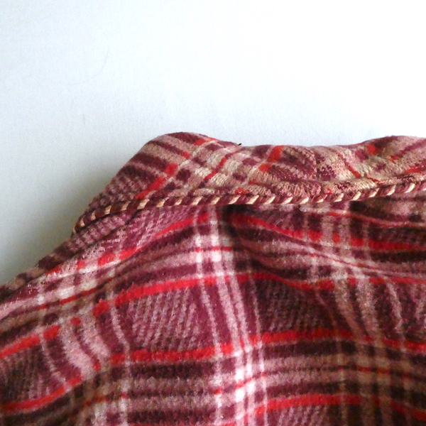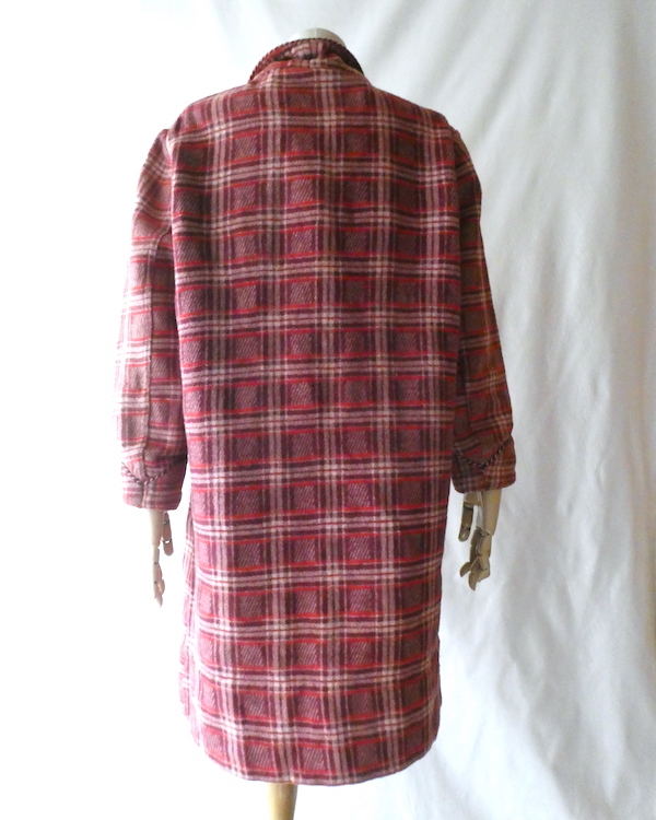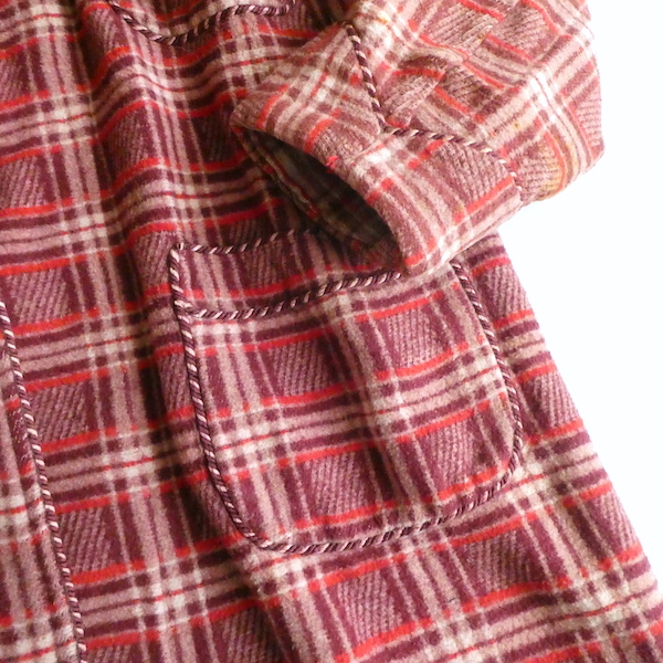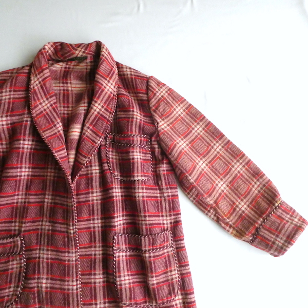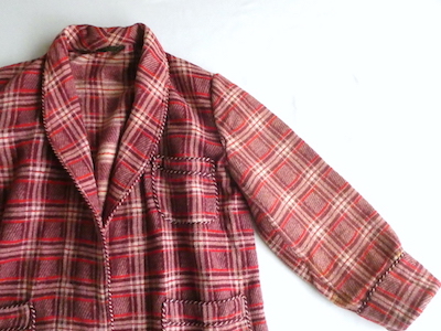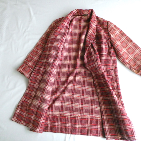 ウール素材のガウンです。ボルドー生成りにパキッと赤いラインが入ったチェック生地。縁にはスモーキンJKTによく着くコードが付いています。ポケットも有り、比較的しっかり厚手のウールなので、アウターとして活躍してくれそうな一枚です。