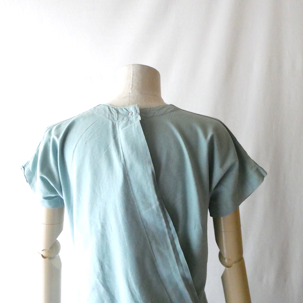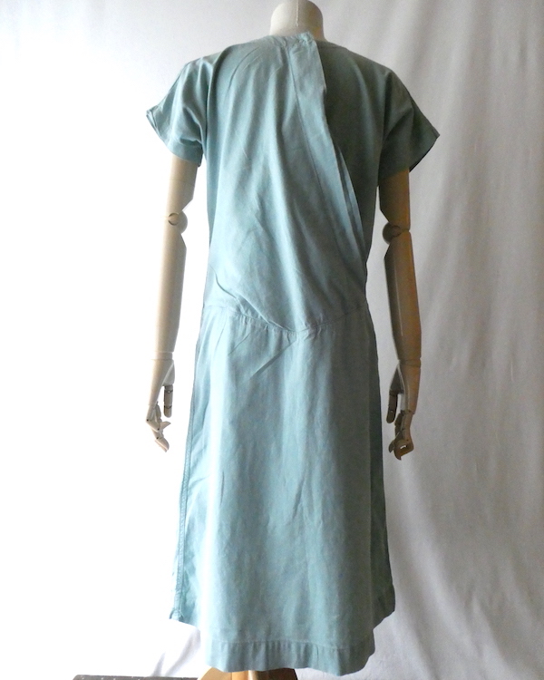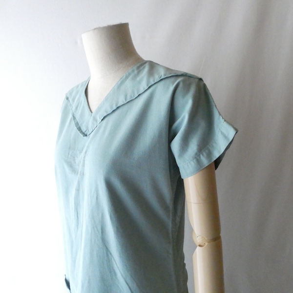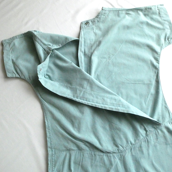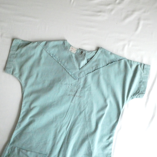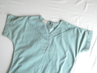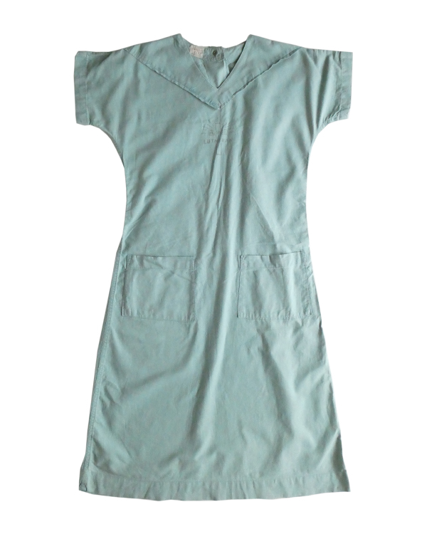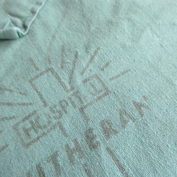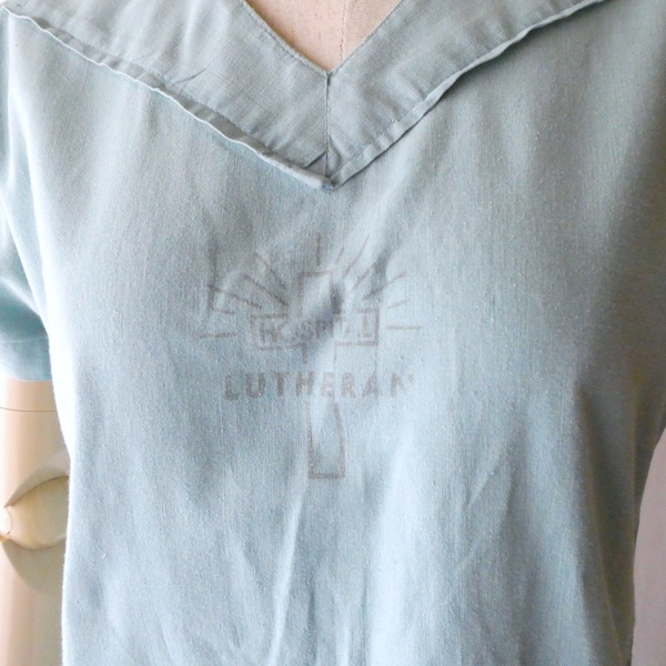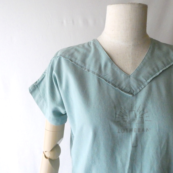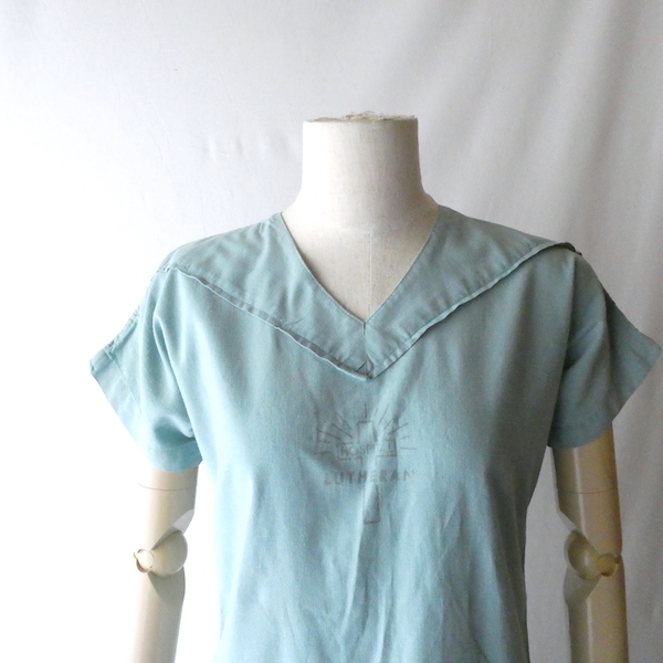 半袖のコットンワンピース。当時のナースユニフォームです。少しくすみのあるミントグリーンのコットン生地。教会系の病院のようで、胸元には十字架とルーテルホスピタルのステンシル。背中側にスナップボタンが付き、斜めに開きます(後ろ開きやカラー、つけ襟やカフスも無いのでオペ等用かもしれません)胸元のステンシルデザインとヴィンテージ感のある色味が可愛らしいアイテム。レイヤード等にも◎