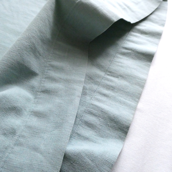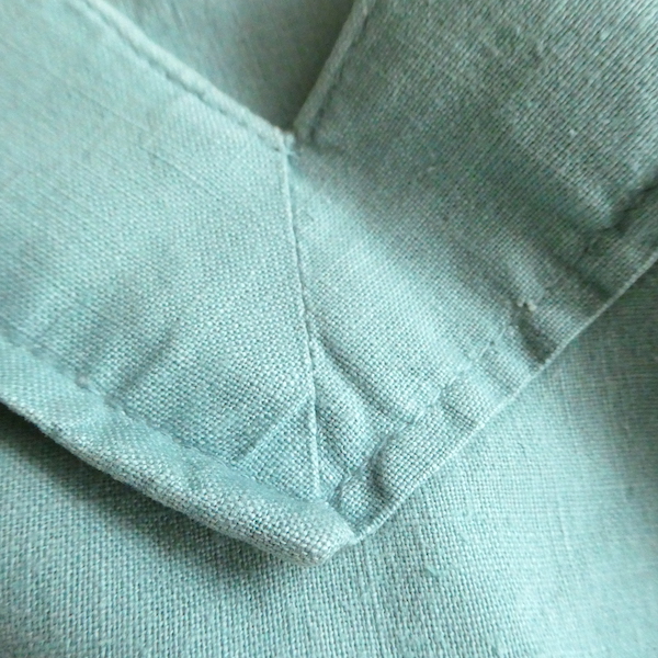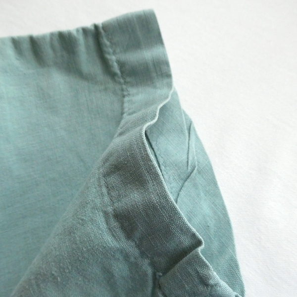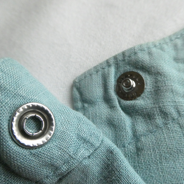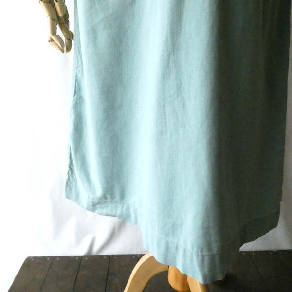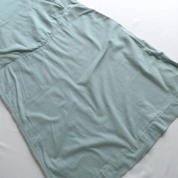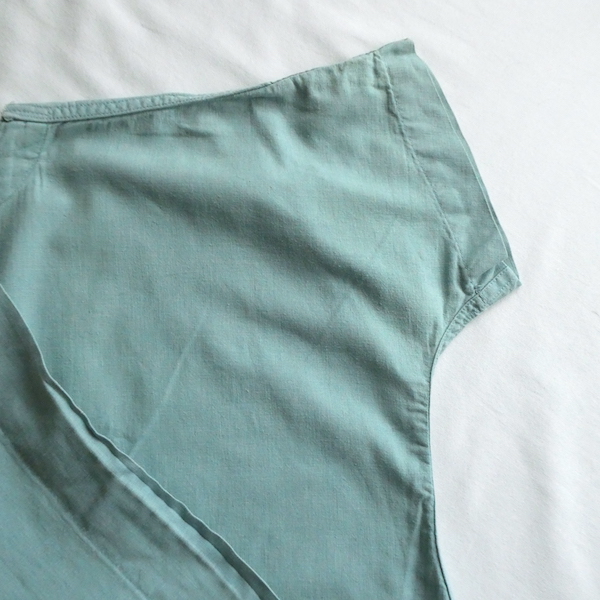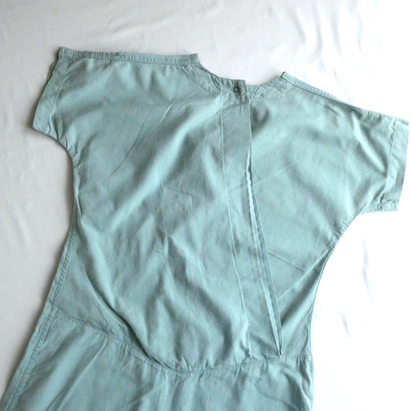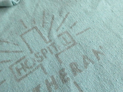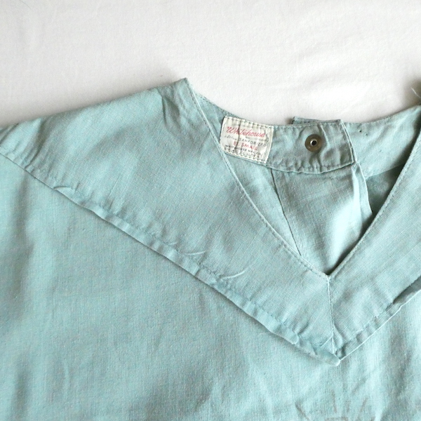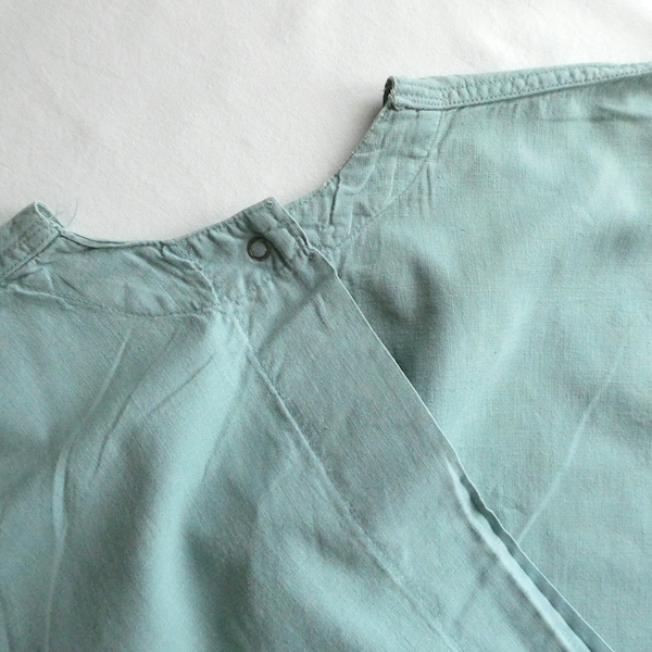 半袖のコットンワンピース。当時のナースユニフォームです。少しくすみのあるミントグリーンのコットン生地。教会系の病院のようで、胸元には十字架とルーテルホスピタルのステンシル。背中側にスナップボタンが付き、斜めに開きます(後ろ開きやカラー、つけ襟やカフスも無いのでオペ等用かもしれません)胸元のステンシルデザインとヴィンテージ感のある色味が可愛らしいアイテム。レイヤード等にも◎