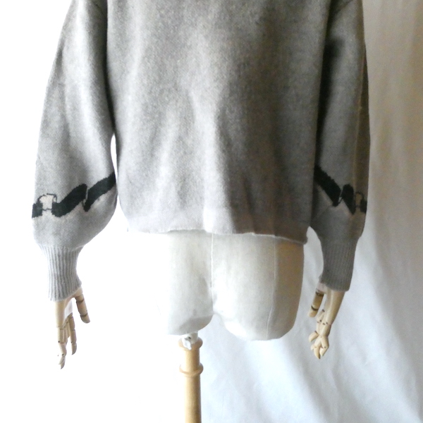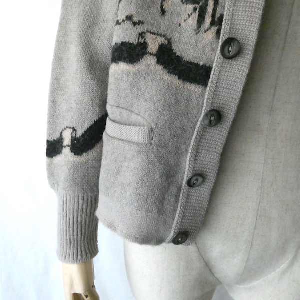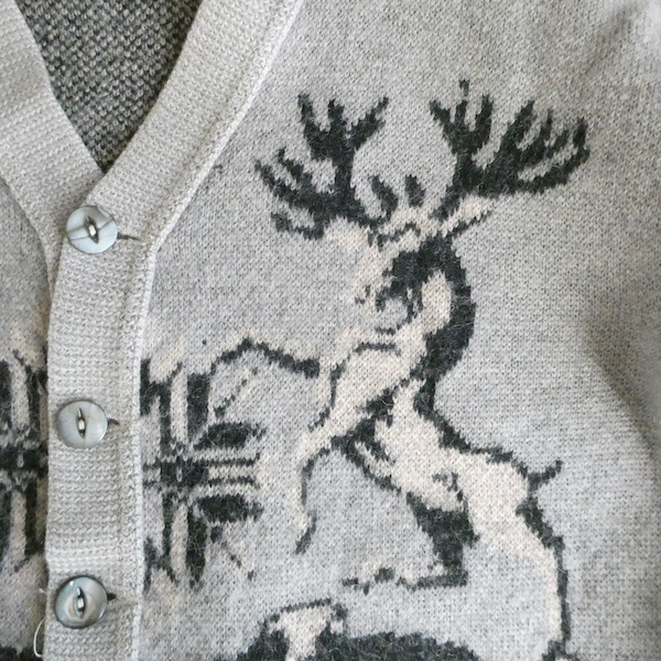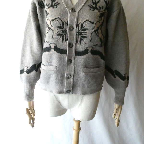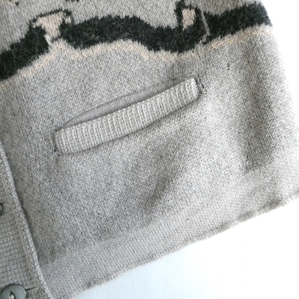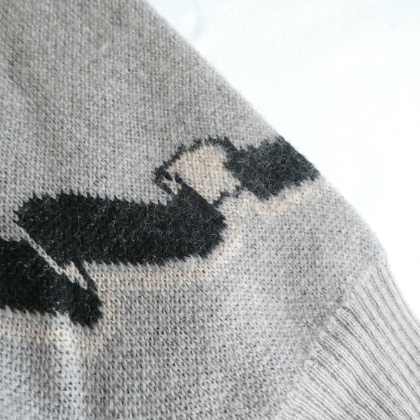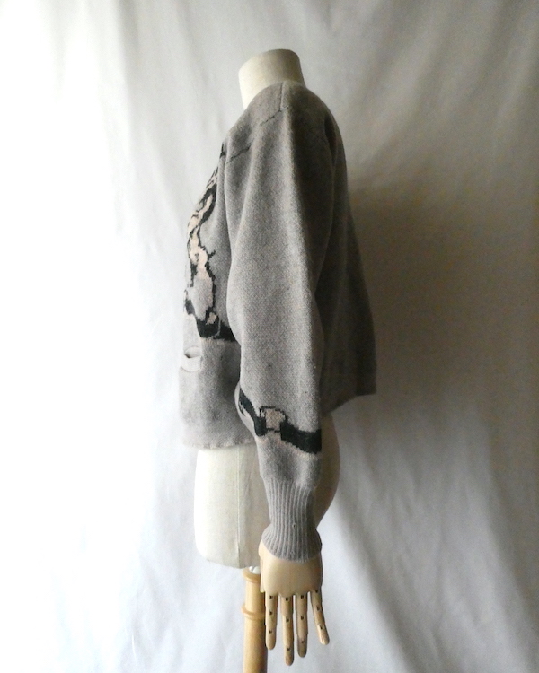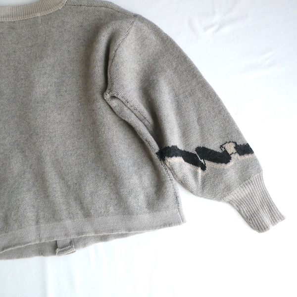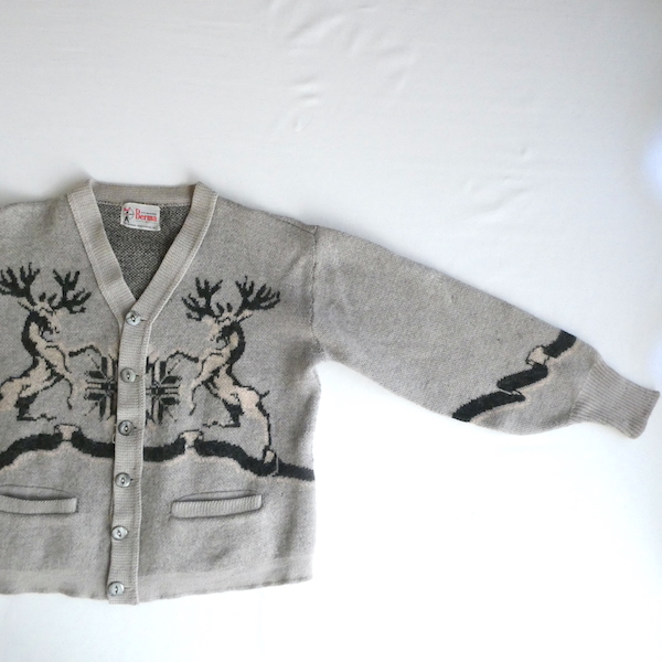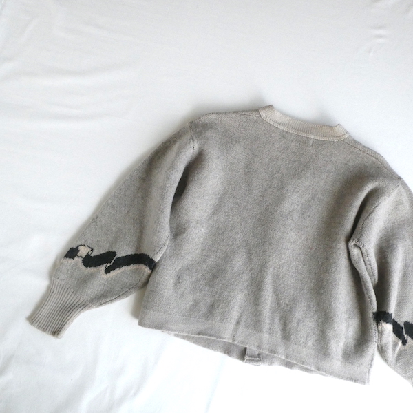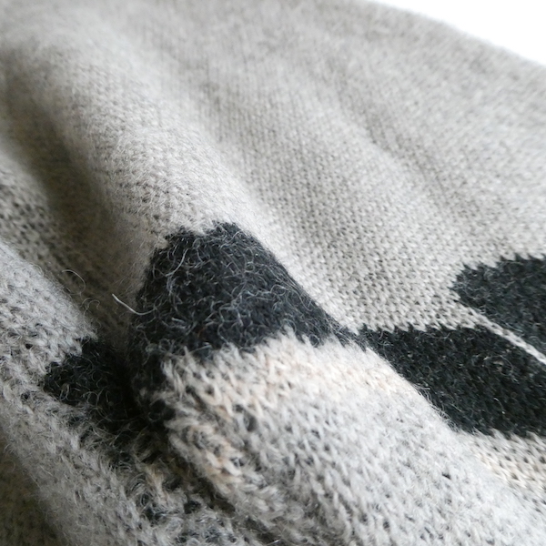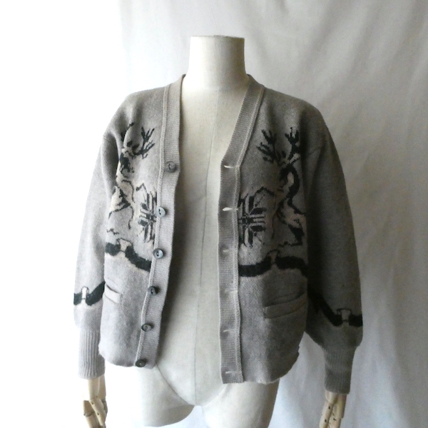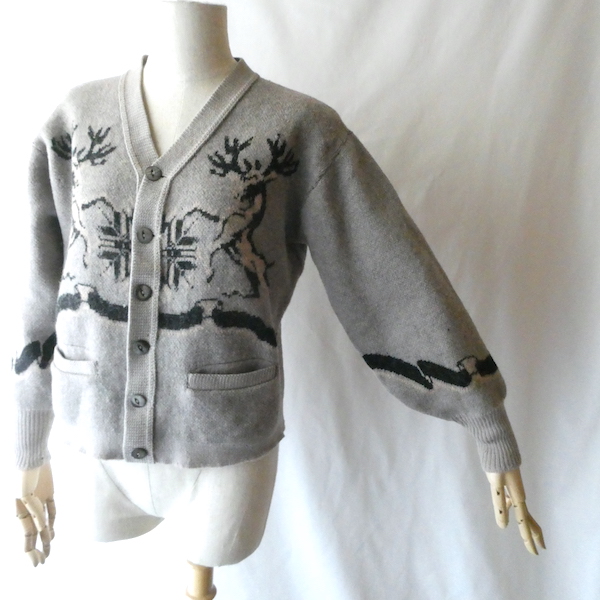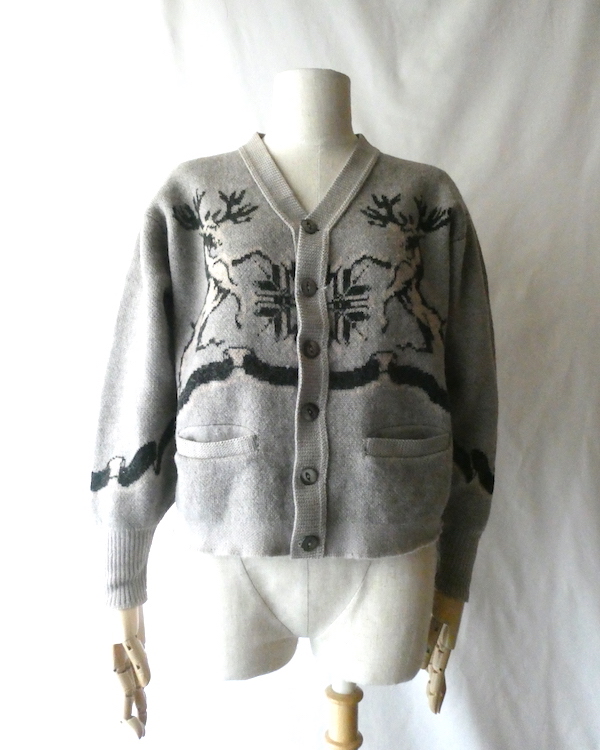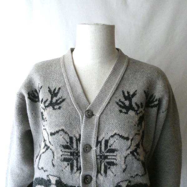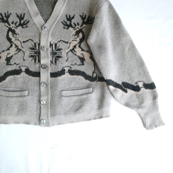 ライトグレーのジャガードニットカーディガンです。むぎゅっと厚手のジャガードニット生地。ライトグレー・薄いピンクグレー、黒の3色。フロントにはヘラジカと雪の結晶柄。見頃からアームにかけて繋がるようにリボンのラインが入ります。ショート丈で合わせもレディース。可愛らしい柄と色味でいかつくならない雪柄ジャガードです。