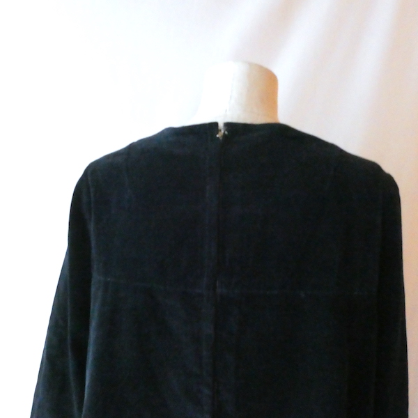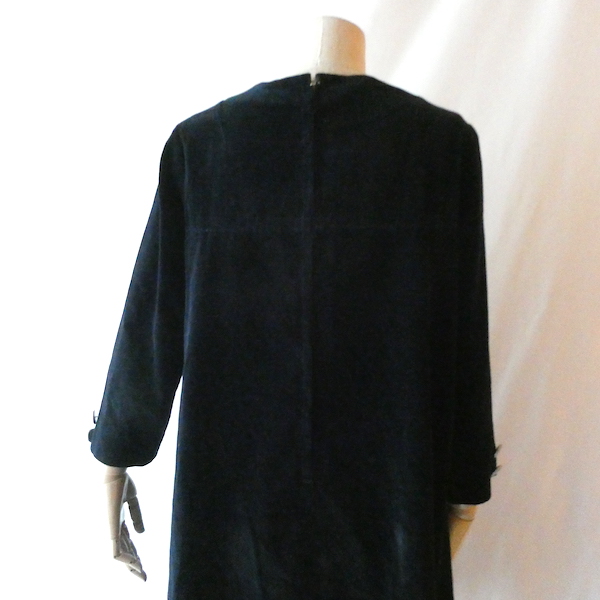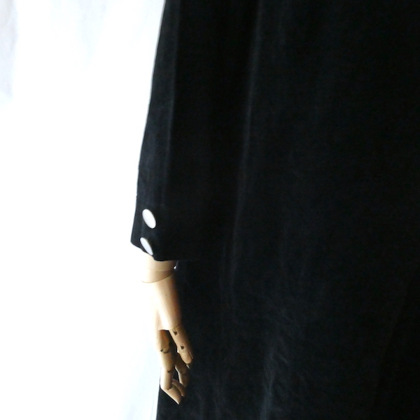 ベロアの長袖ワンピースです。光沢のあるブラックベロアにシルバーの飾りボタン。胸からAラインに広がる可愛らしいアイテムです。膝丈くらいでチュニックとしても使い易い丈感です。カジュアルにも華やかな席にもどちらにも使えて便利な一枚。