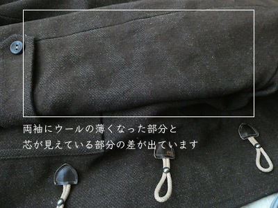 ダークブラウンのウールダッフルコートです。しっかり肉厚な生地に、裏地は薄手のボア。裏ボア生地は焦茶・オフホワイト・ベージュの3色切り替え。アーム裏地はキルティングで内側の袖口にリブ付き。トグルボタンの内側はジップも付いて防寒性バッチリのアイテムです。少し身幅広めで膝上くらいのハーフコート丈。大きめ襟の可愛らしいアイテムです。