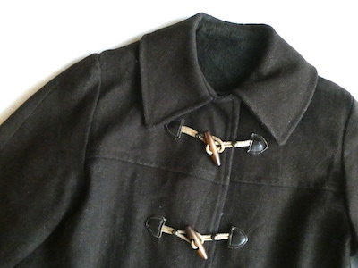 ダークブラウンのウールダッフルコートです。しっかり肉厚な生地に、裏地は薄手のボア。裏ボア生地は焦茶・オフホワイト・ベージュの3色切り替え。アーム裏地はキルティングで内側の袖口にリブ付き。トグルボタンの内側はジップも付いて防寒性バッチリのアイテムです。少し身幅広めで膝上くらいのハーフコート丈。大きめ襟の可愛らしいアイテムです。
