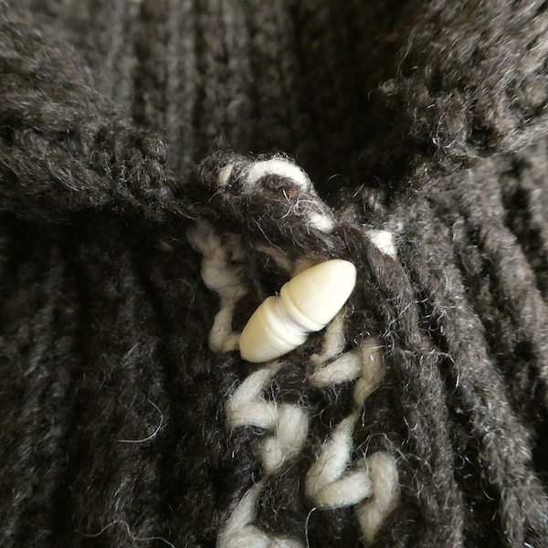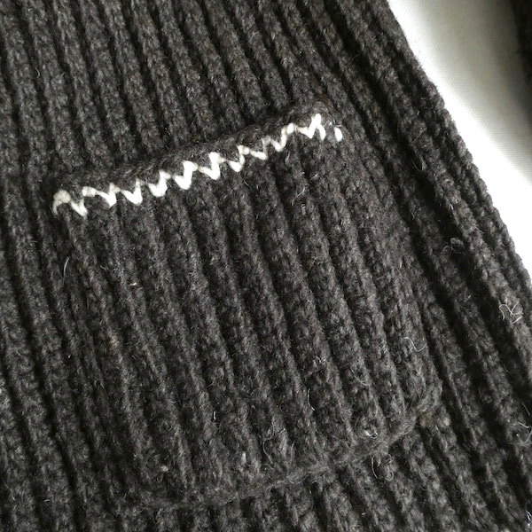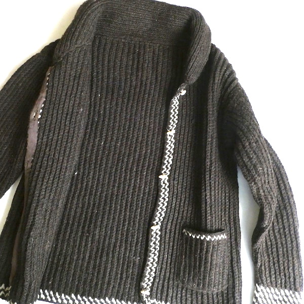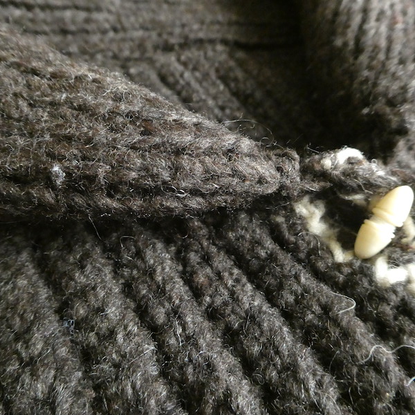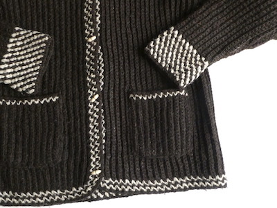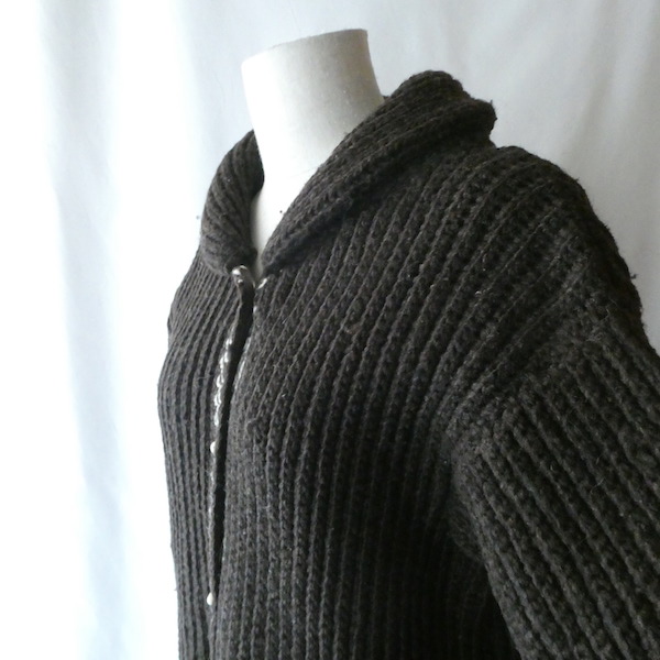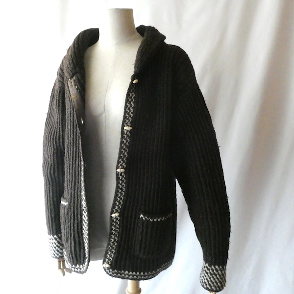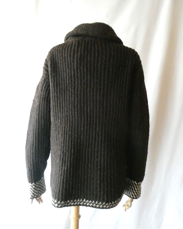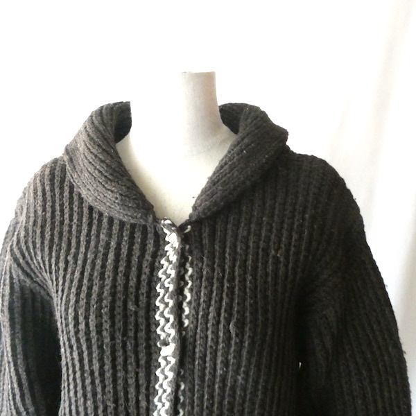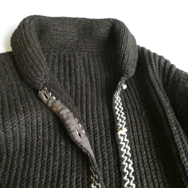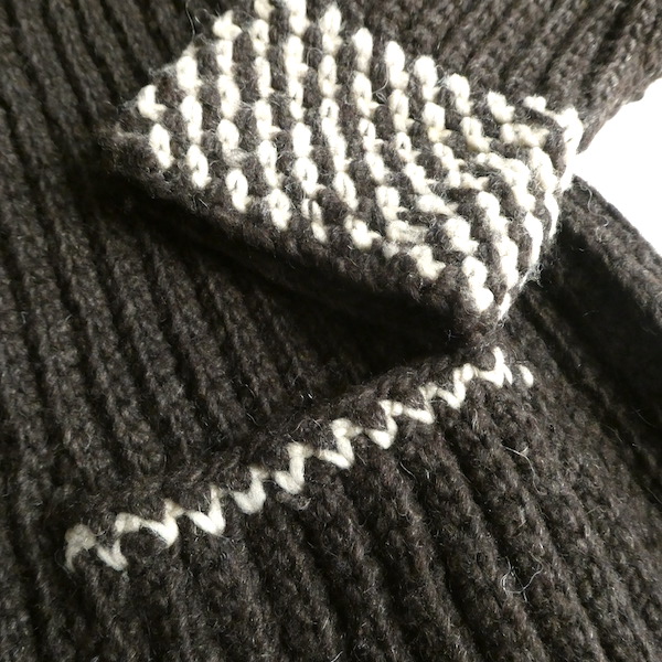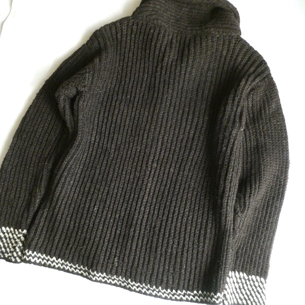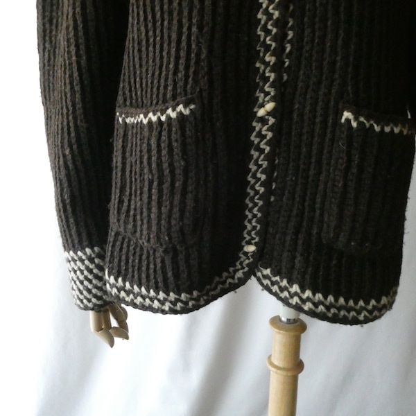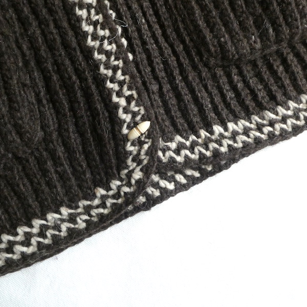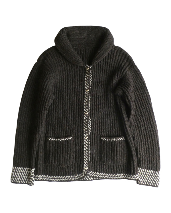 厚手の襟付きニットカーディガンです。ダークブラウンの肉厚なニット生地。ショールカラーに小さなトグル型のプラスチックボタンが付きます。裾や袖口の白いラインも◎。カウチン程では無いですが、脱脂少なめのしっかりしたニット生地でアウター感覚でもお使いいただけそう。ポケットもしっかり付きます。