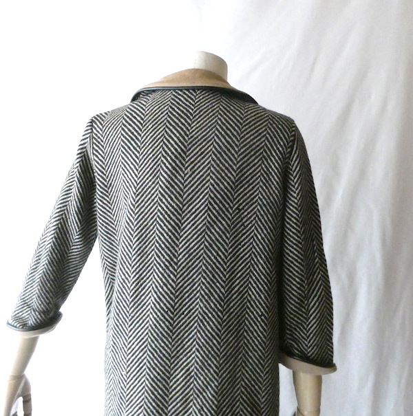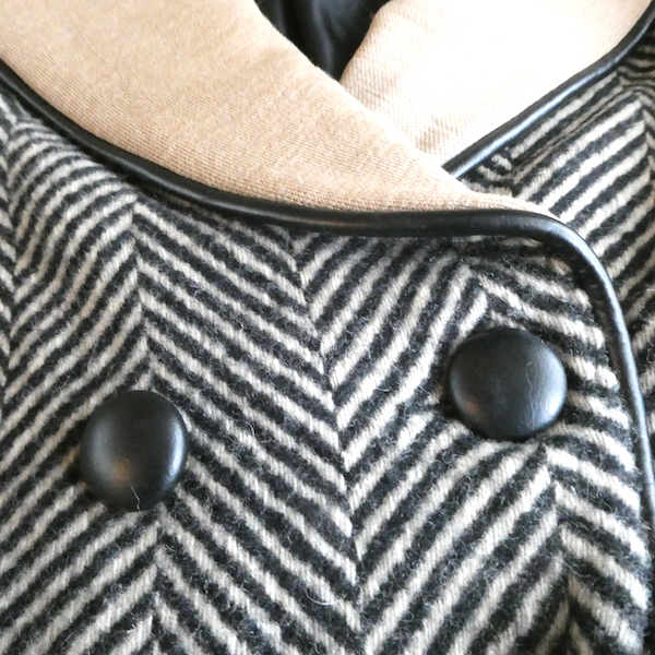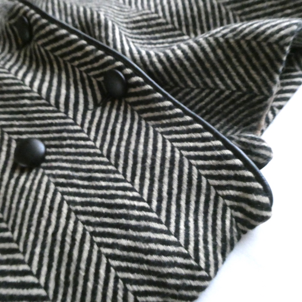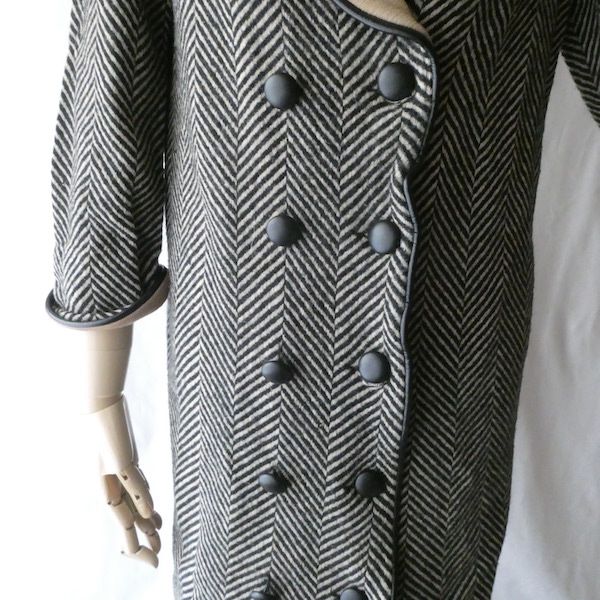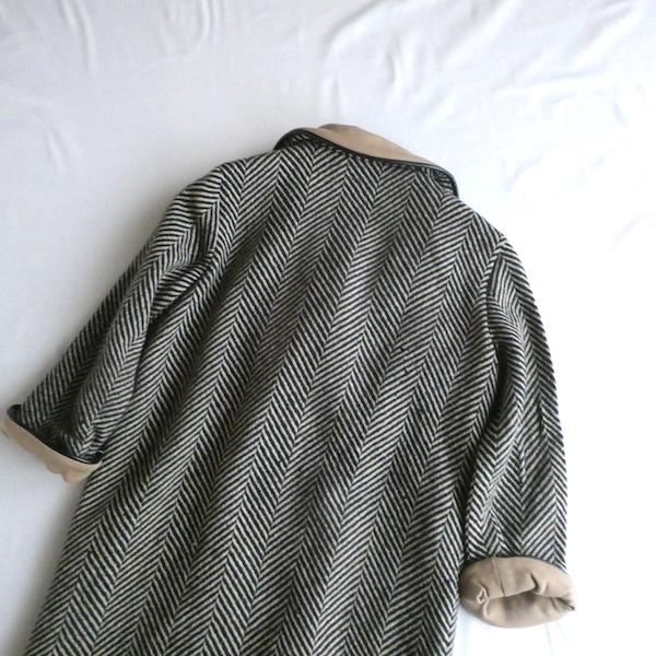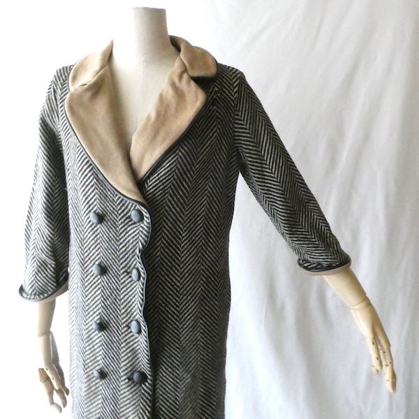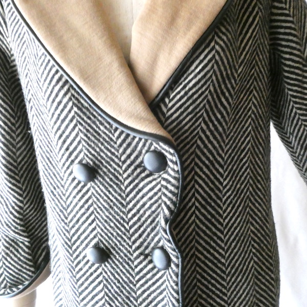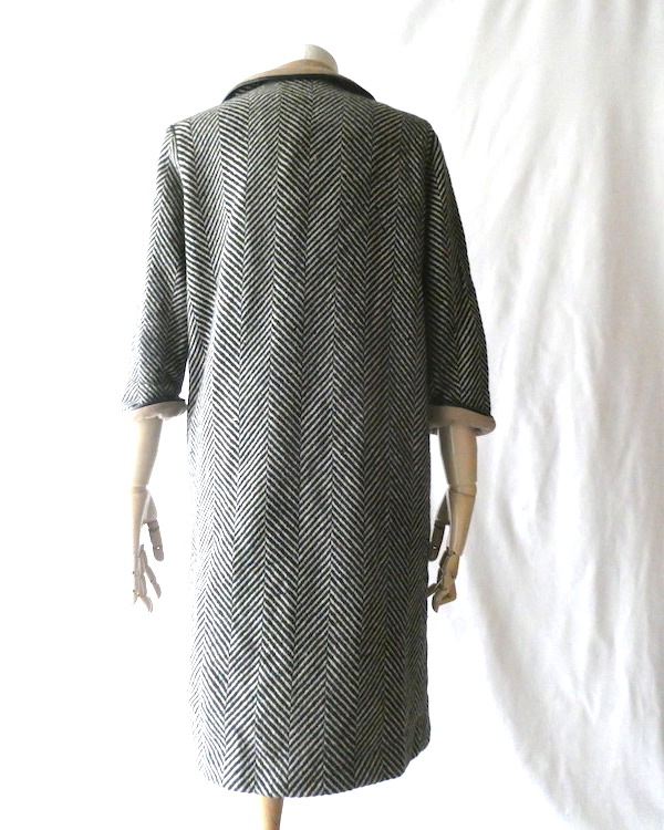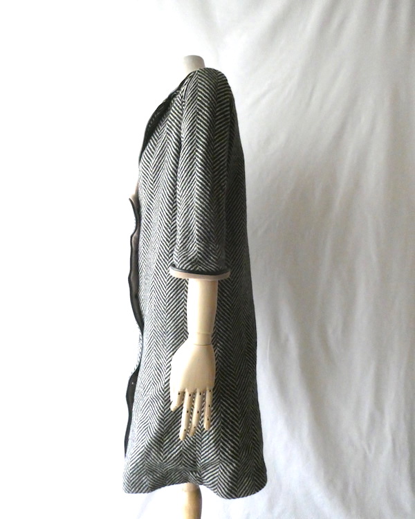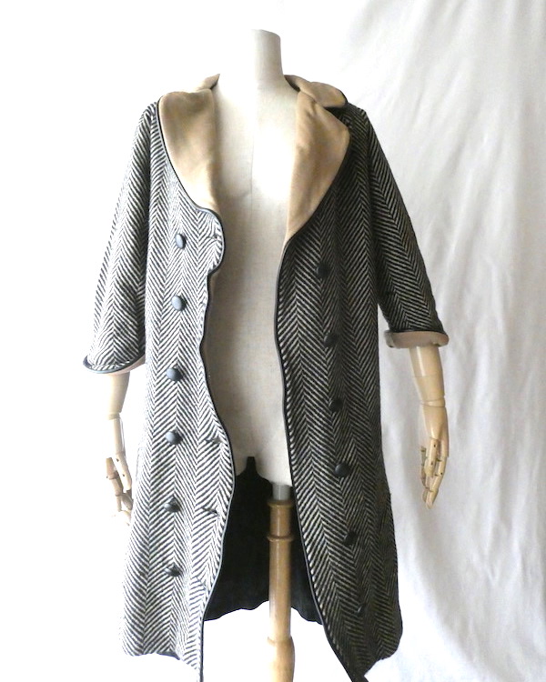 ヘリンボーンのダブルコート。かなり細身でタイトなシルエットで。ダブルのロングジャケットのようなスタイルです(一枚でワンピースとしても)。白黒のキリッと大きめのヘリンボーン。襟と見返しやカフス部分はベージュ。縁には黒いフェイクレザーのパイピングが付きます。パイピングの固さによるうねうね感もポイント。フェイクレザーのボタンも全て揃っていますが、全体的にウール削れ等が多々あるのでダメージ画像でご確認ください。