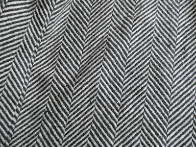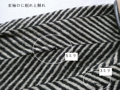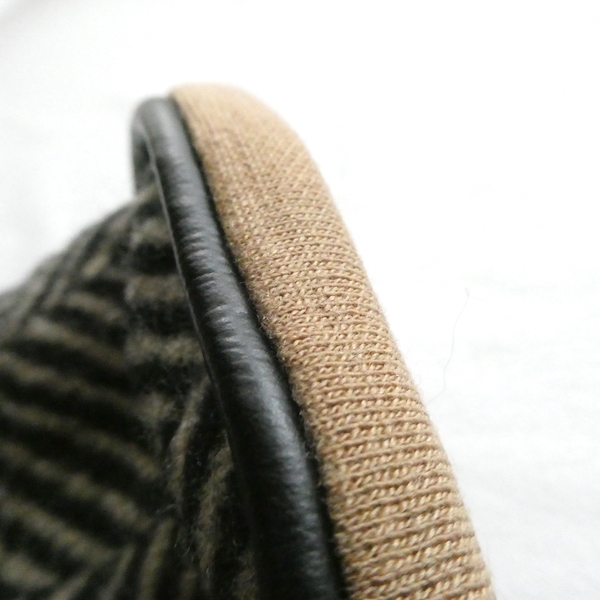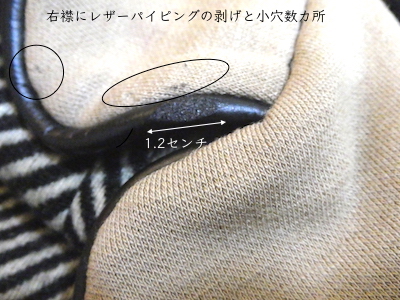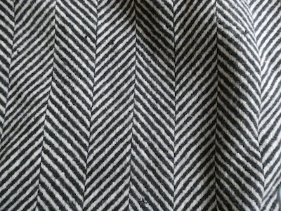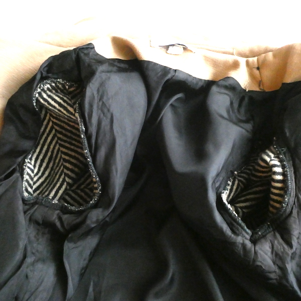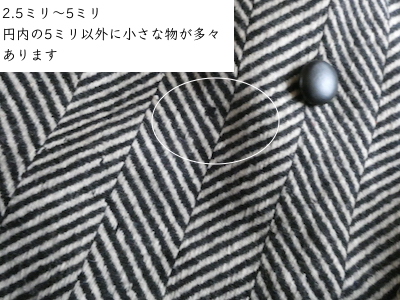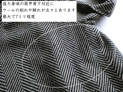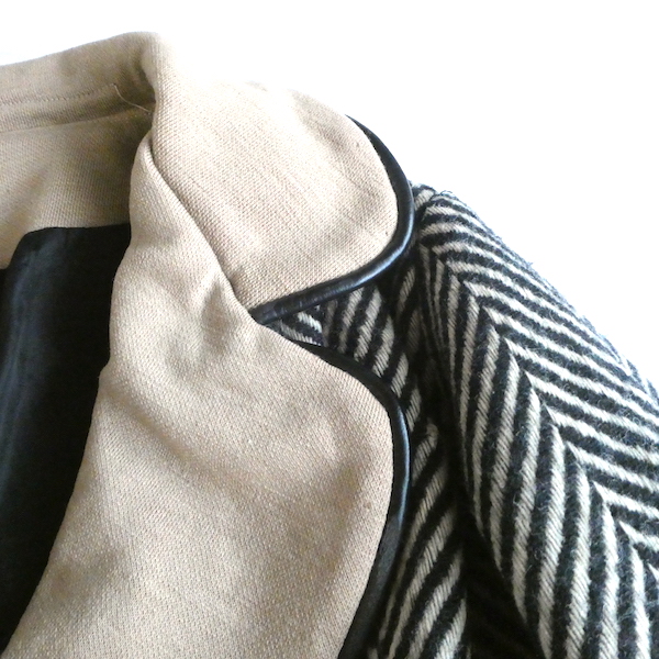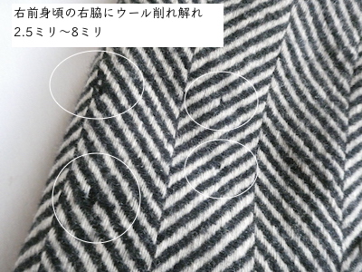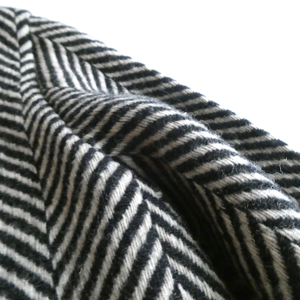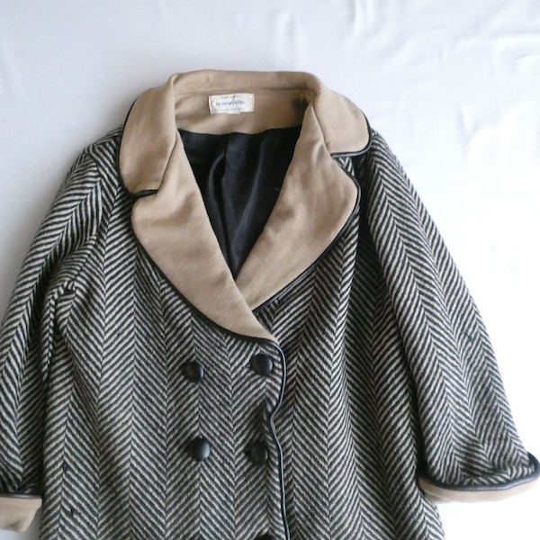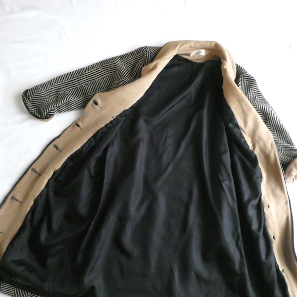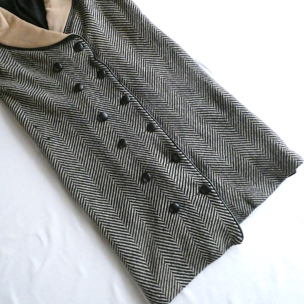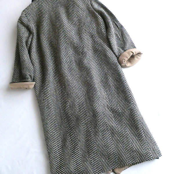 ヘリンボーンのダブルコート。かなり細身でタイトなシルエットで。ダブルのロングジャケットのようなスタイルです(一枚でワンピースとしても)。白黒のキリッと大きめのヘリンボーン。襟と見返しやカフス部分はベージュ。縁には黒いフェイクレザーのパイピングが付きます。パイピングの固さによるうねうね感もポイント。フェイクレザーのボタンも全て揃っていますが、全体的にウール削れ等が多々あるのでダメージ画像でご確認ください。