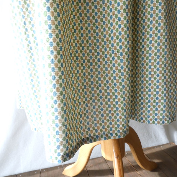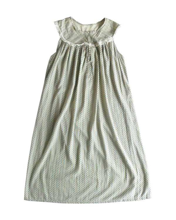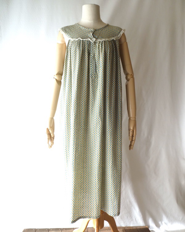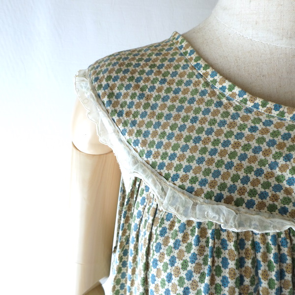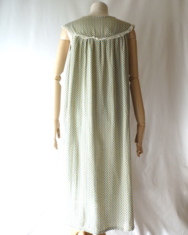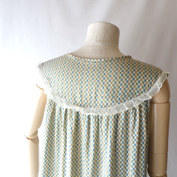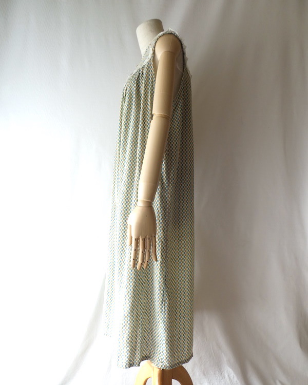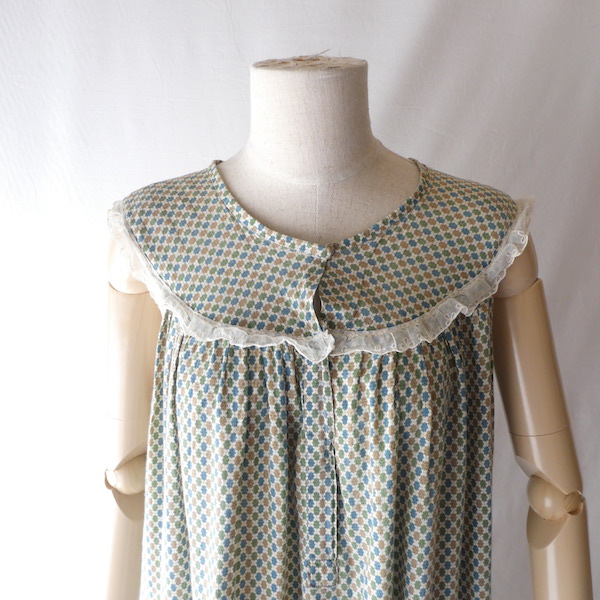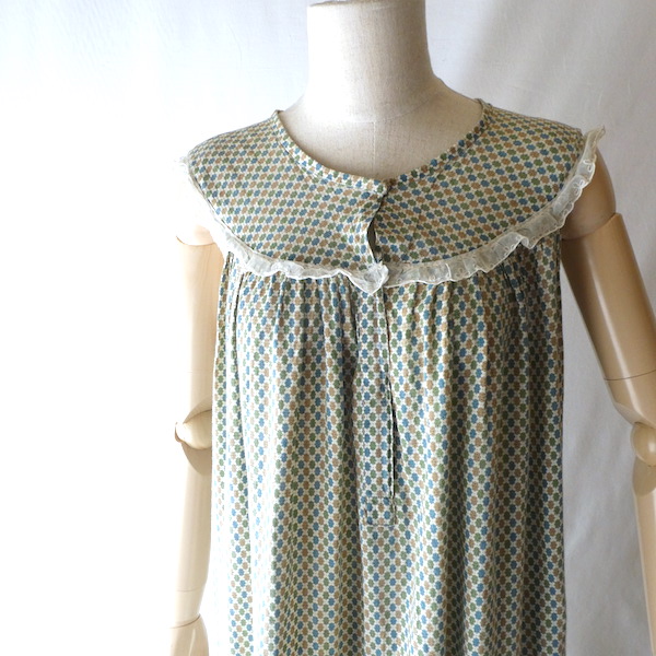 ゆるんと柔らかな素材のワンピースです。グリーン・ブルー・マスタード3色の小さな小紋柄。胸ヨークの端には、ナイロンレースのトリムが付きます。当時のナイティー系のアイテムで、生地もすべっと柔らか。ウエストの絞りもなくリラックス出来る着心地です。チュニックとしてパンツの上にも。
