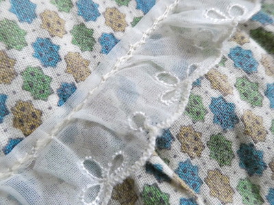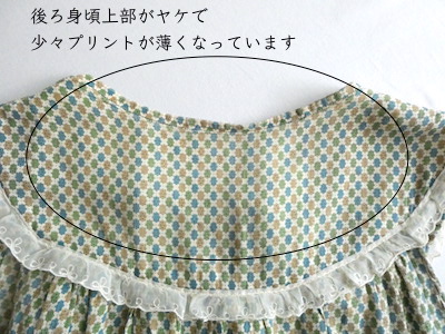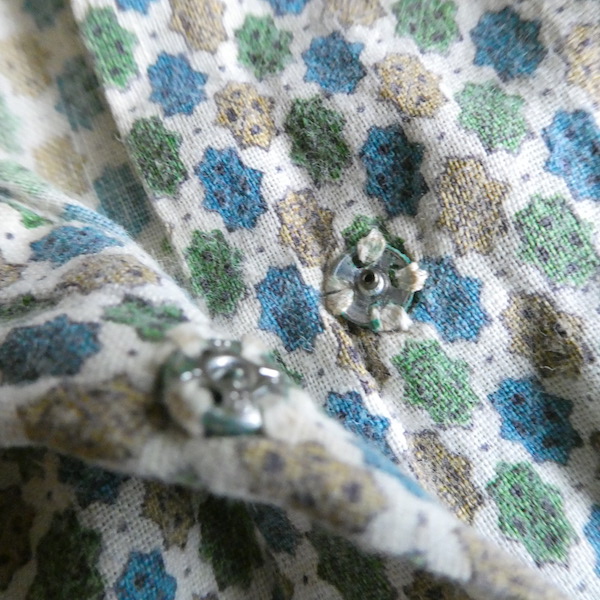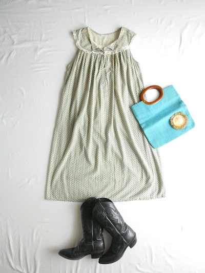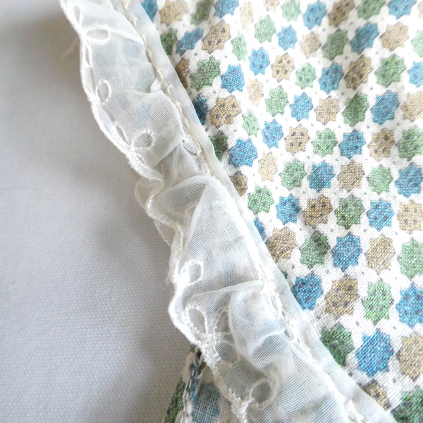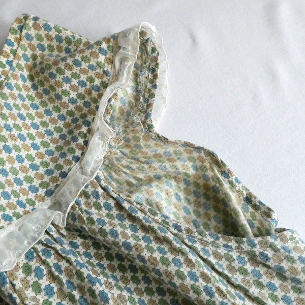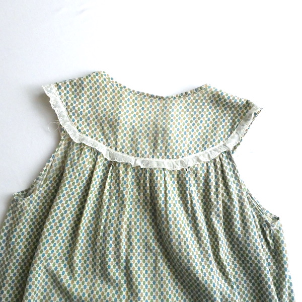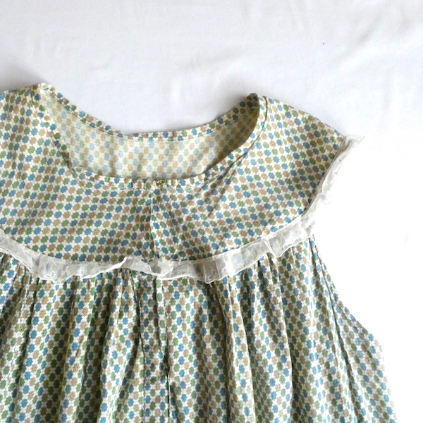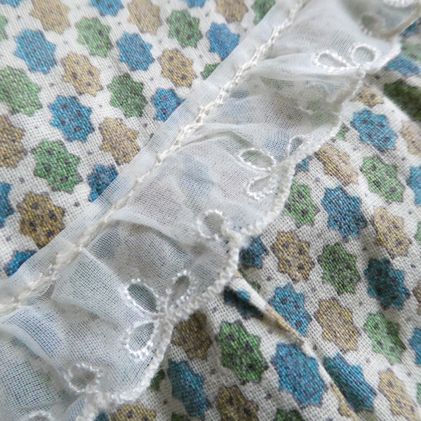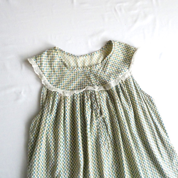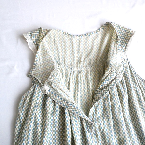 ゆるんと柔らかな素材のワンピースです。グリーン・ブルー・マスタード3色の小さな小紋柄。胸ヨークの端には、ナイロンレースのトリムが付きます。当時のナイティー系のアイテムで、生地もすべっと柔らか。ウエストの絞りもなくリラックス出来る着心地です。チュニックとしてパンツの上にも。