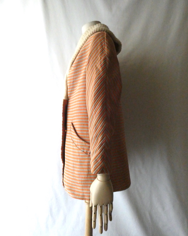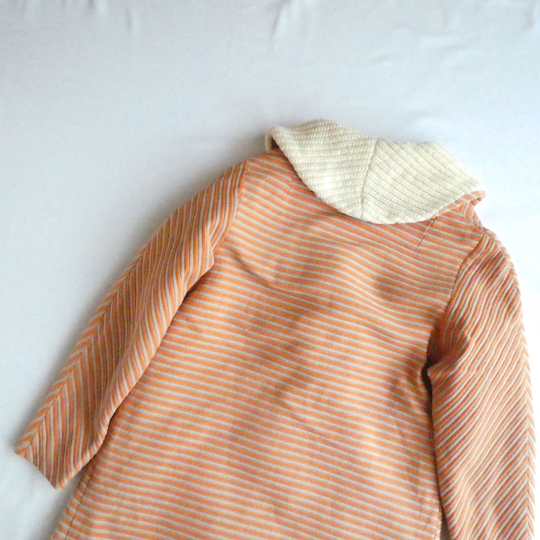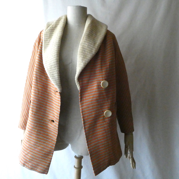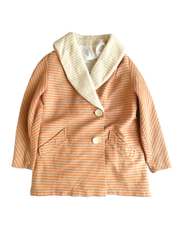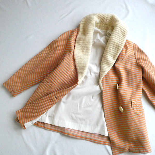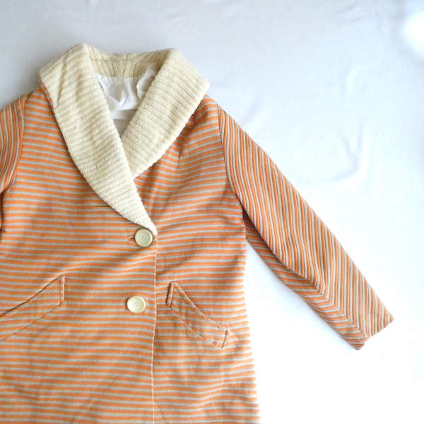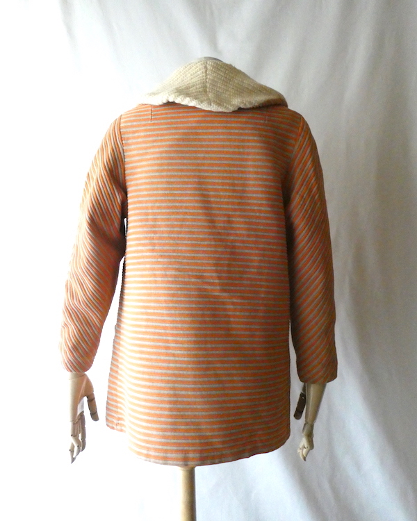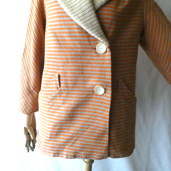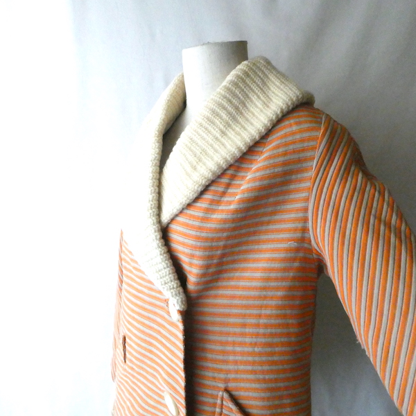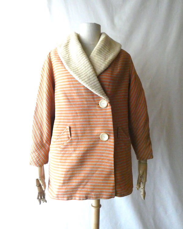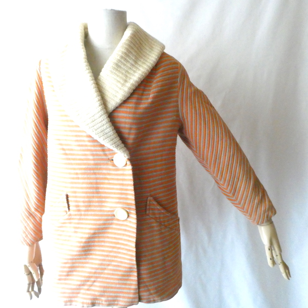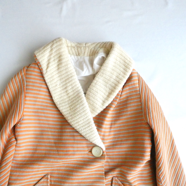 ニット襟のハーフコートです。ライトグレーとオレンジの細ボーダー。ショールカラーの表襟部分にはニット素材です。裏地が張り替えられているので、後年リペアの際に着丈もハーフに丈上げされているかもしれません。左サイドの大きなボタンも◎。可愛らしいお色で、重さも無く気軽に着られるヴィンテージコートです。