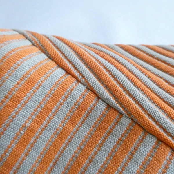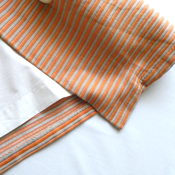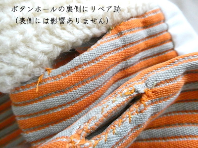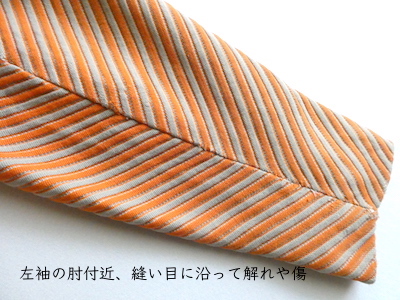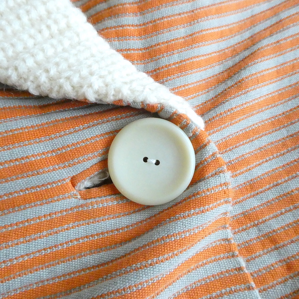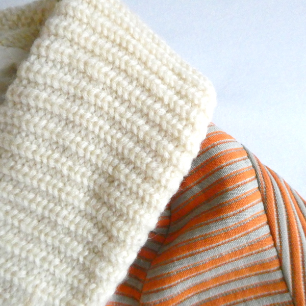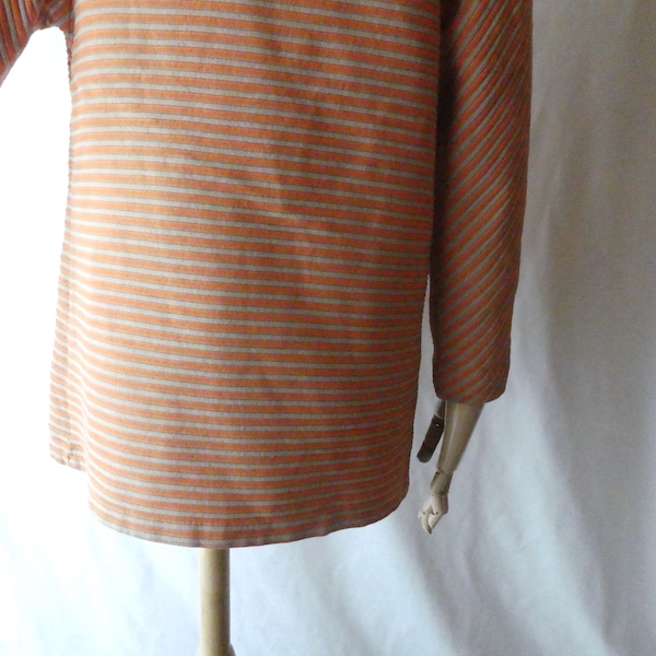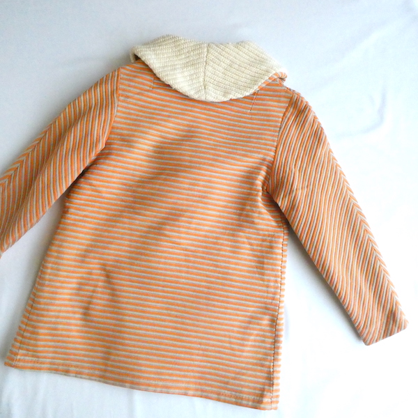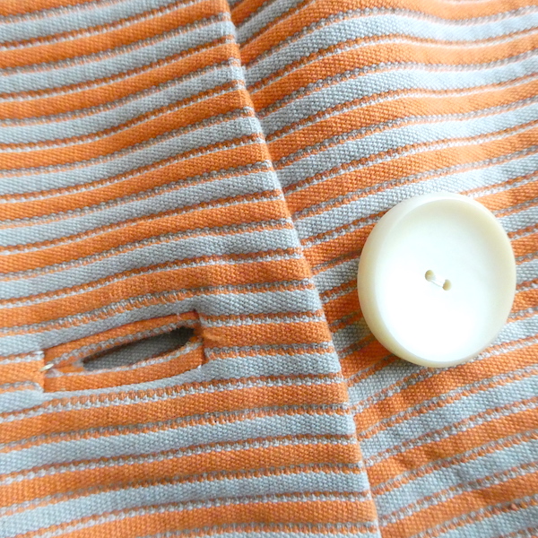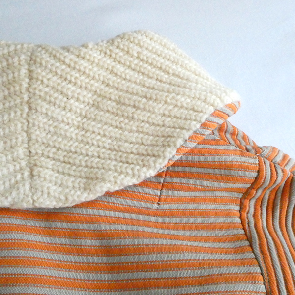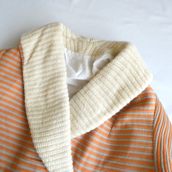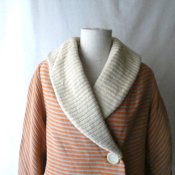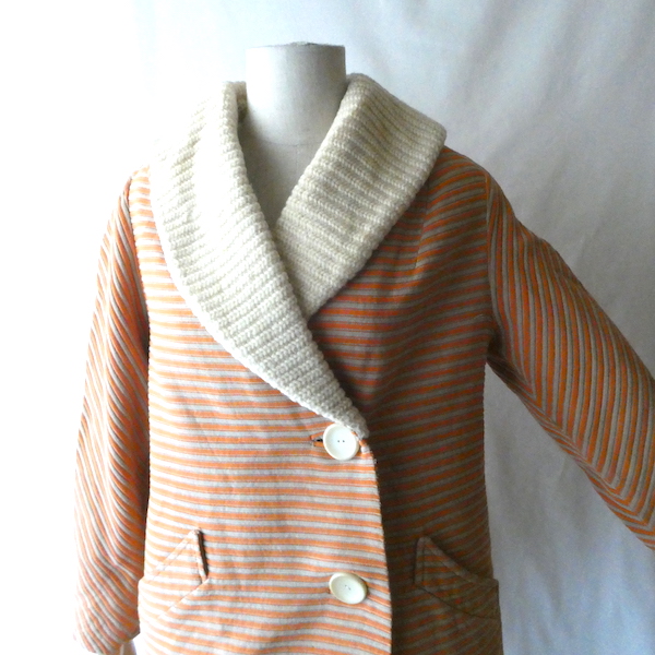ニット襟のハーフコートです。ライトグレーとオレンジの細ボーダー。ショールカラーの表襟部分にはニット素材です。裏地が張り替えられているので、後年リペアの際に着丈もハーフに丈上げされているかもしれません。左サイドの大きなボタンも◎。可愛らしいお色で、重さも無く気軽に着られるヴィンテージコートです。