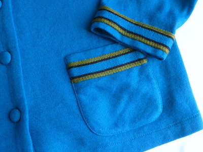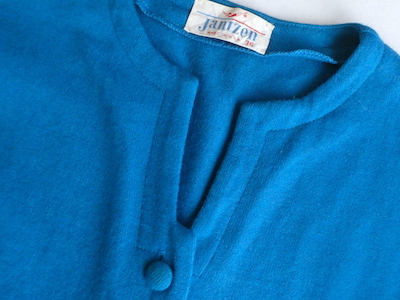 Jantzenのニットカーディガンです。鮮やかなブルーのハイゲージ。襟ぐりのラインが少し変わっていて、Vネックとクルーネックを合わせたような形。袖口とポケットにはモスグリーンとブラックラインのニットテープが付きます。チクチクしないスムースなハイゲージで長いシーズンをカバー出来る質感です。