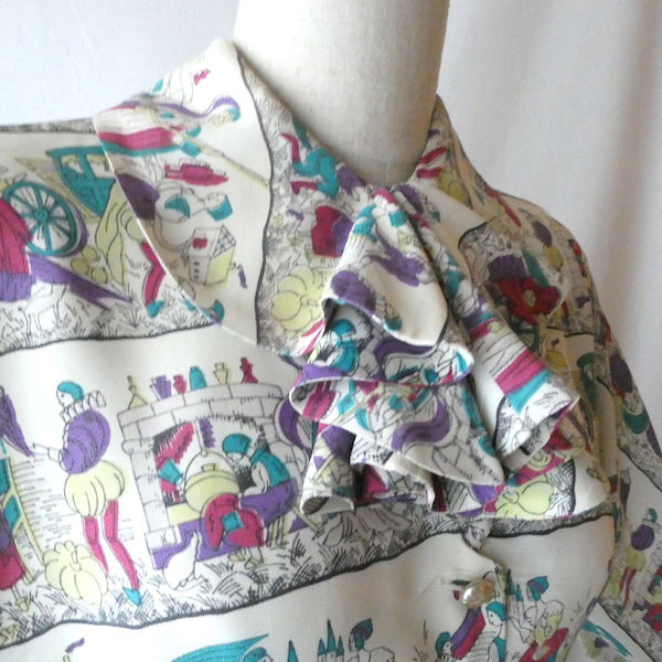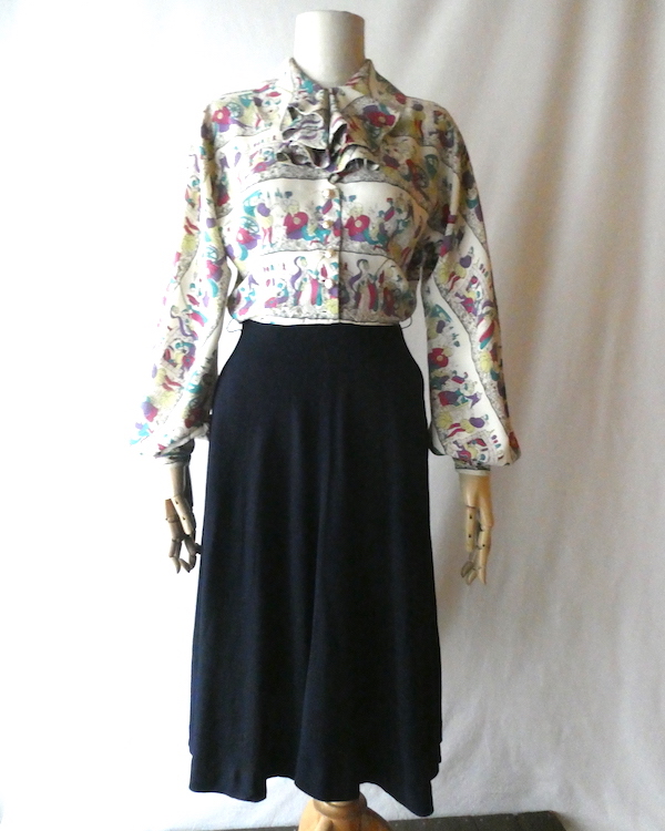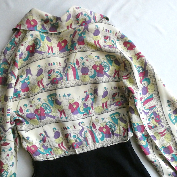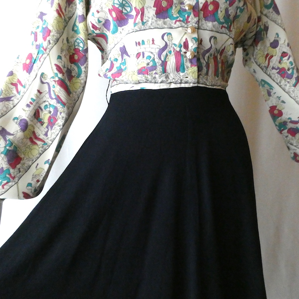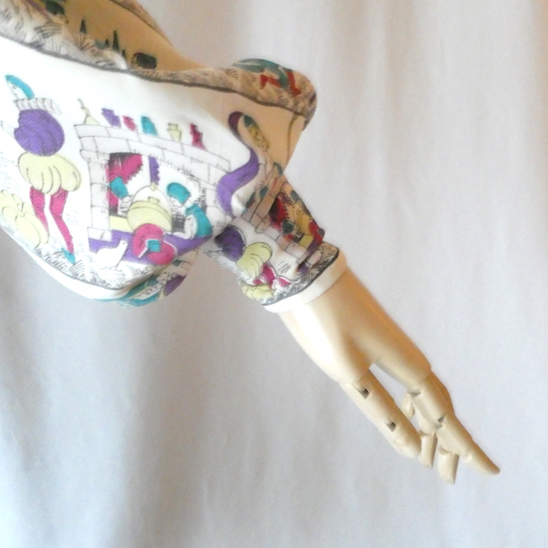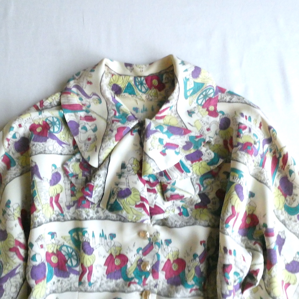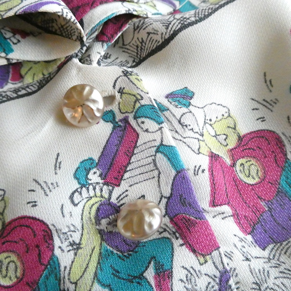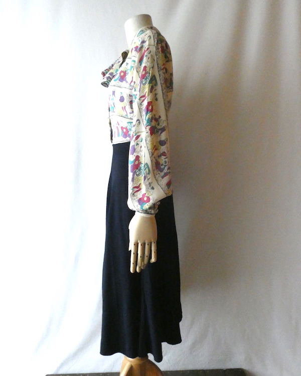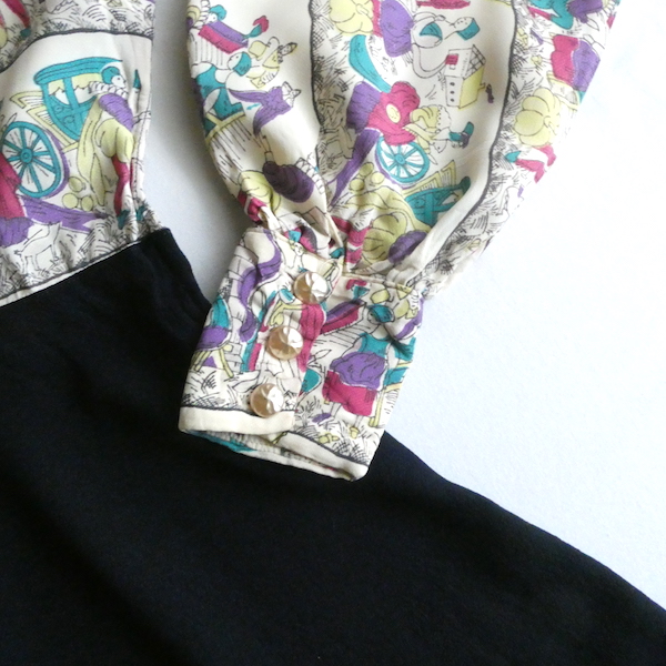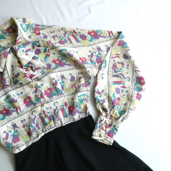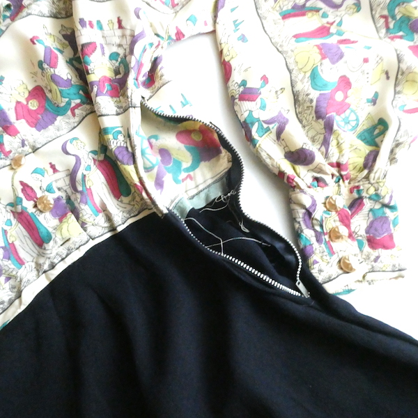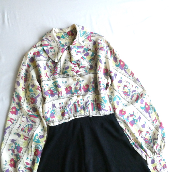 ゆるんとしたレーヨンのワンピース。トップス部分は白ベースの総柄、スカート部分はダークネイビー無地です。襟を留めるとラッフルになる作り。プリントは、かぼちゃに馬車に魔女等があるので、恐らくシンデレラがモチーフかと。プリントの配色とスカートのネイビーの合わせも◎。着るとふわっとパフスリーブになります。