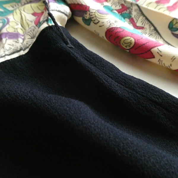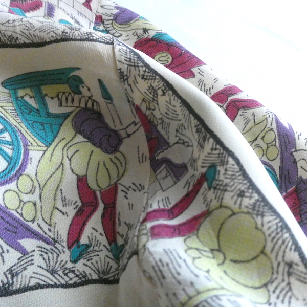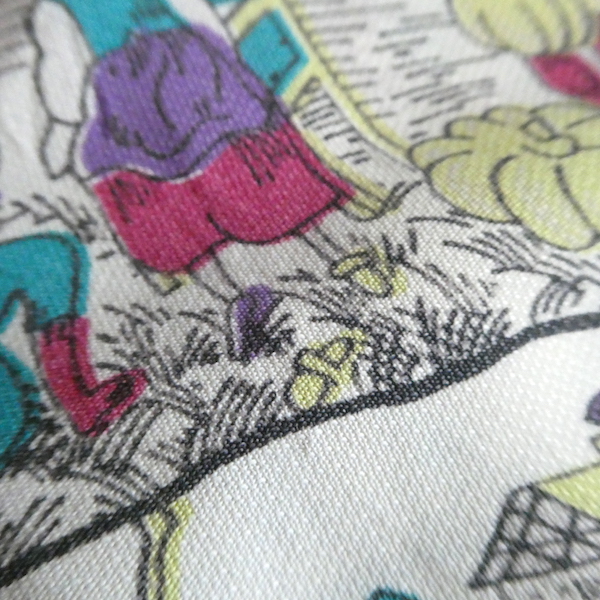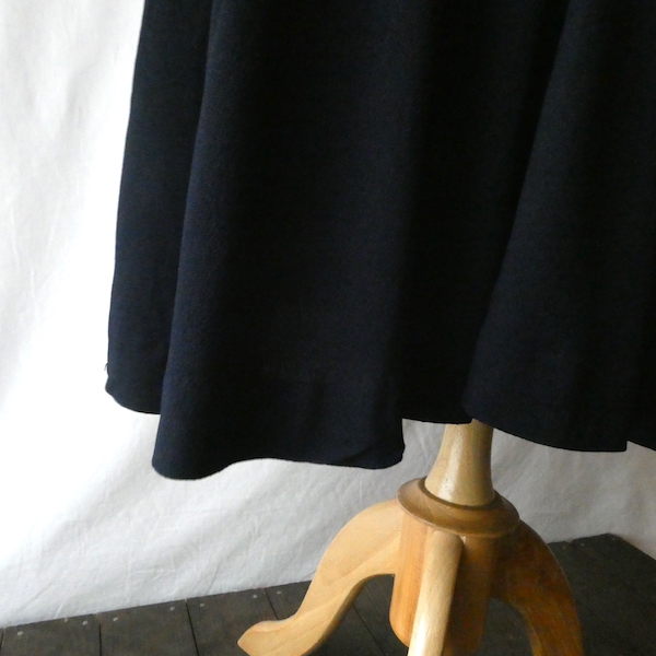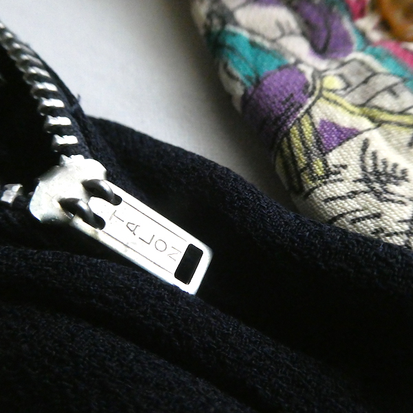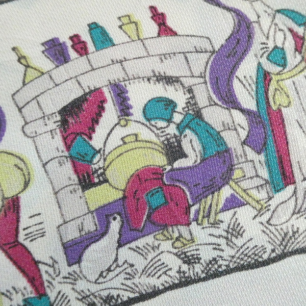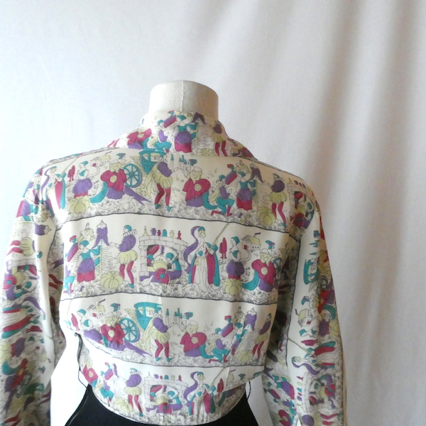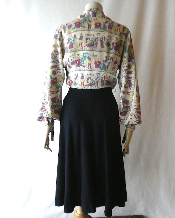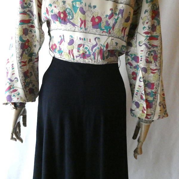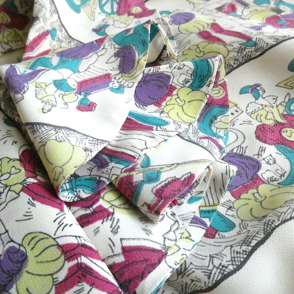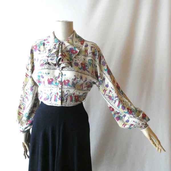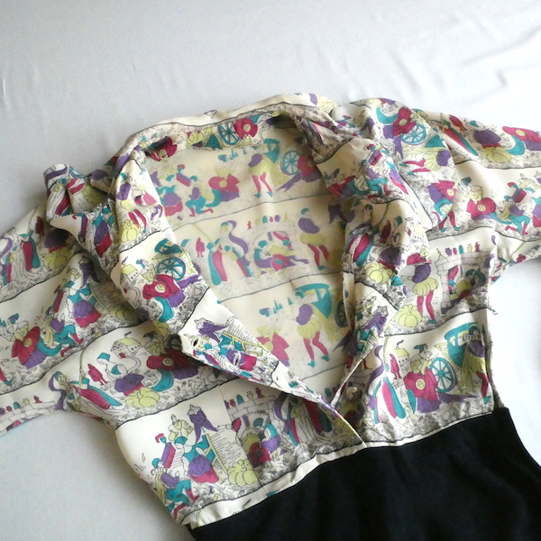 ゆるんとしたレーヨンのワンピース。トップス部分は白ベースの総柄、スカート部分はダークネイビー無地です。襟を留めるとラッフルになる作り。プリントは、かぼちゃに馬車に魔女等があるので、恐らくシンデレラがモチーフかと。プリントの配色とスカートのネイビーの合わせも◎。着るとふわっとパフスリーブになります。