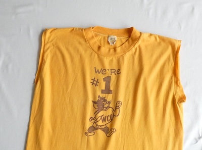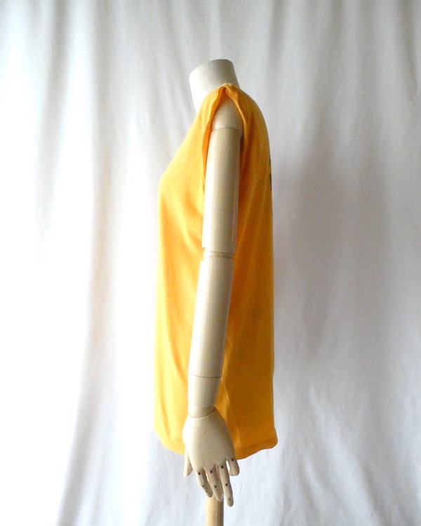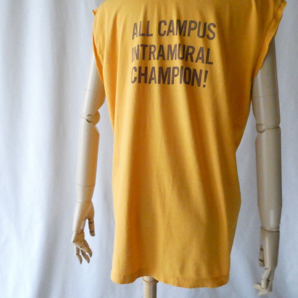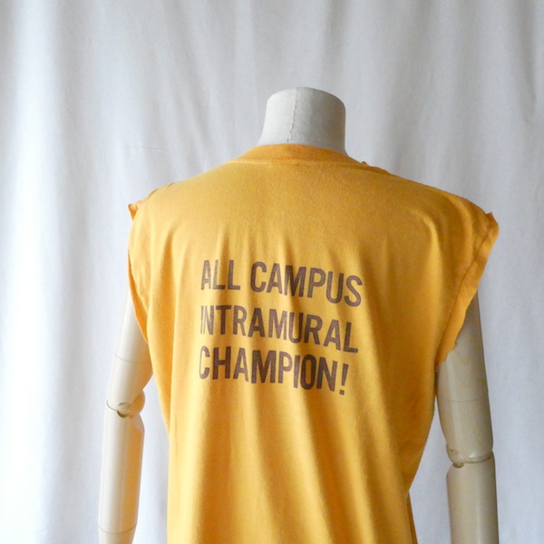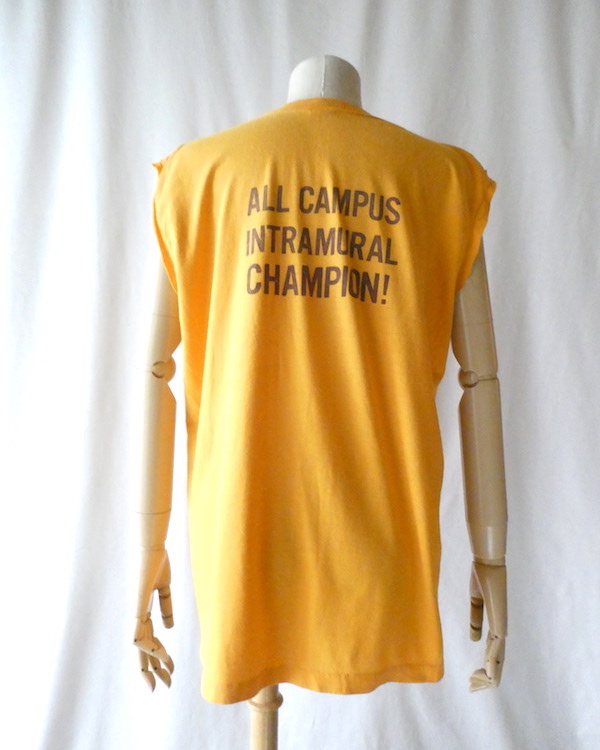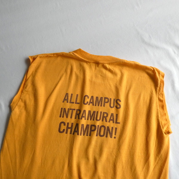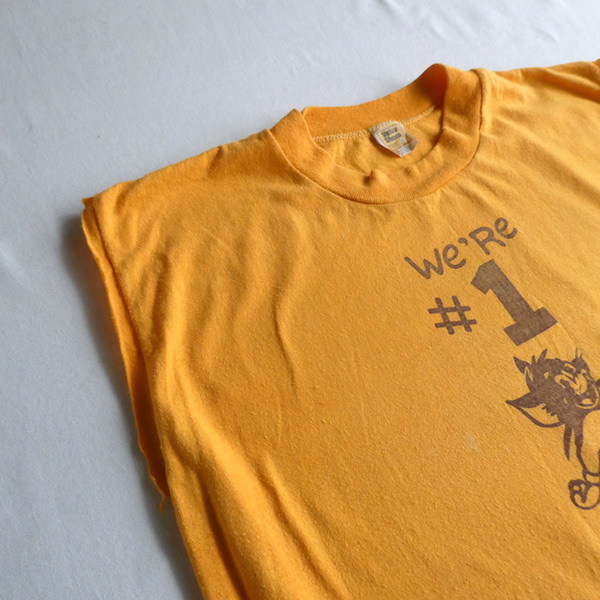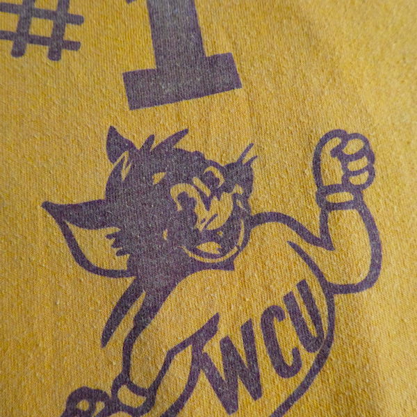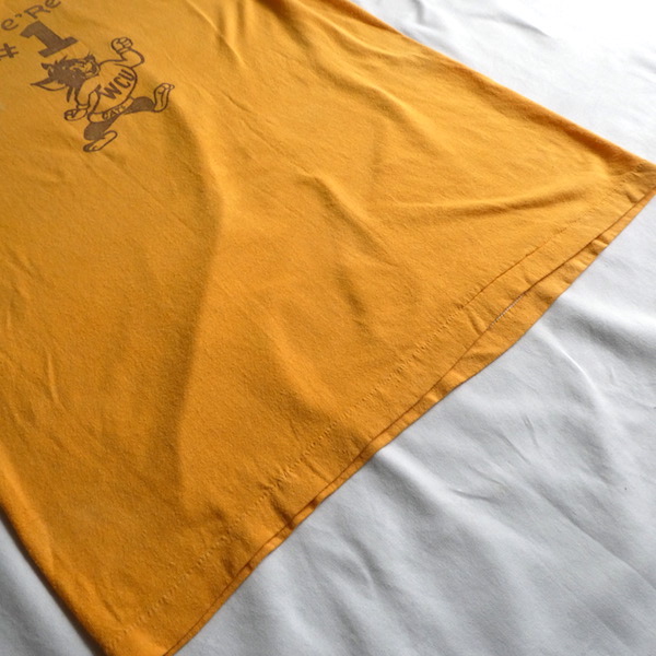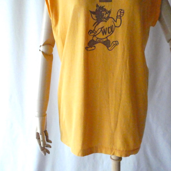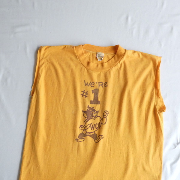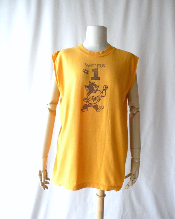 鮮やかなイエローのカットオフタンクです。ウエストカロライナ大主催の各種スポーツリーグがあるようで、何の競技かは分かりませんが、そちらの優勝チームのTシャツのようです。フロントに可愛らしい山猫ちゃんがプリントされています(恐らく元々は紫のプリントだったようですが、色落ちしてブラウンぽくなっています)カットオフの位置が少し独特ですが、着るとそこまで違和感ないですよ。