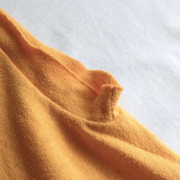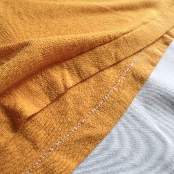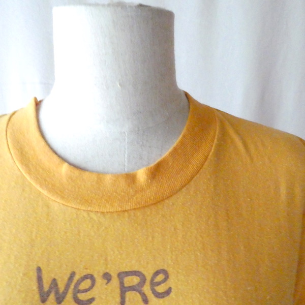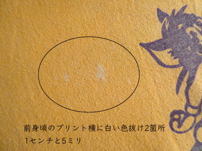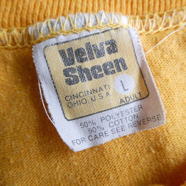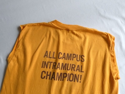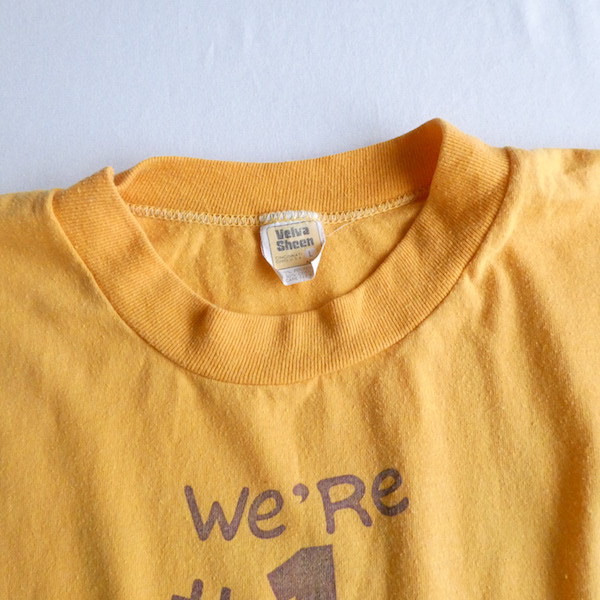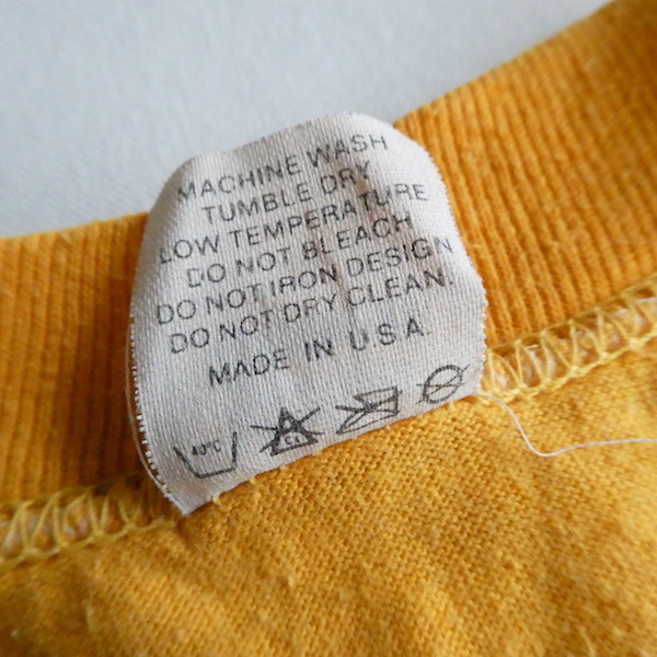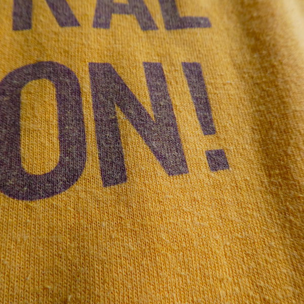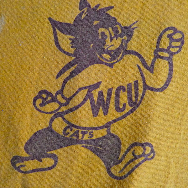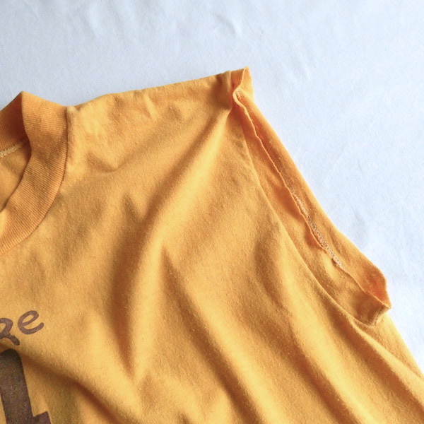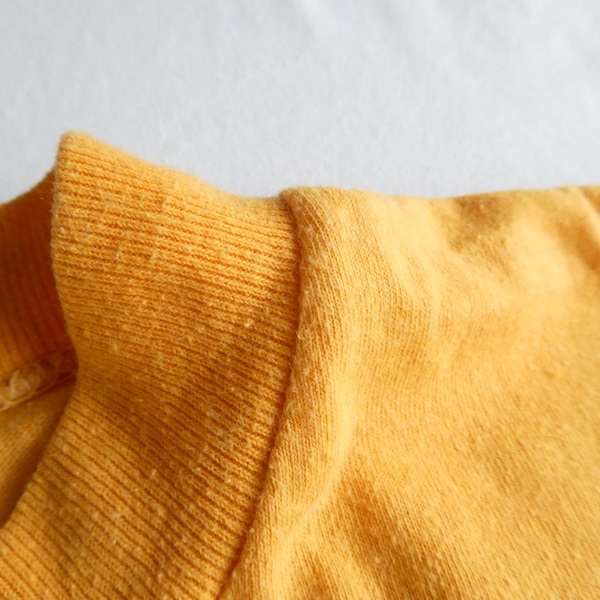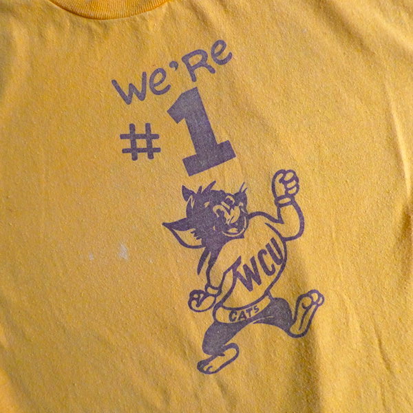 鮮やかなイエローのカットオフタンクです。ウエストカロライナ大主催の各種スポーツリーグがあるようで、何の競技かは分かりませんが、そちらの優勝チームのTシャツのようです。フロントに可愛らしい山猫ちゃんがプリントされています(恐らく元々は紫のプリントだったようですが、色落ちしてブラウンぽくなっています)カットオフの位置が少し独特ですが、着るとそこまで違和感ないですよ。
