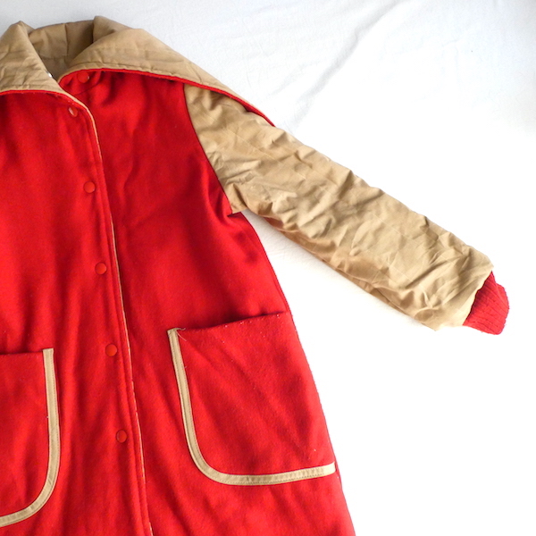 リバーシブルのハーフコートです。ベージュのキルティング面と赤いウール面の両面で使えます。どちらの面もポケットパイピングやスナップボタン等、赤×ベージュのバランスが良いので、捨て面無しのアイテム。フード部分のスナップボタンの留め方で襟の形が変えらるので、お好みで。70年代のアイテムでアームホールが細めデザインです。(ウール・キルティングで少し肉厚なので、実寸表記より若干小さめのサイズでお考えください。元々小さめサイズです)