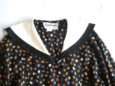 セーラーカラーの長袖ワンピースです。ゆるんと落ち感のある薄手レーヨンのロング丈。黒いトリムが付いたセーラーカラーが付きます。ブラックベースに落ち着いたブラウン〜グレーの変形ドット柄。襟の黒いトリムのお陰で、子供っぽくなり過ぎず、大人が着れるセーラーカラーワンピです。