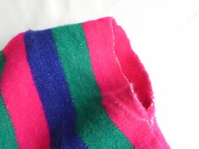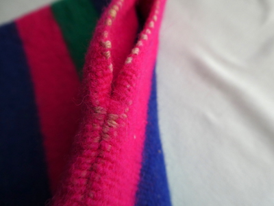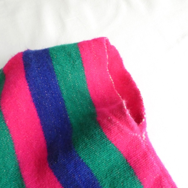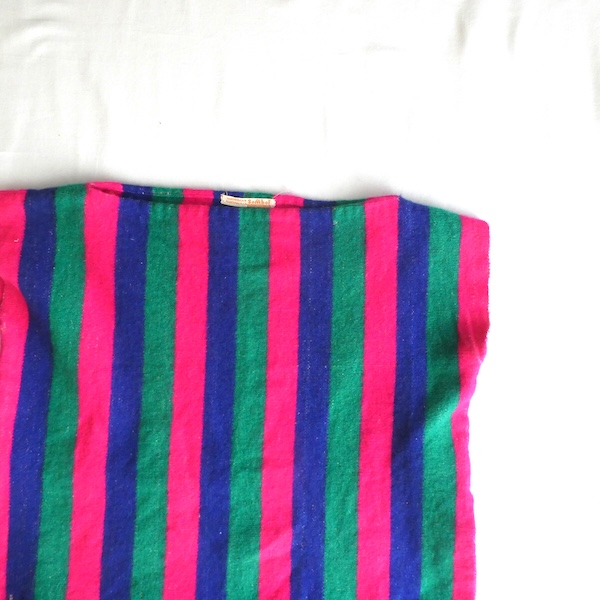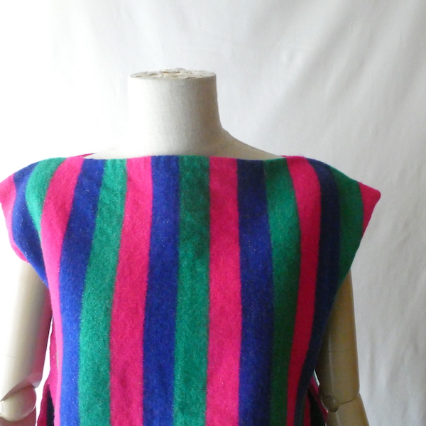 ウールラグ生地のプルオーバートップスです。ピンク・グリーン・ブルーの3色ストライプ。裾には短めのフリンジが付きます。アームホール等、比較的小さめ。アウターのインナーにも入れ易く、ベスト感覚でお使いいただけます。パッと明るくビビッドなカラーで、冬のレイヤードのポイントになりそうな一枚。