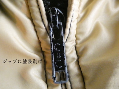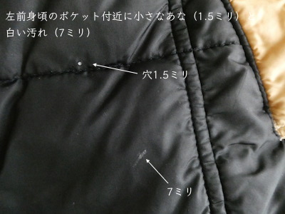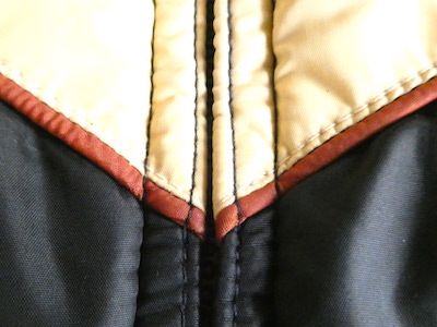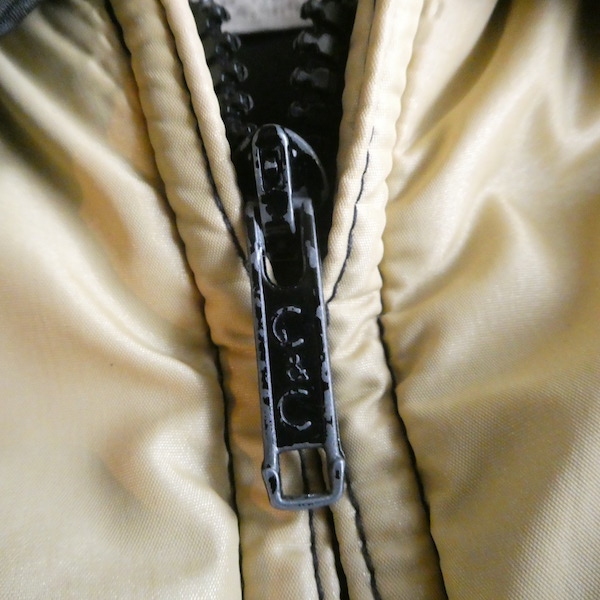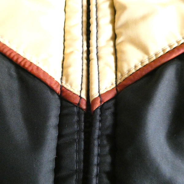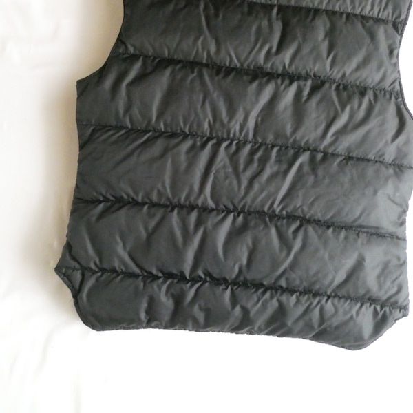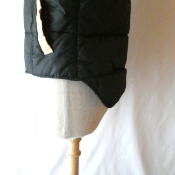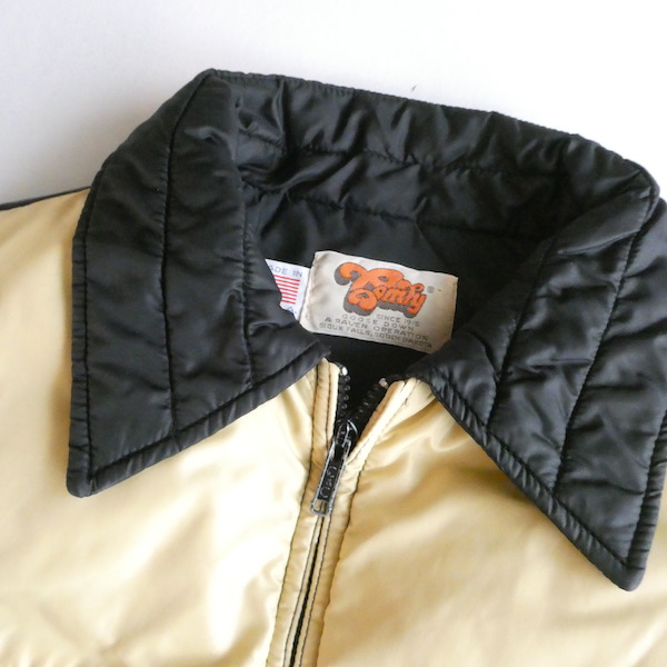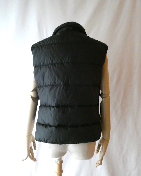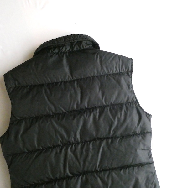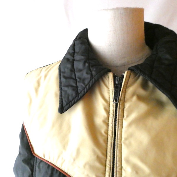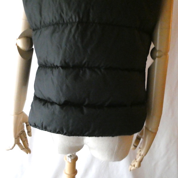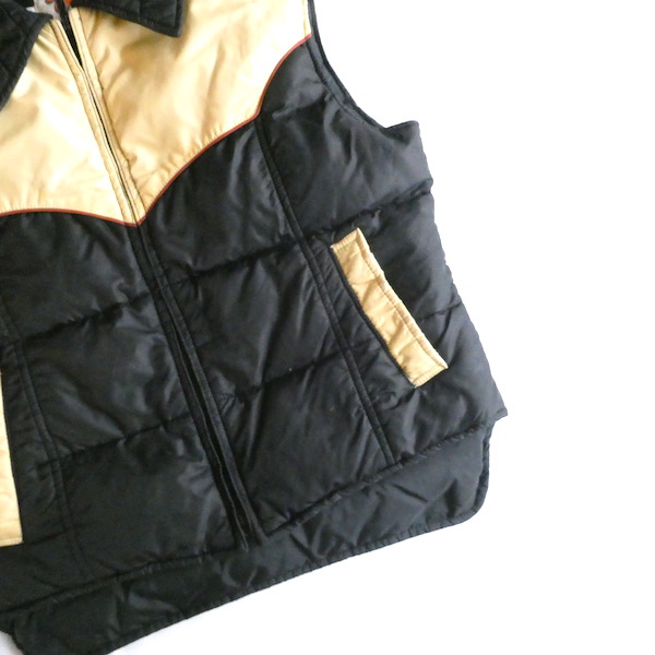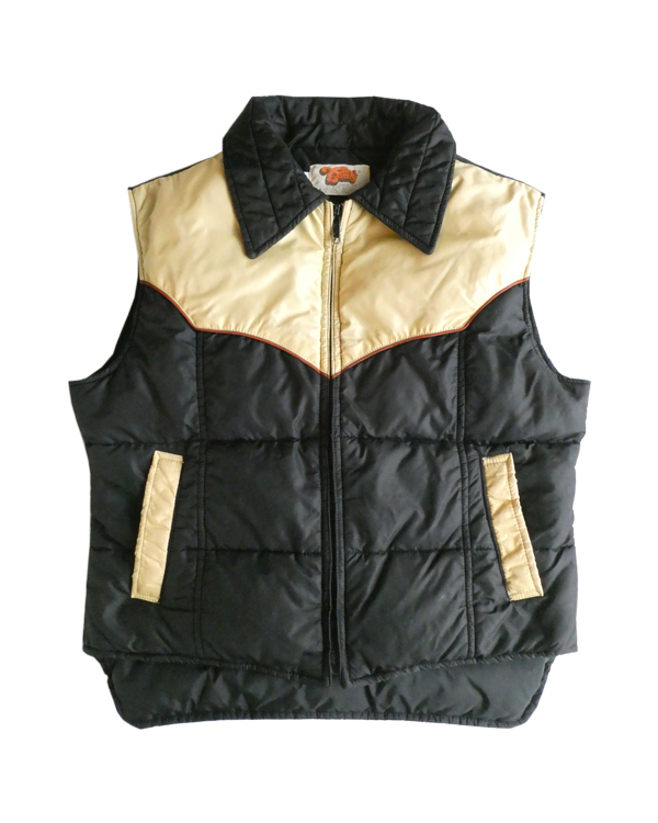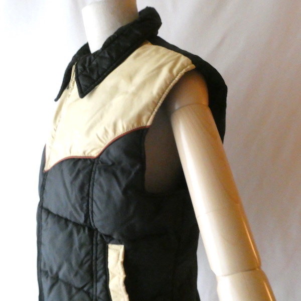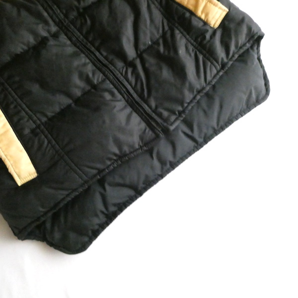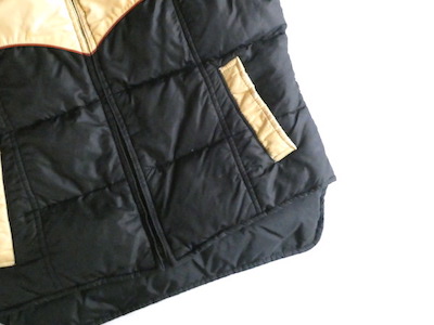 襟付きのナイロンダウンベストです。黒のイエローベージュのコンビ。緩めのウエスタンヨークとの境目はブラウンのパイピングです。小さな穴がありますが、それ以外は比較的綺麗なコンディション。中身も経年の割にはまだフカフカです。ニットやデニムJKT、アウターetc.の上に。