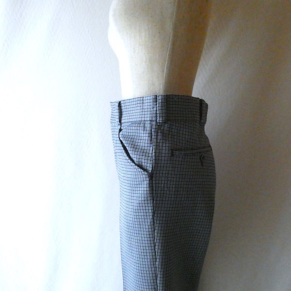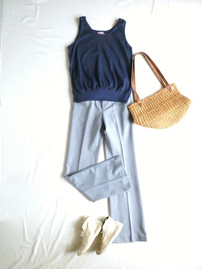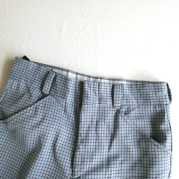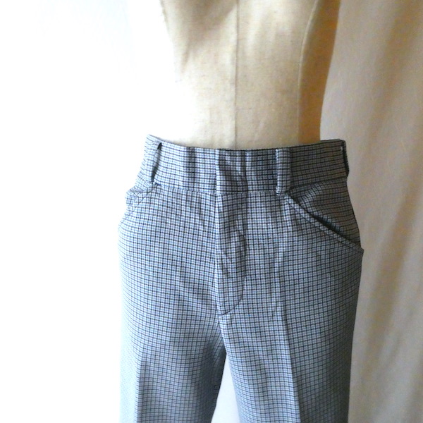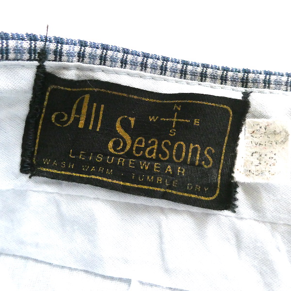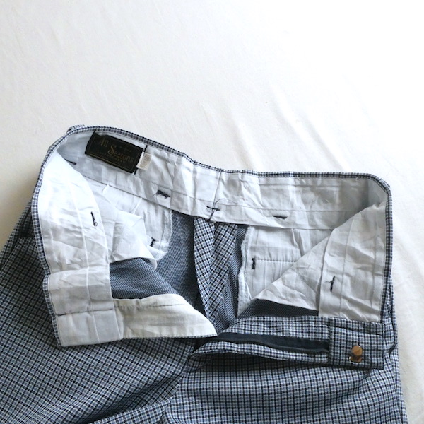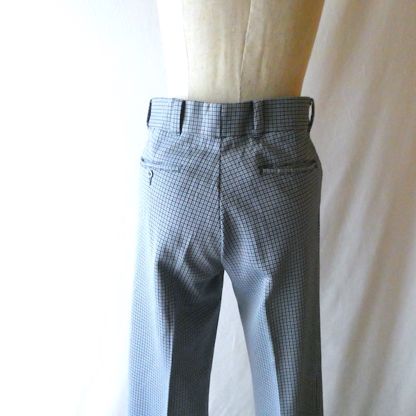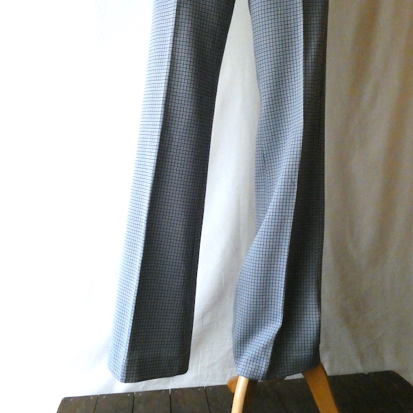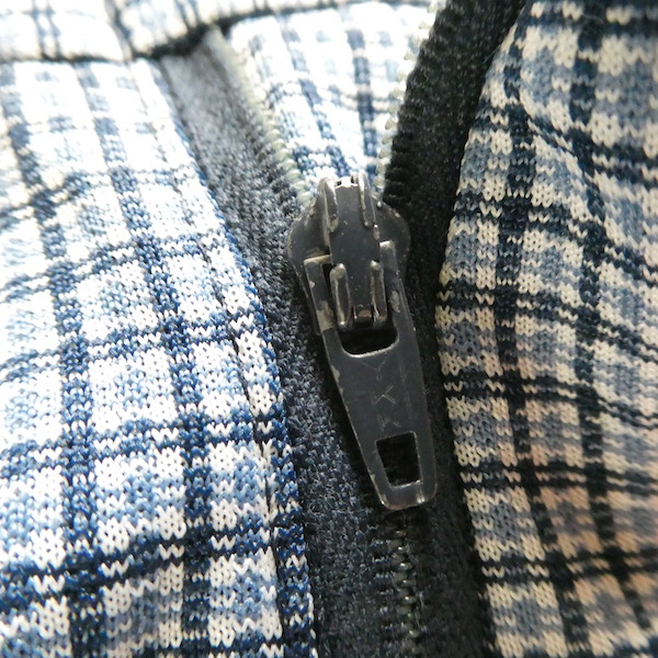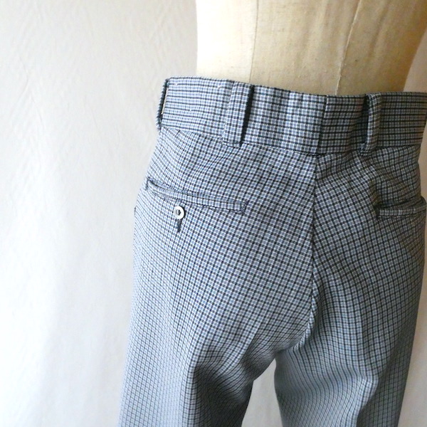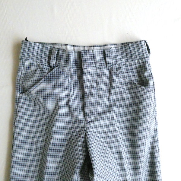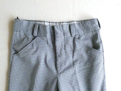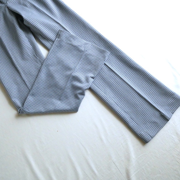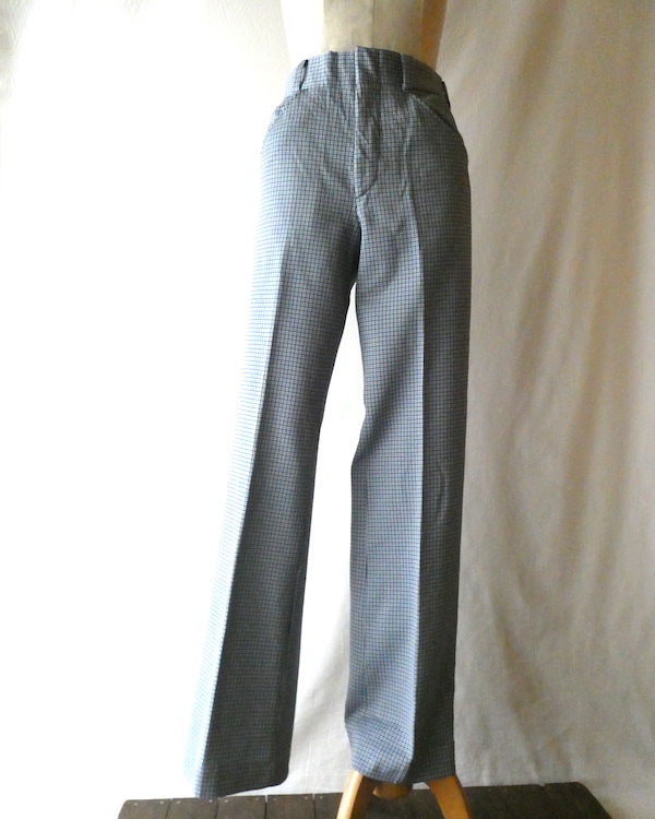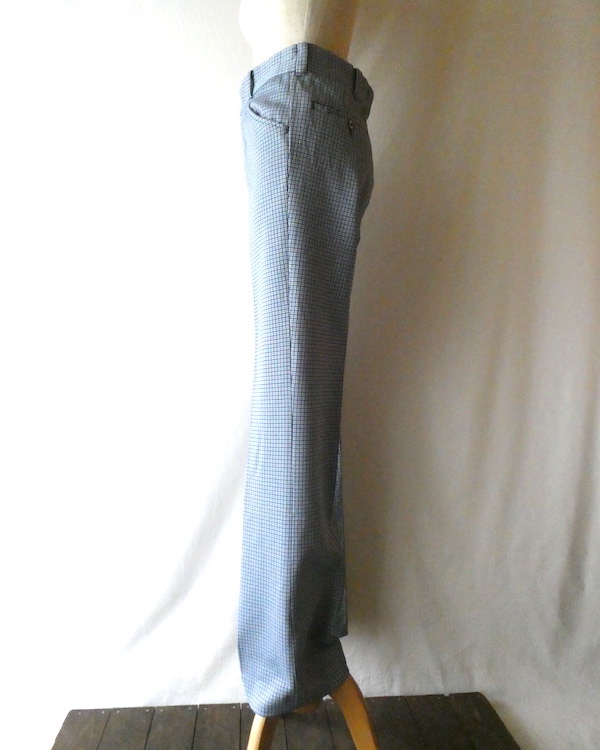 ポリエステル素材のフレアスラックスです。ネイビーと水色の爽やかなタッタソールチェック。この手にしてはサラッと薄手のポリエステルで夏場寄りの素材感。センタープレスが入り、程よいフレア感で下にストンと落ちます。シーズンレスなアイテムではあるので、秋冬にもニット等と合わせられますよ。