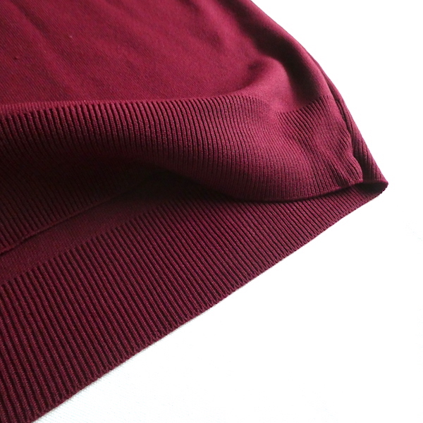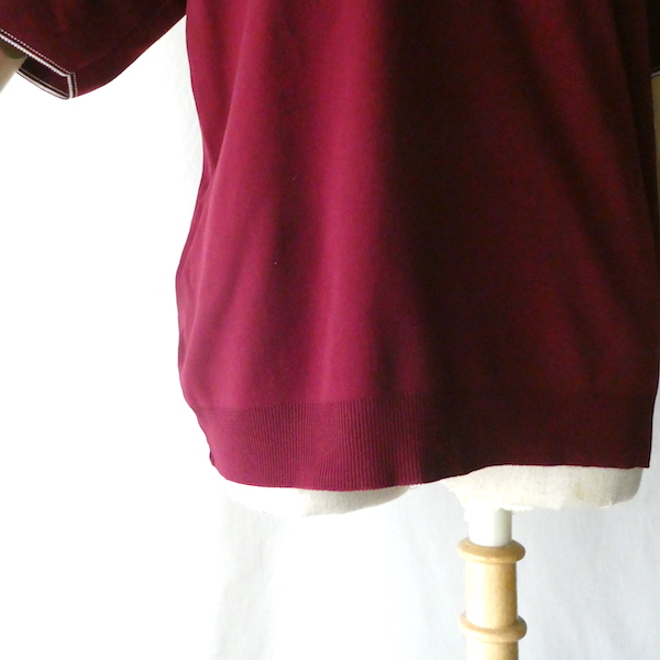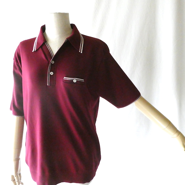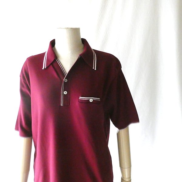 ナイロン素材の半袖ポロシャツです。深いボルドーカラーに白いラインのコンビ。ボタンは中程からでスキッパータイプと合わせたようなデザインです。襟もロングポイント過ぎず着やすいですよ。ボトムにインしても邪魔にならない厚さで、カーディガンやジャケットのインナーにも便利な一枚。