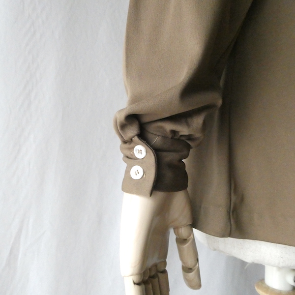 ポリエステル素材の長袖ブラウスです。コーヒーに少しだけミルクを入れたようなブラウンカラー。襟元はボウ付きです。長めのボウなので結び方次第で色々な表情に。カーディガンやジャケットを羽織るとリボン部分が良いアクセントになります。