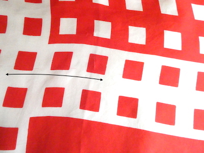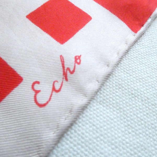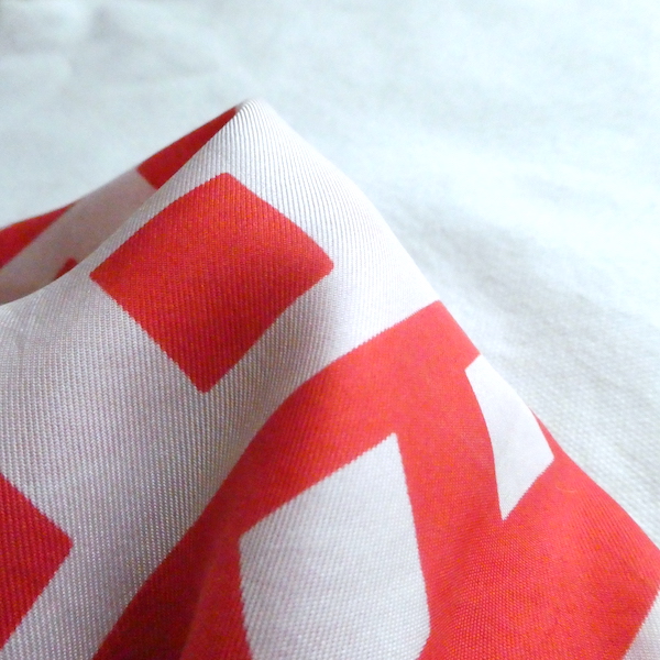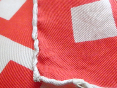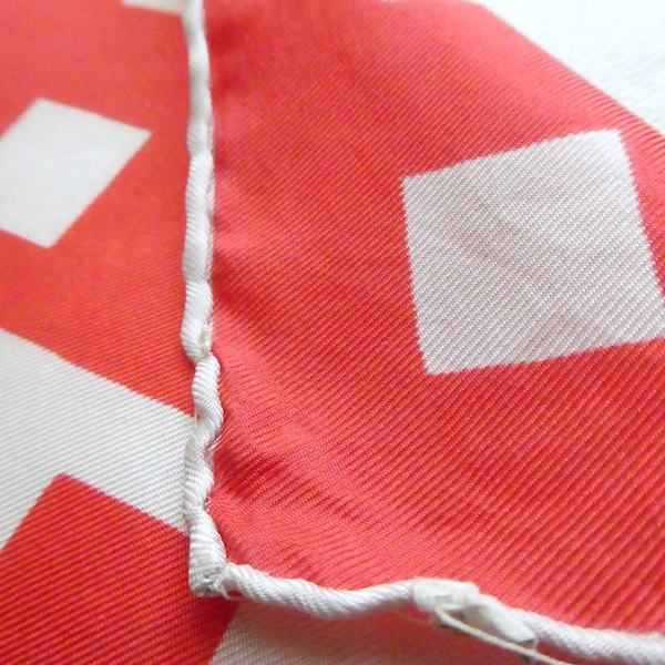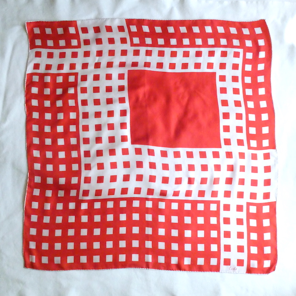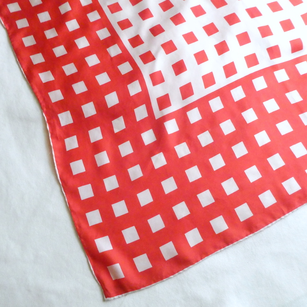 シルクの大判スカーフ。つるんと滑らかな光沢のある質感です。三つ折り部分はハンドロール。USAアイテムでMade in JAPAN表記(当時のUSAスカーフ工場が日本のパターンのアイテムです)白赤の◾️◾️を組み合わせたグラフィカルな柄。大判なので色々な使い方が出来そうです。