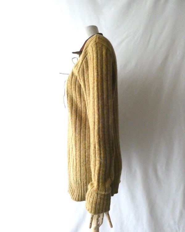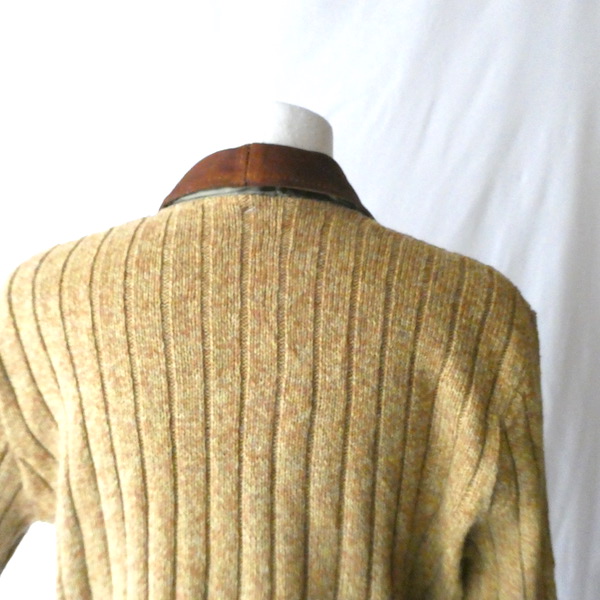 フェイクスエードの襟付きニットです。ロングポイントの襟はブラウンのフェイクスエード。胸元からレザー紐のレースアップデザインです。紐の通し方や結び目で表情が変わるのお好みで。ボディーはマスタードにオレンジ系糸のミックスカラー。薄手で少しリブの効いた細身のシルエットです。