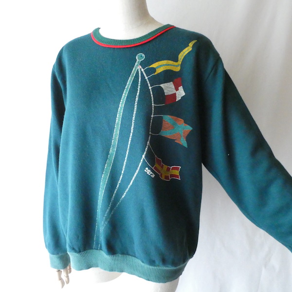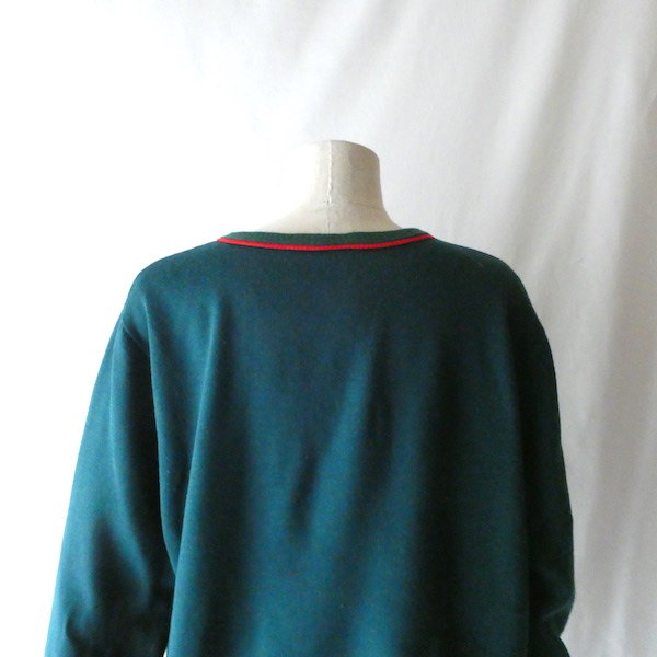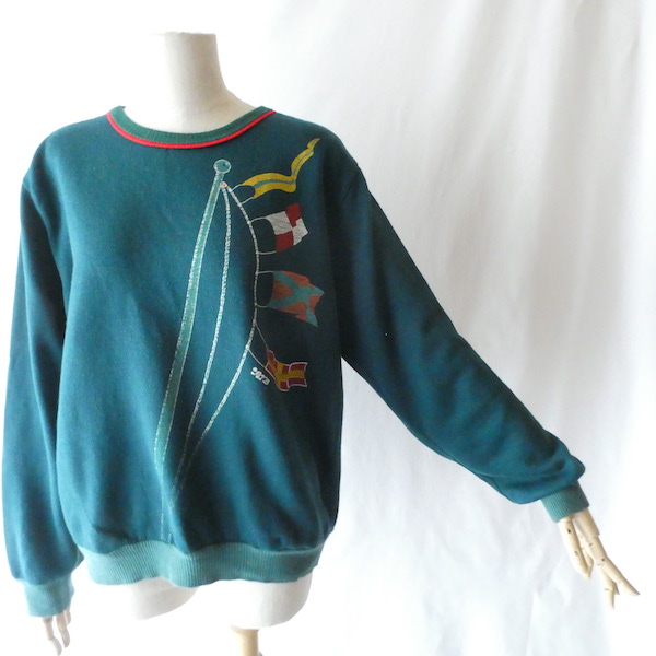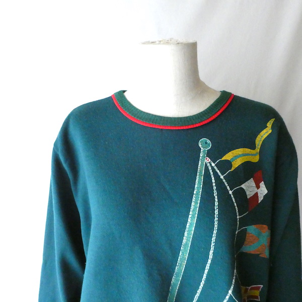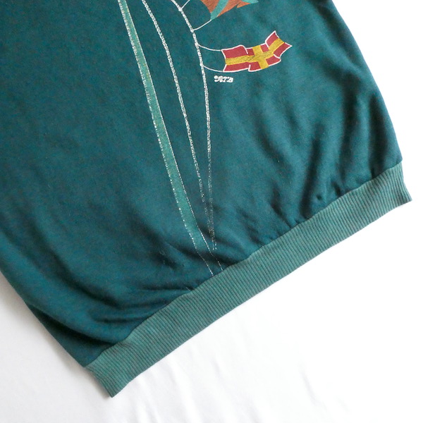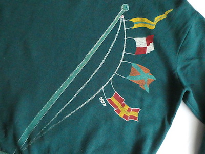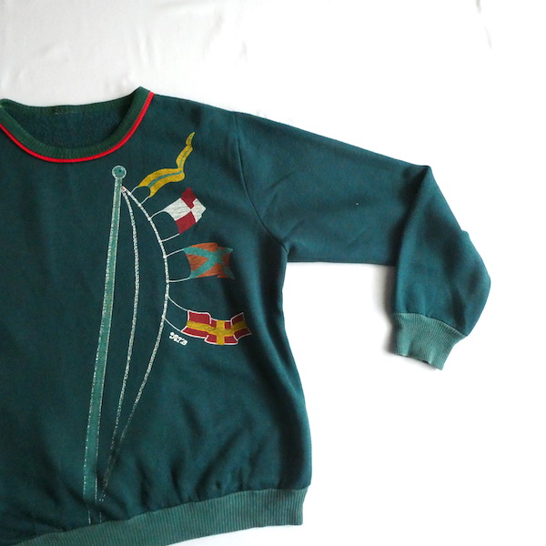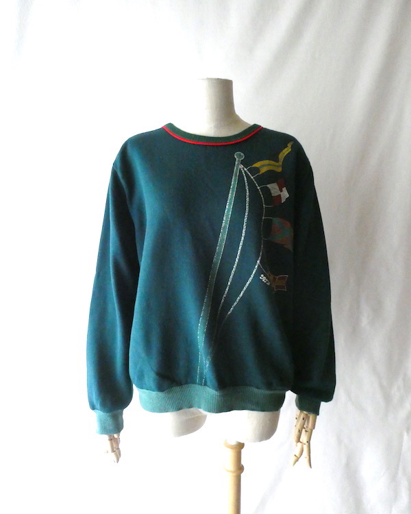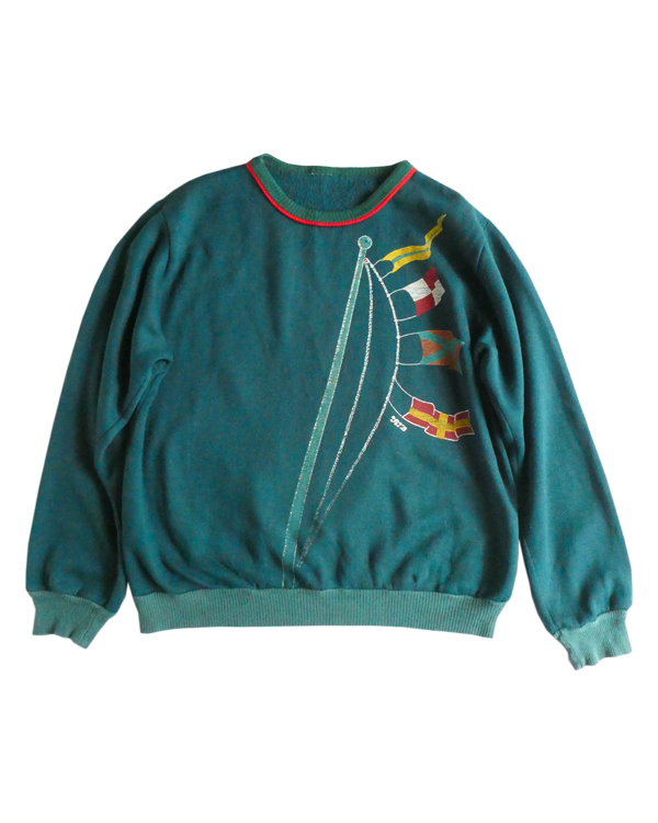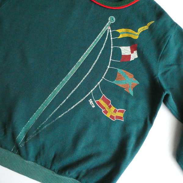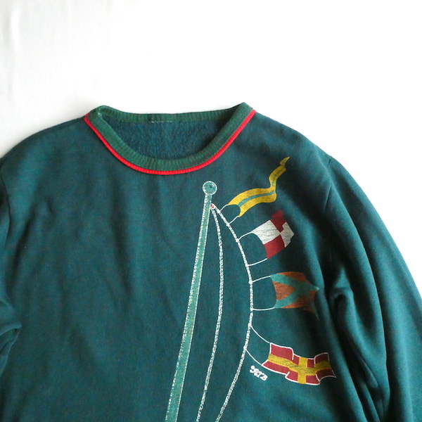 深いグリーンの薄手スウェット。襟元はバインダー、袖と裾はリブ。少し大きめの襟ぐりには赤いラインが入ります。裾から肩にかけて風になびくフラッグのプリント。少し擦れ気味のプリントと、色落ちしたリブも◎。身幅広めのふわっと可愛いシルエットです。