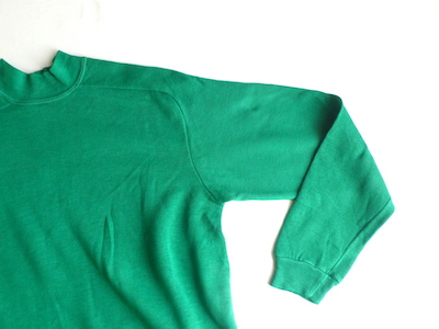 可愛らしいグリーンの長袖スウェットです。少しだけ光沢のあるツルッとしたアクリルハイゲージ。ハイネックにフリーダムスリーブで、レトロ感はしっかりありますが裾リブの絞りもなく何にでも合わせ易いアイテム。色味のポイントに着回せて便利ですよ。