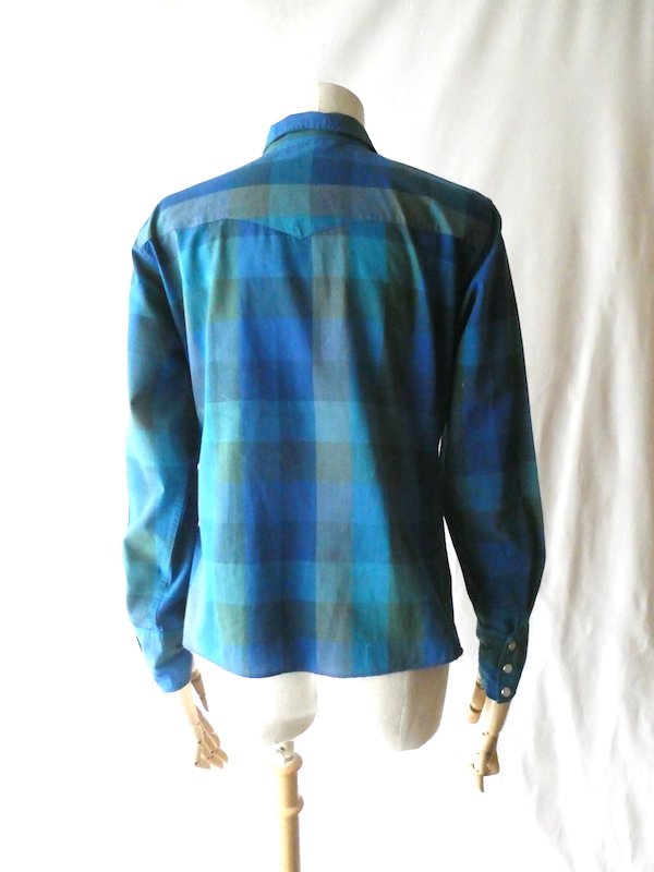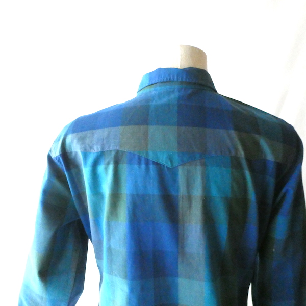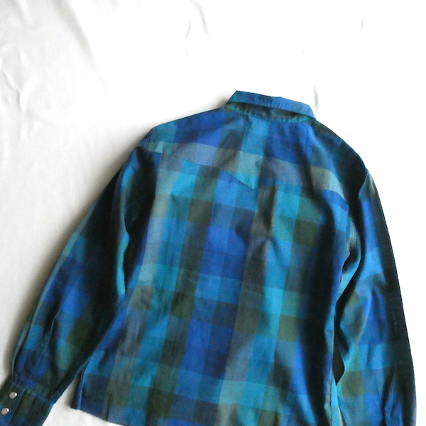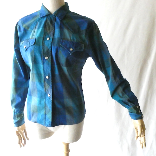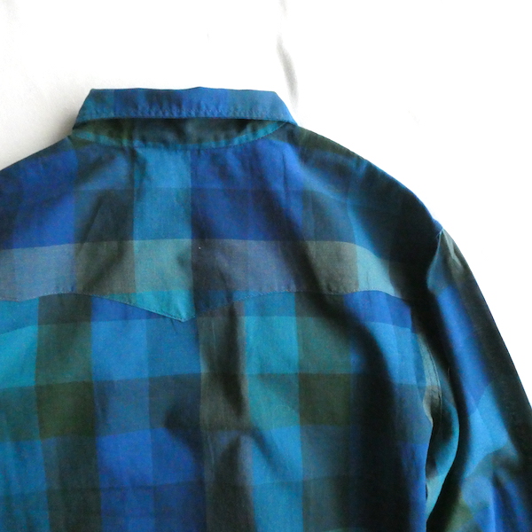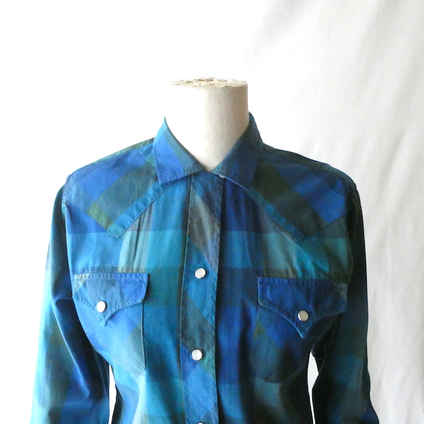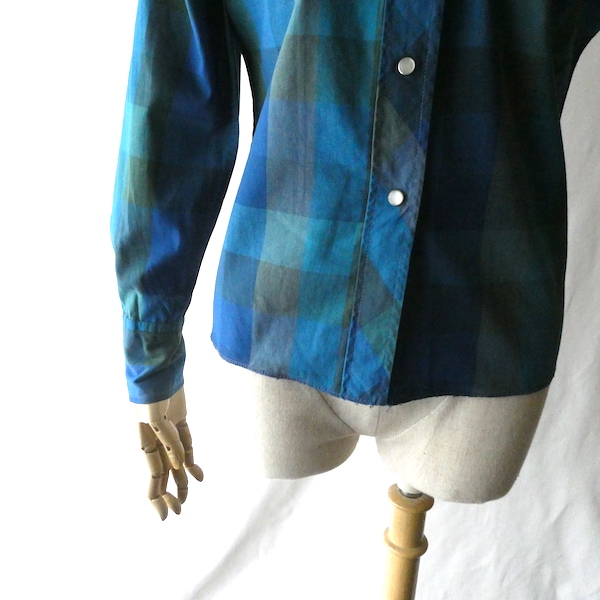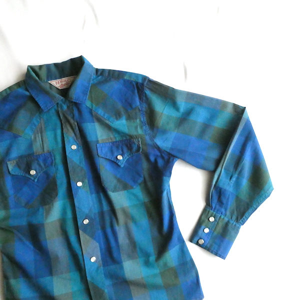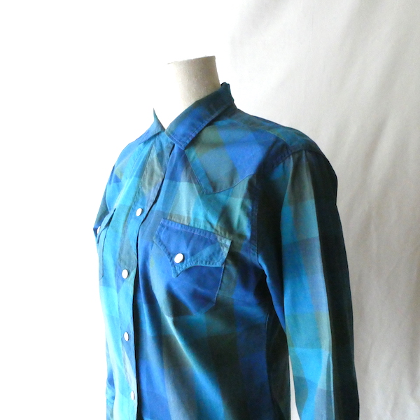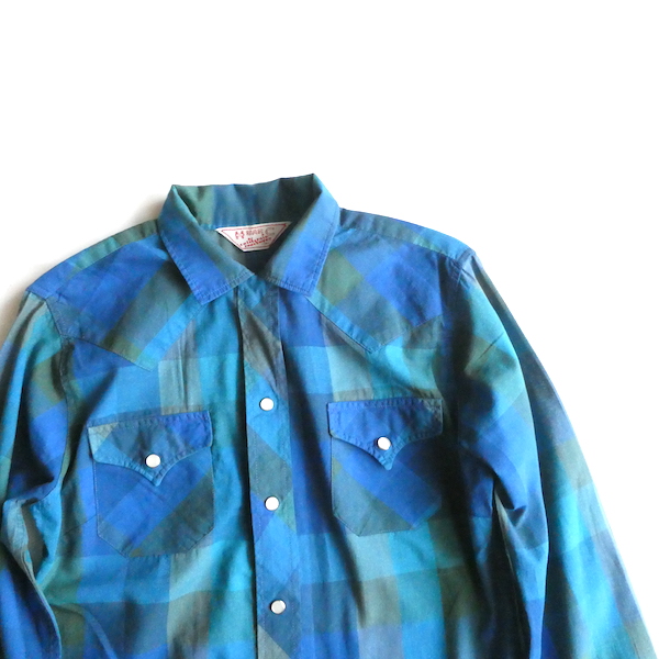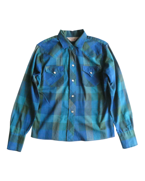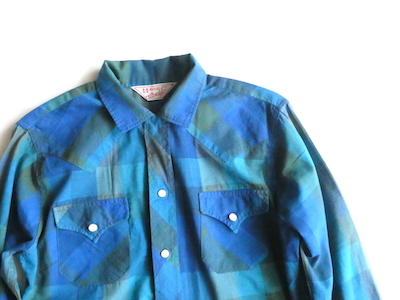 H bar C のウエスタンシャツです。綺麗なブルーグラデーションのチェック。ループボタン付きのオープンカラーで、襟も小さめ。主張し過ぎず、サラッと取り入れられるウエスタンシャツです。コットンポリでまだ色も鮮やかに残っています。コンディションも良いですよ。