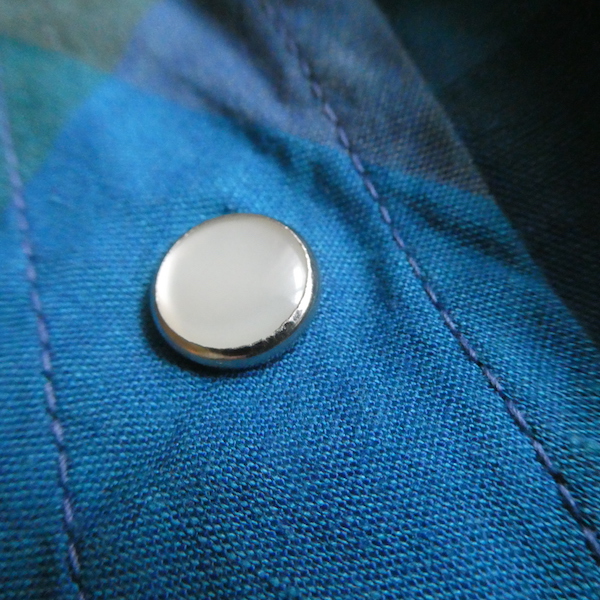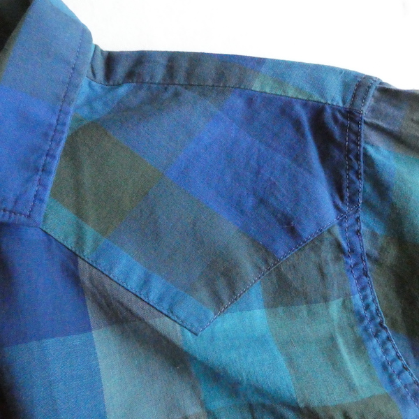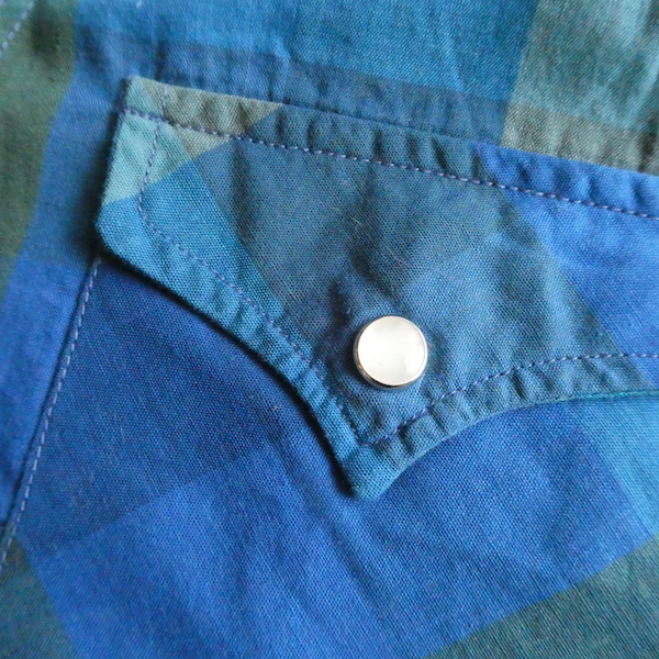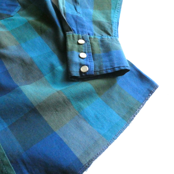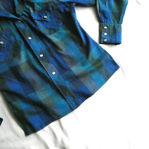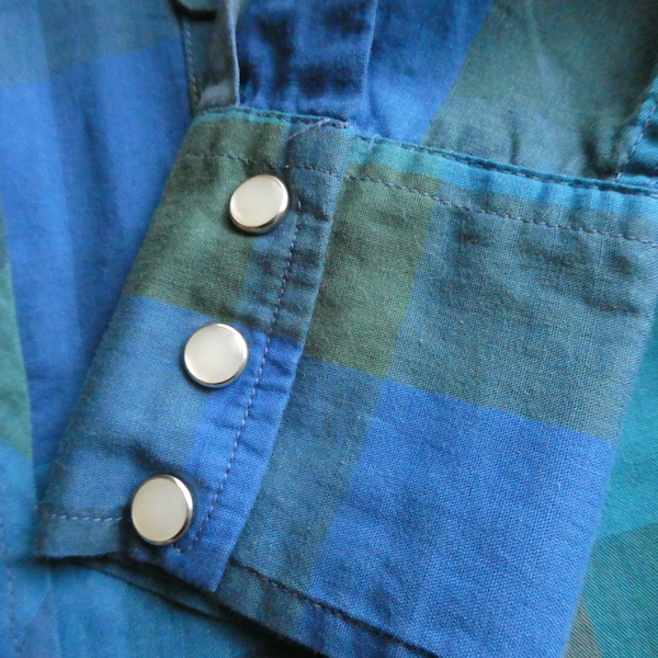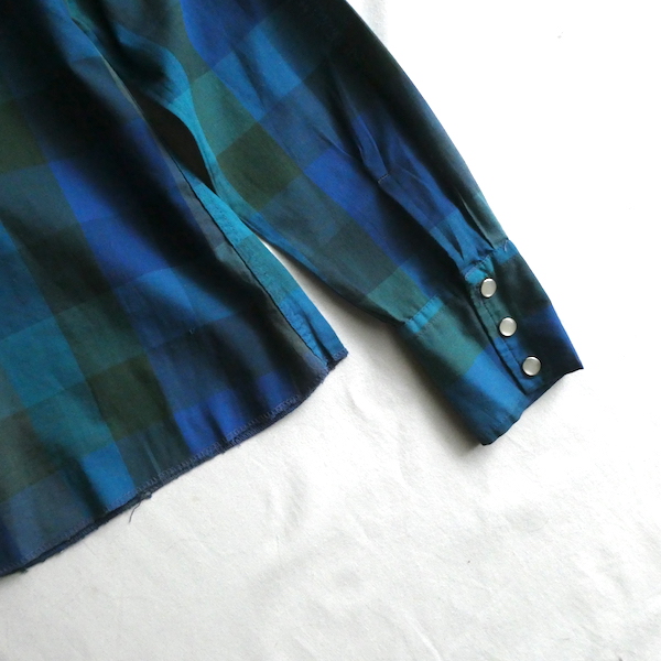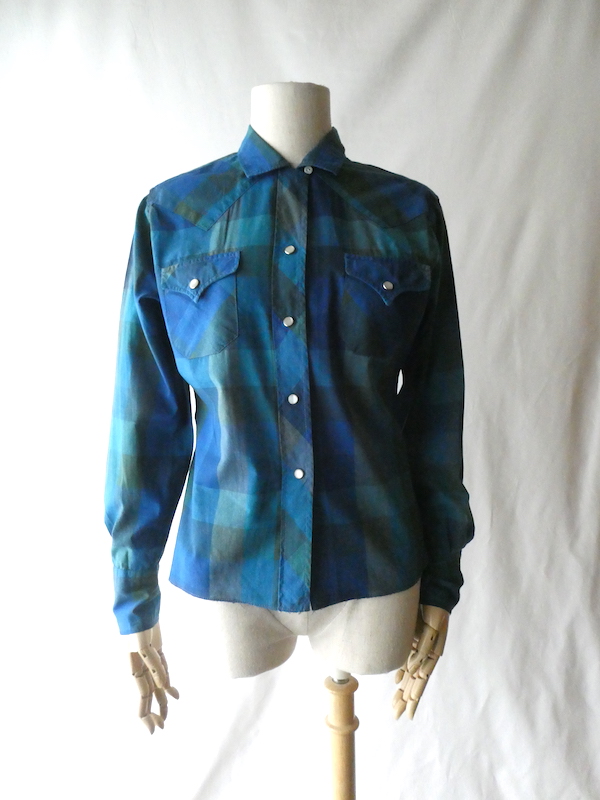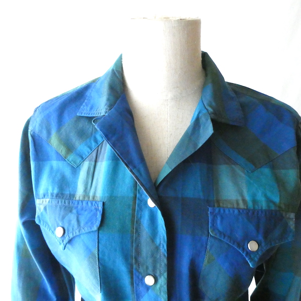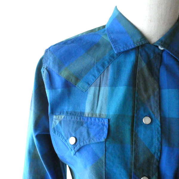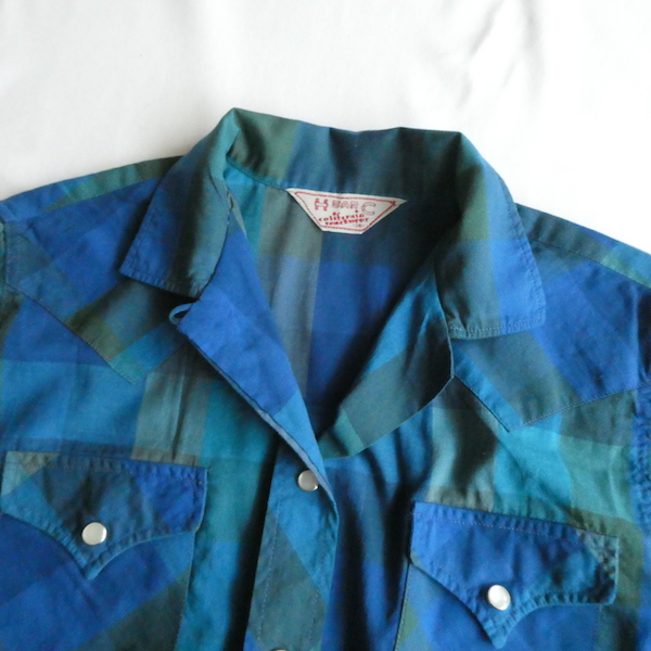H bar C のウエスタンシャツです。綺麗なブルーグラデーションのチェック。ループボタン付きのオープンカラーで、襟も小さめ。主張し過ぎず、サラッと取り入れられるウエスタンシャツです。コットンポリでまだ色も鮮やかに残っています。コンディションも良いですよ。