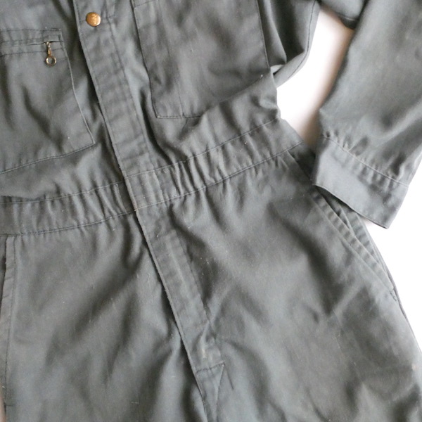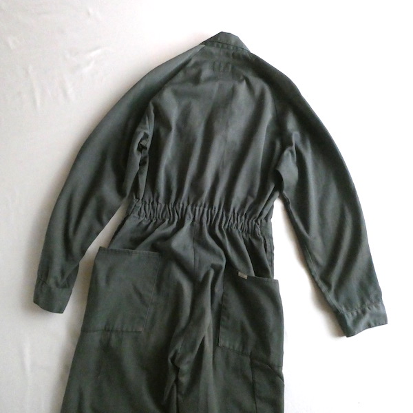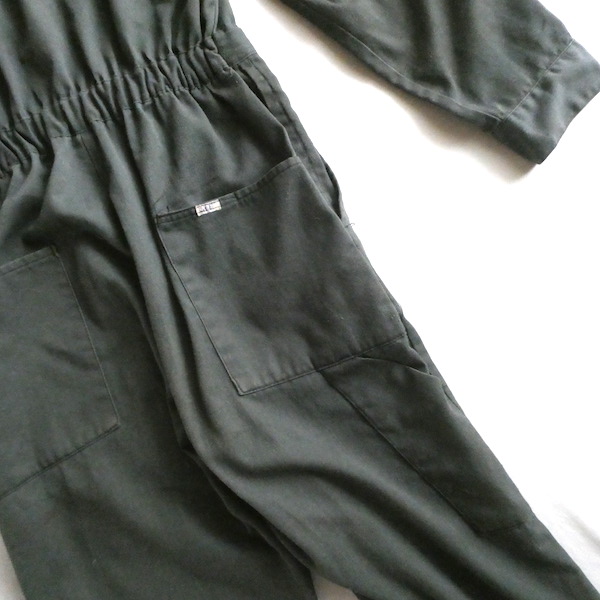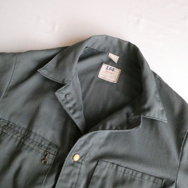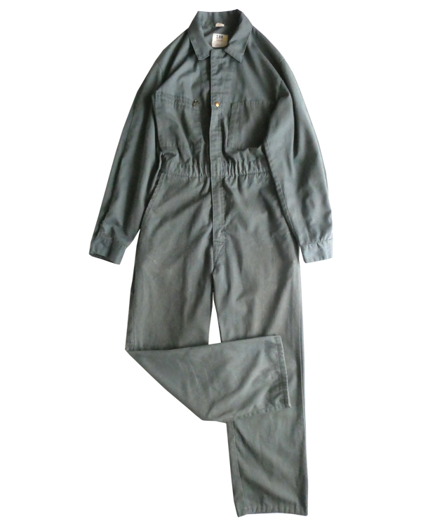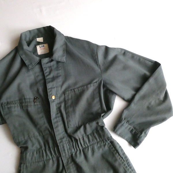 Leeの長袖オールインワンです。コットンポリの少しグレーががったオリーブ色。比較的薄手の素材感です。フロントはダブルジップになっており上下どちらからも開閉可能。ウエスト部分はゴム入りです。張りの少ない生地なのでベルトを入れてブラウジングしたり、袖や裾のロールアップ等もし易いですよ。細身のシルエットです。ダメージ感を良いと思っていただける方に。