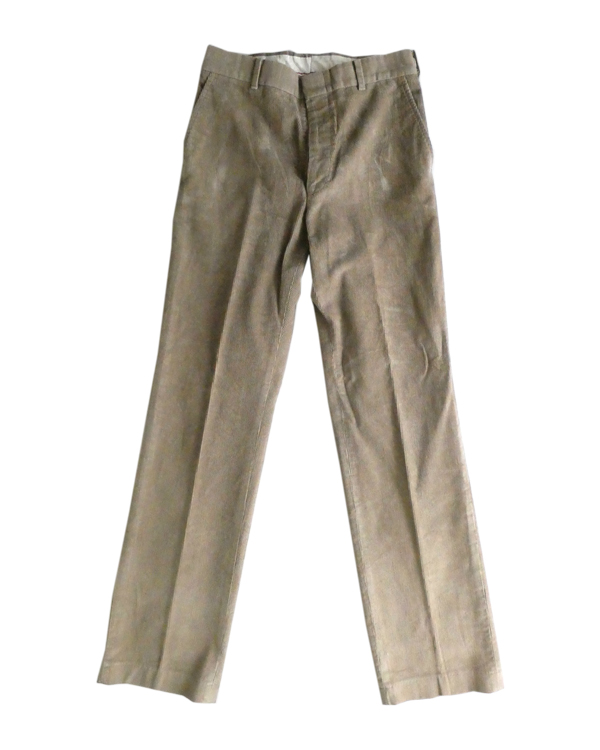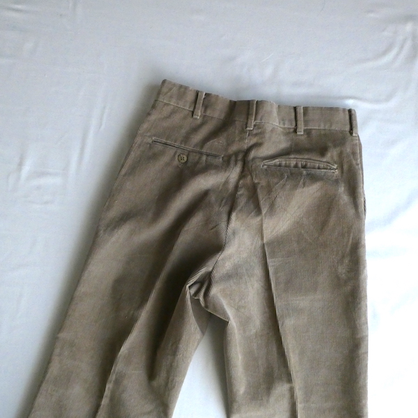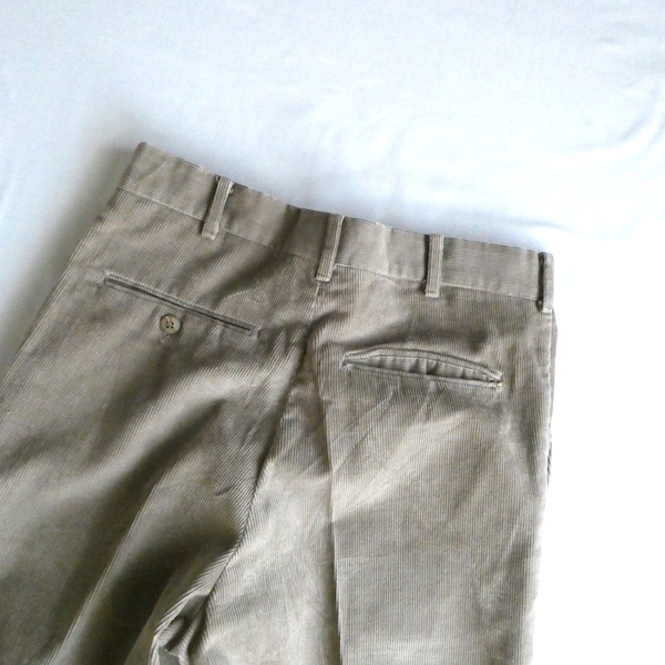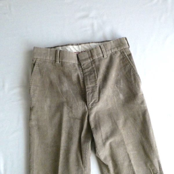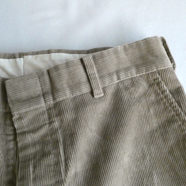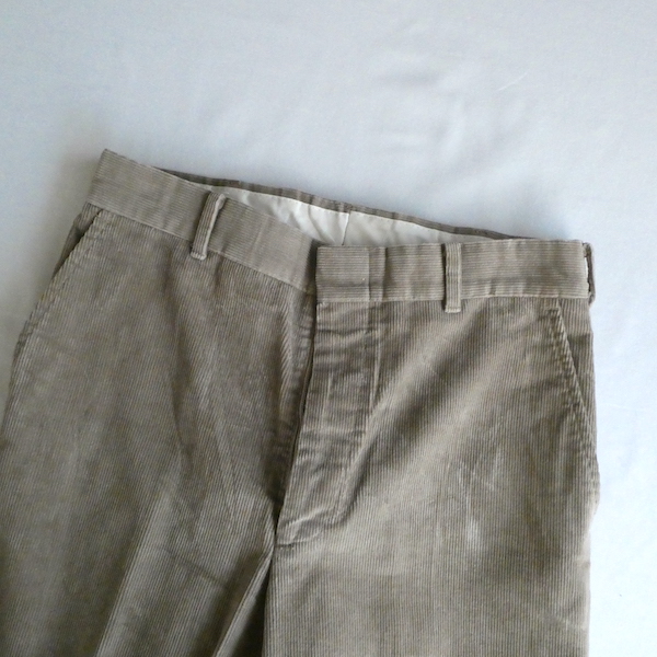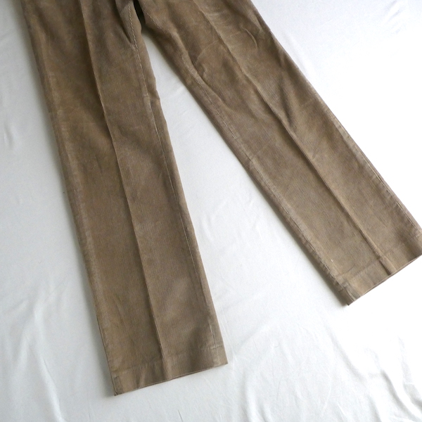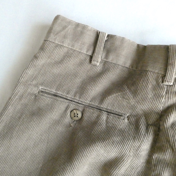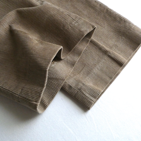 マクレガーのコーデュロイパンツです。タック無しのタイトなウエスト周りからスッと綺麗に落ちるシルエット。細畝のオークベージュカラーで広くシーズンをカバー出来そうなアイテム。1本あると着まわせて便利ですよ。