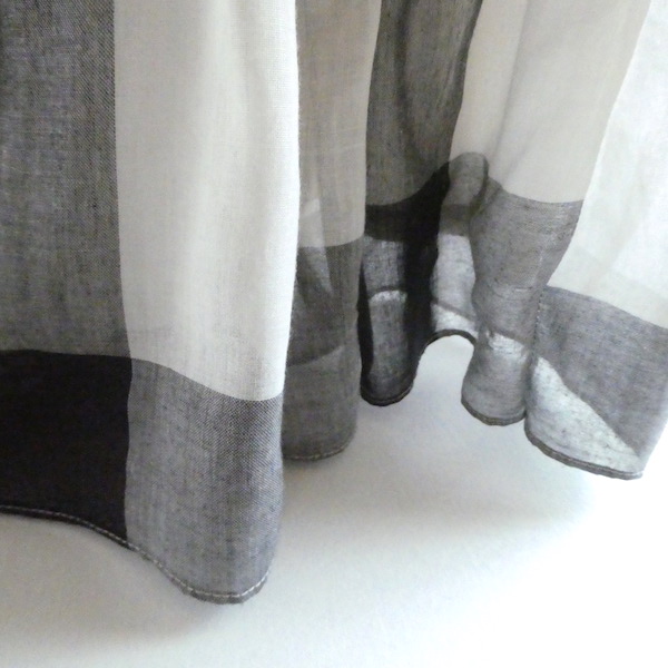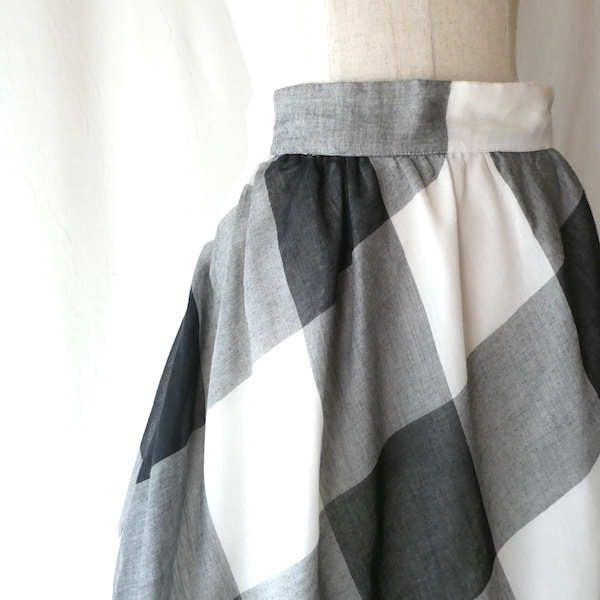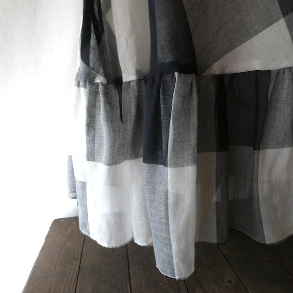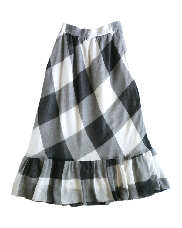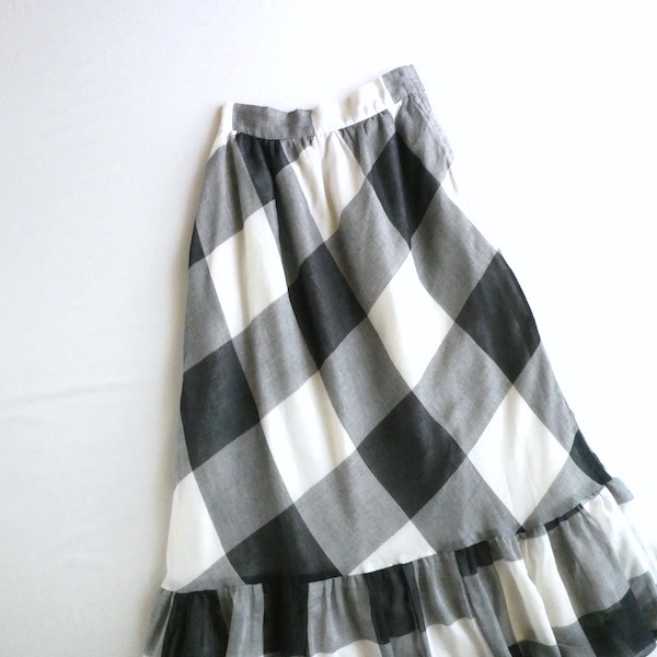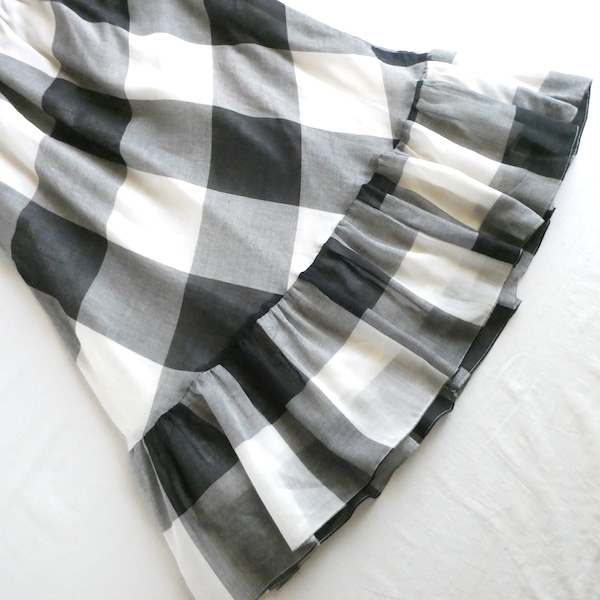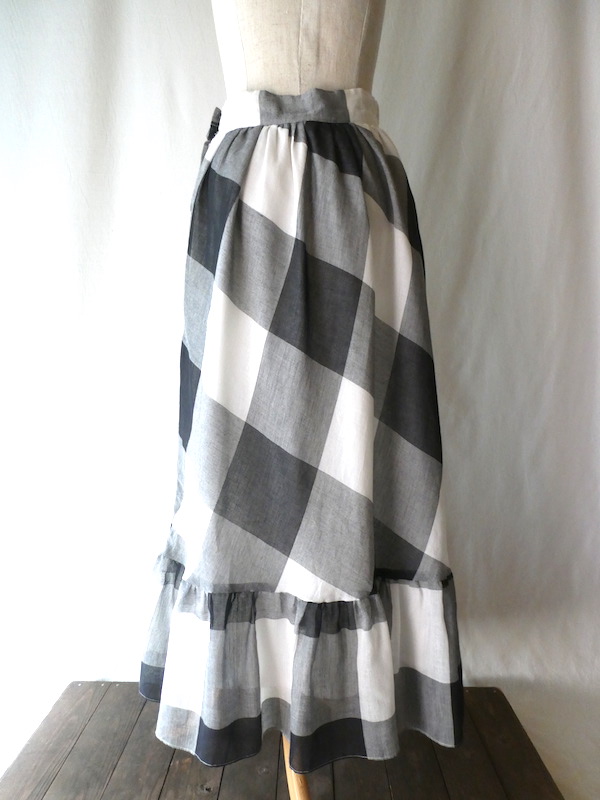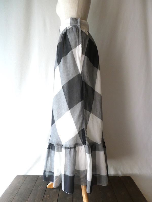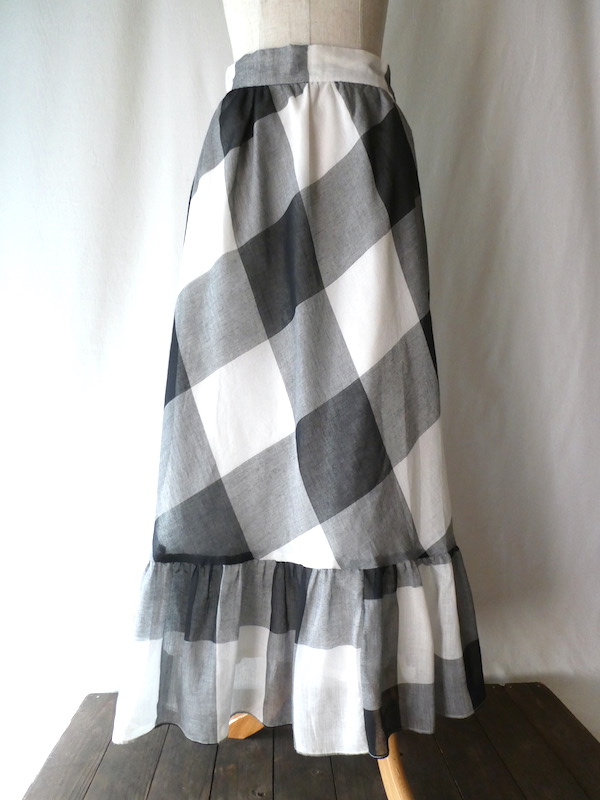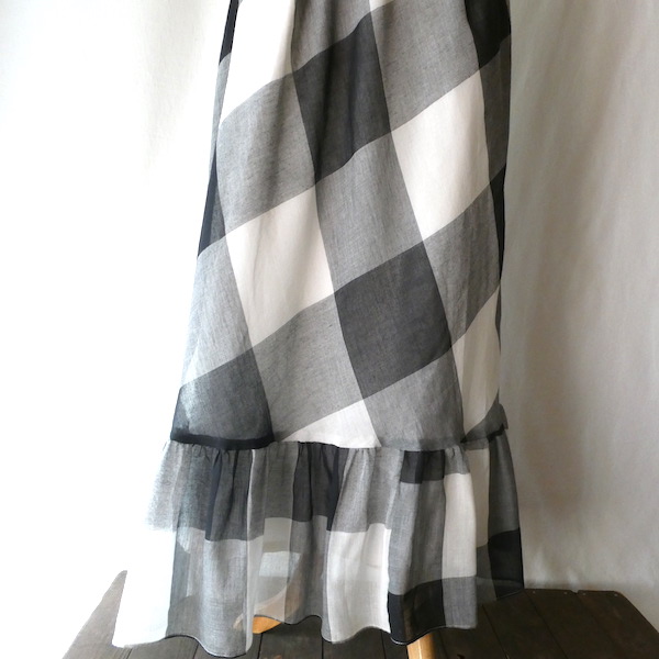 裾フリルのマキシスカート。白黒の大きなピッチのギンガムチェック柄。ボディは斜めにバイヤスに取って、共布で長めの裾フリル。ポリコットンの薄い白生地(裏地)に、白黒ギンガムの透け感のあるガーゼ生地が重ねて有ります。生地の重なりが涼しそうな夏向けのマキシです。裏地もサラサラで、サテン裏地のように張り付かず着心地良いですよ。