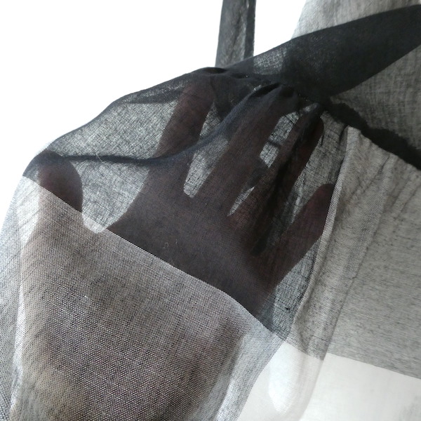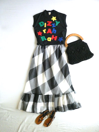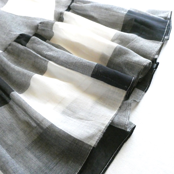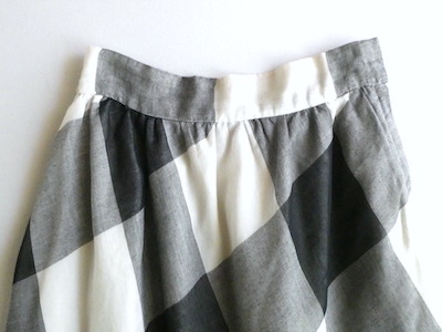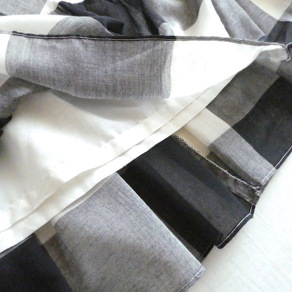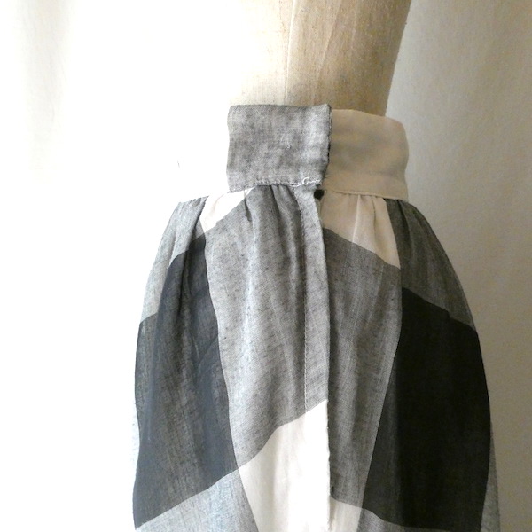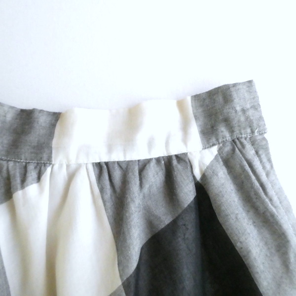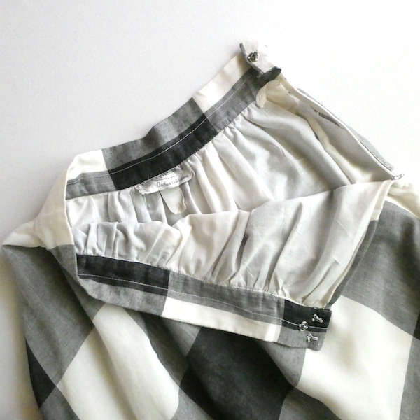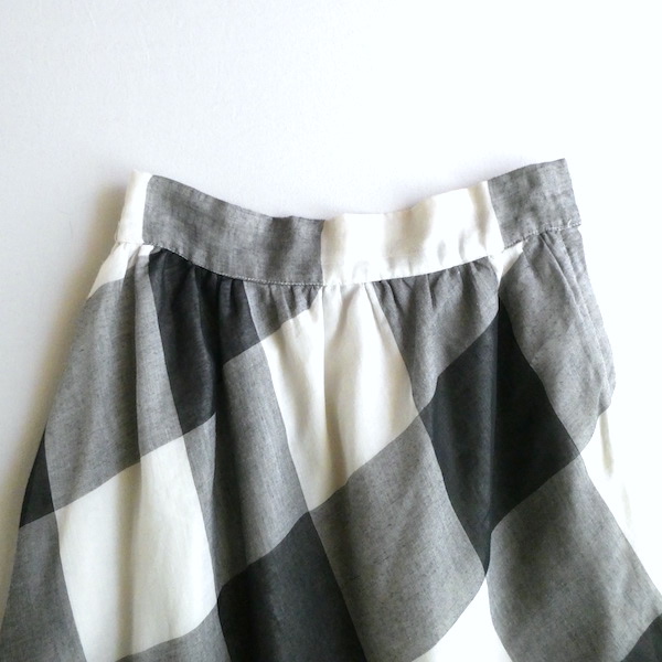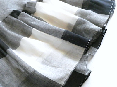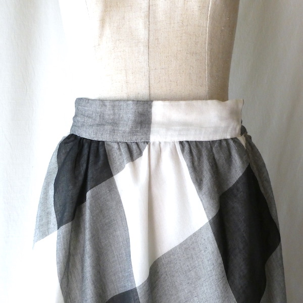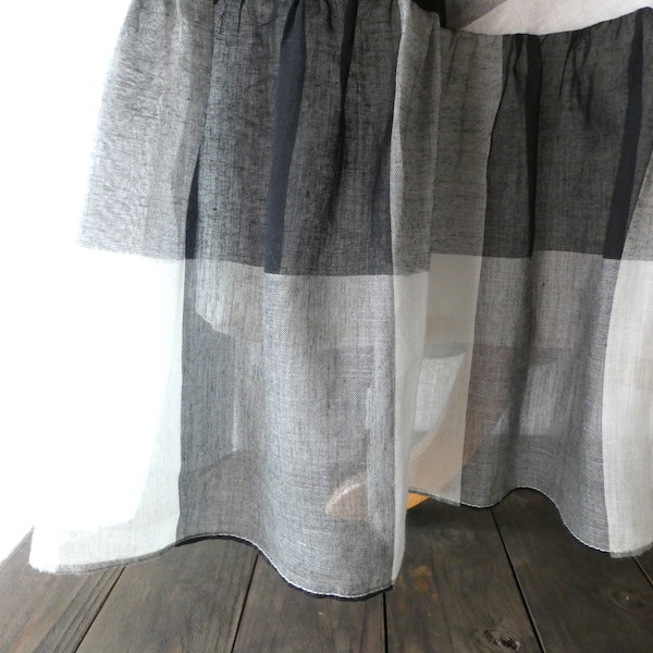 裾フリルのマキシスカート。白黒の大きなピッチのギンガムチェック柄。ボディは斜めにバイヤスに取って、共布で長めの裾フリル。ポリコットンの薄い白生地(裏地)に、白黒ギンガムの透け感のあるガーゼ生地が重ねて有ります。生地の重なりが涼しそうな夏向けのマキシです。裏地もサラサラで、サテン裏地のように張り付かず着心地良いですよ。
