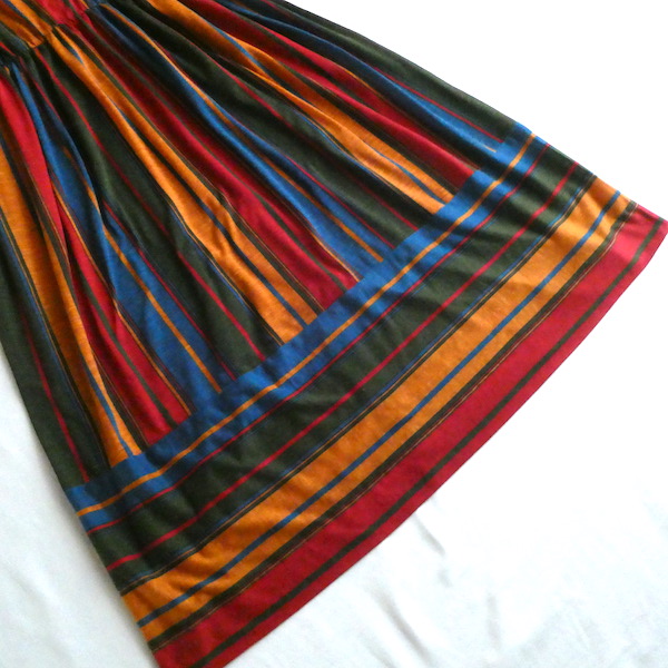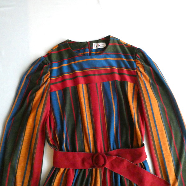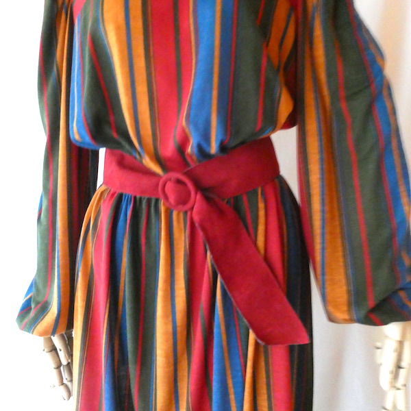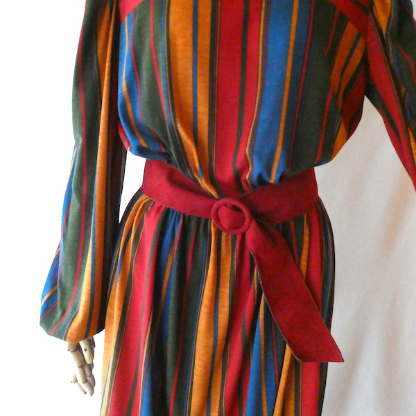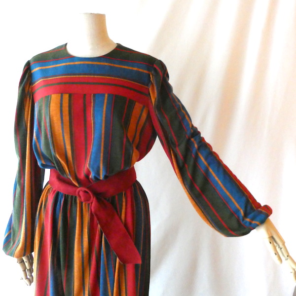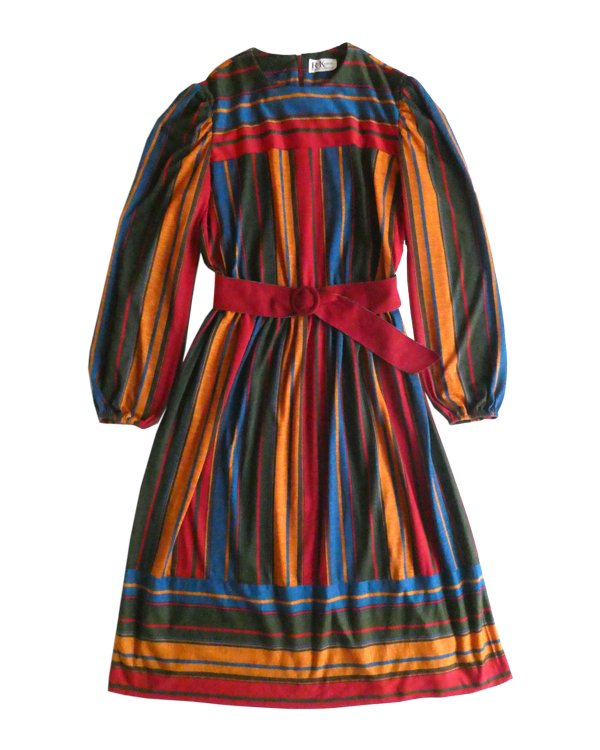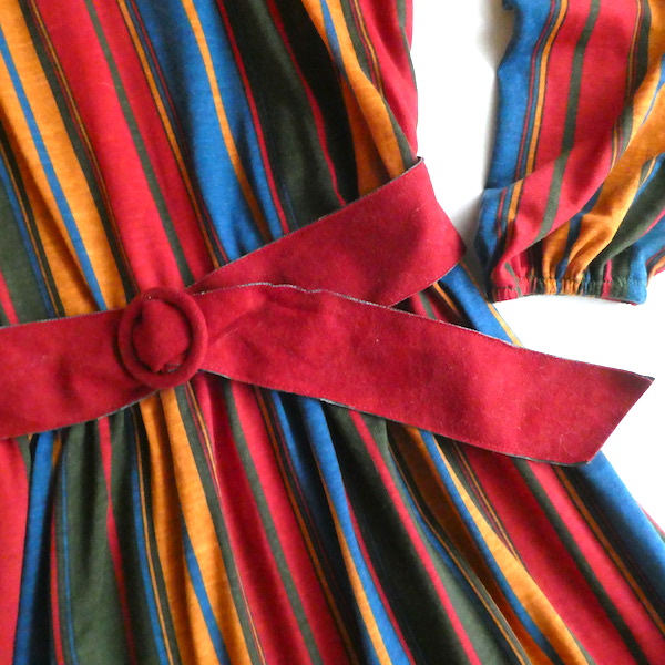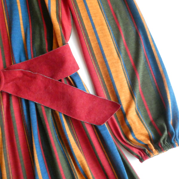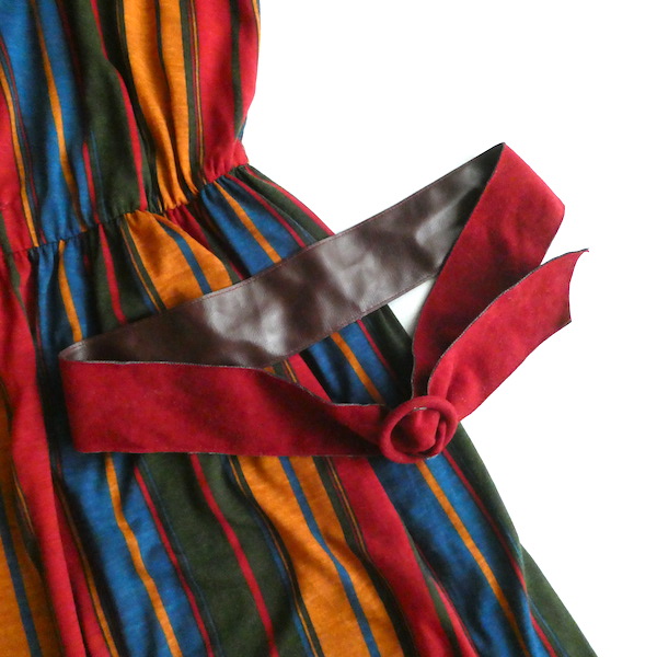薄手のストライプワンピースです。カラフルなマルチカラーストライプですが、ダルトーンで落ち着いた大人っぽい印象のアイテム。裏地もなくスムースなウール系ジャージー素材でリラックス出来る着心地です。ウエストには付属のベルトが付き(取り外し可)