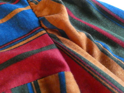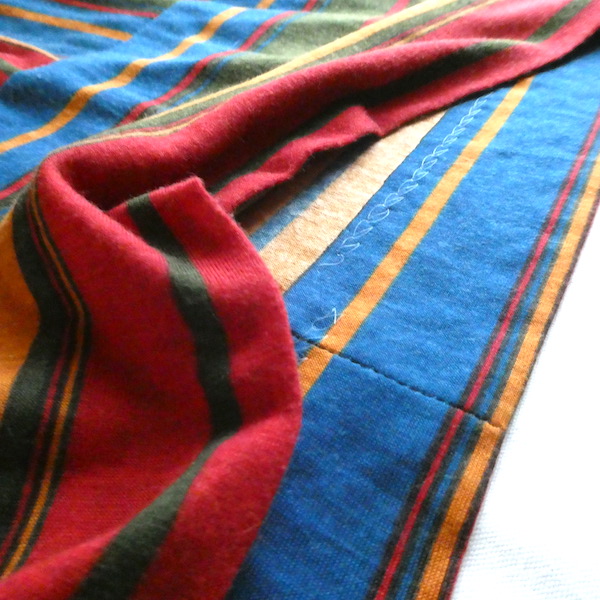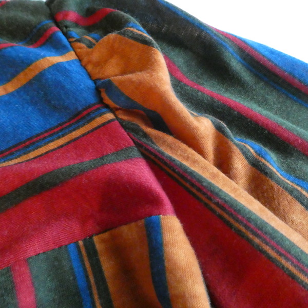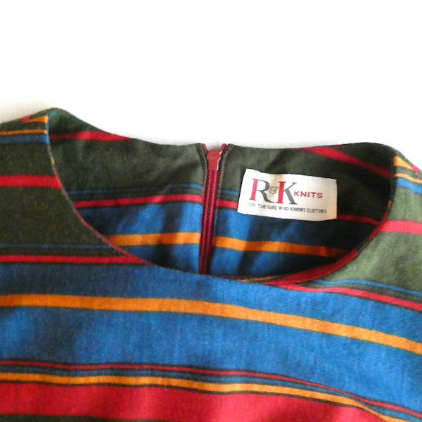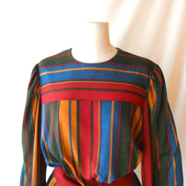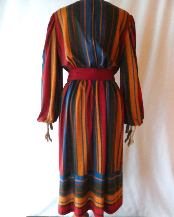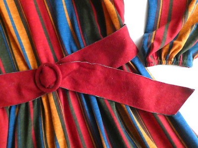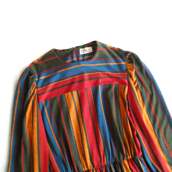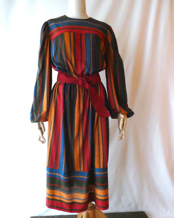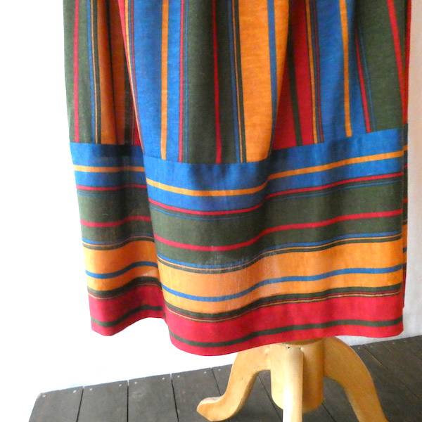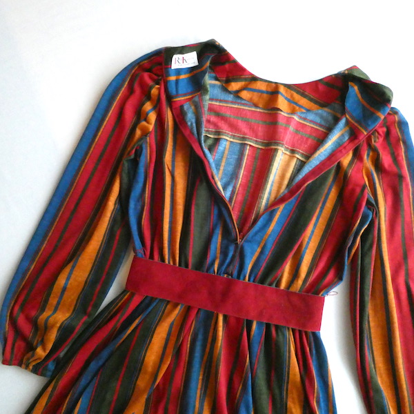 薄手のストライプワンピースです。カラフルなマルチカラーストライプですが、ダルトーンで落ち着いた大人っぽい印象のアイテム。裏地もなくスムースなウール系ジャージー素材でリラックス出来る着心地です。ウエストには付属のベルトが付き(取り外し可)