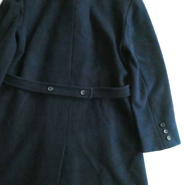 ペンドルトンのロングコートです。ネイビーの極シンプルなロングコート。オープンカラーの襟元を閉じると、キリッとまた違う印象に。肩幅も大きすぎず、ジャストなサイズ感で着れます。後ろに付いた飾りベルトもポイント。黒ほど主張が強く無いので、柔らかな印象で着られるロングウールコートです。