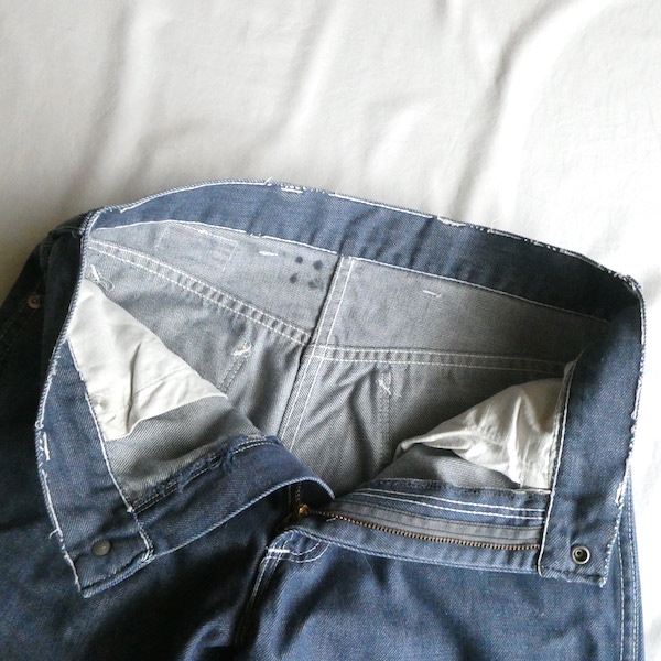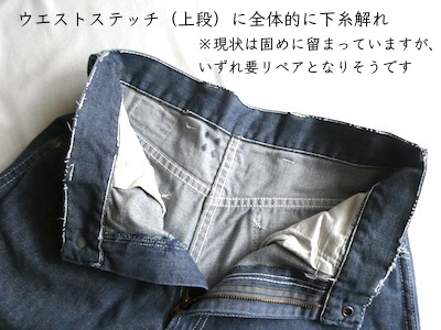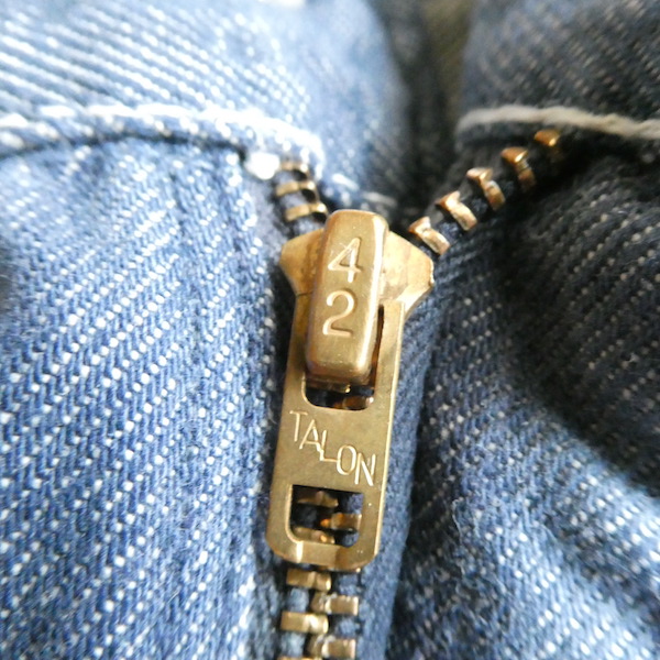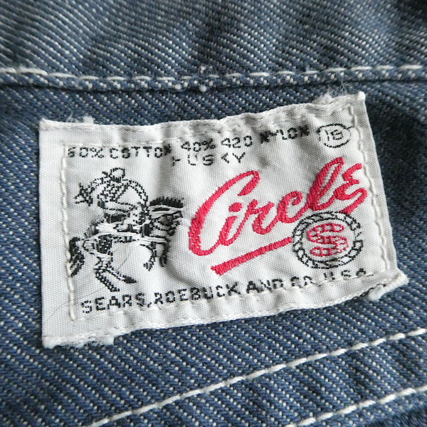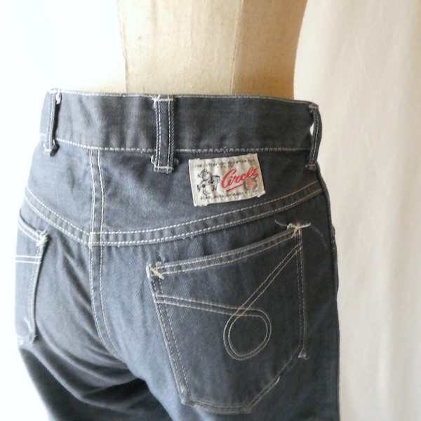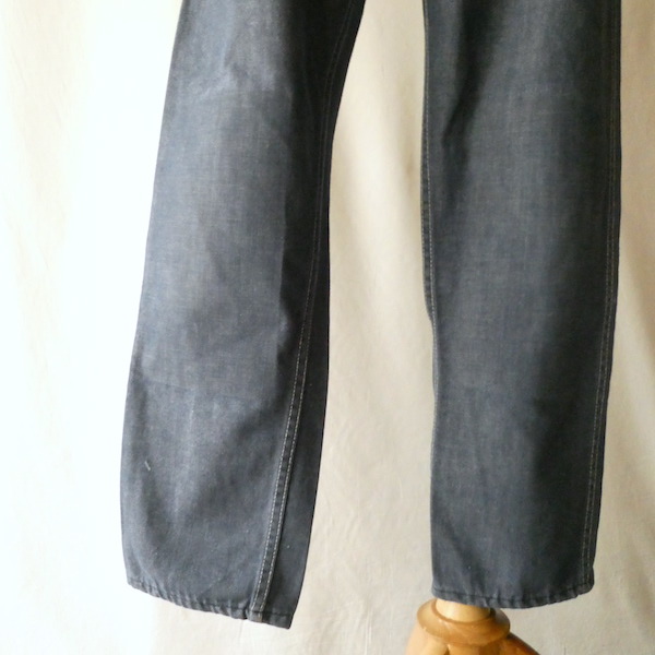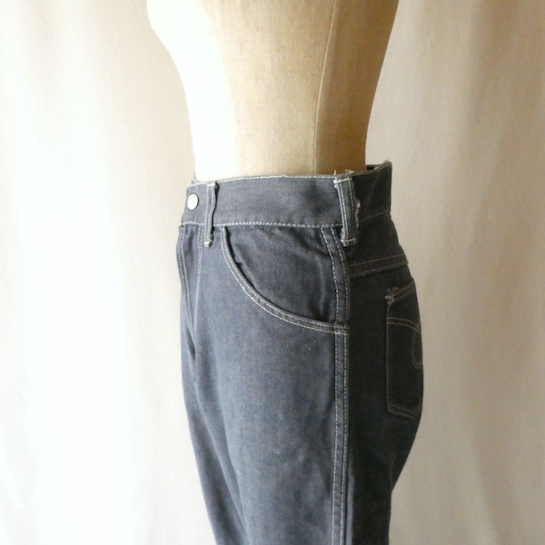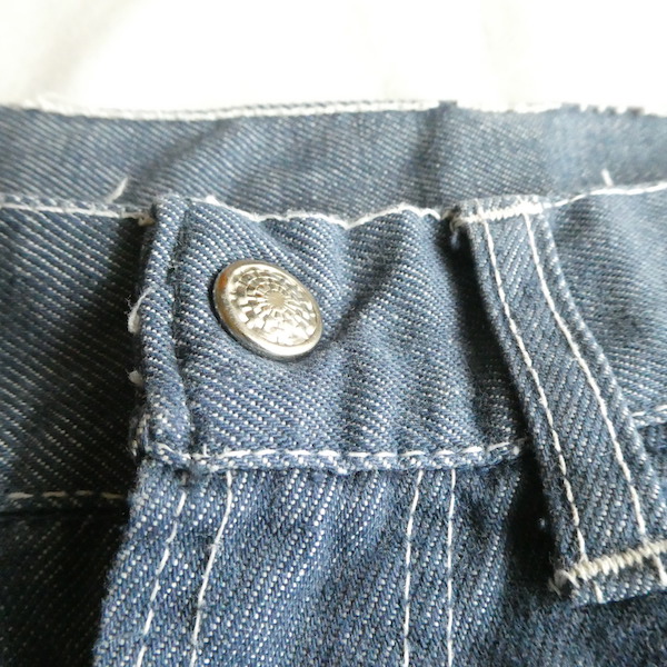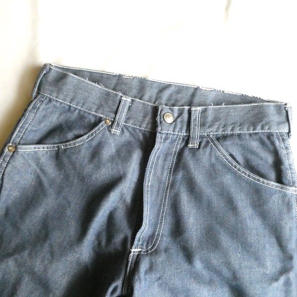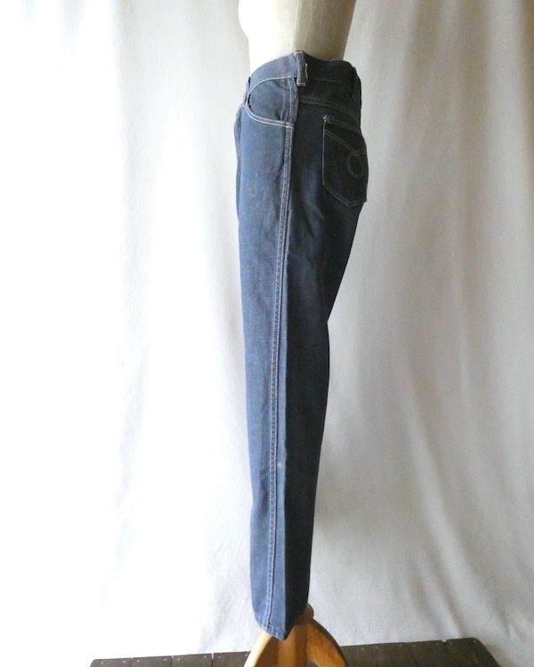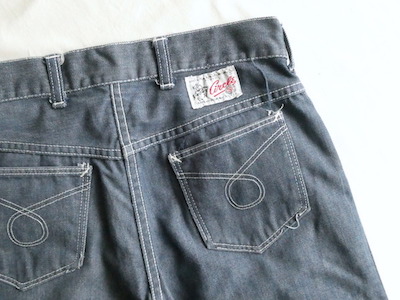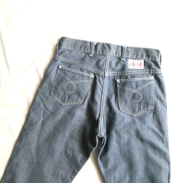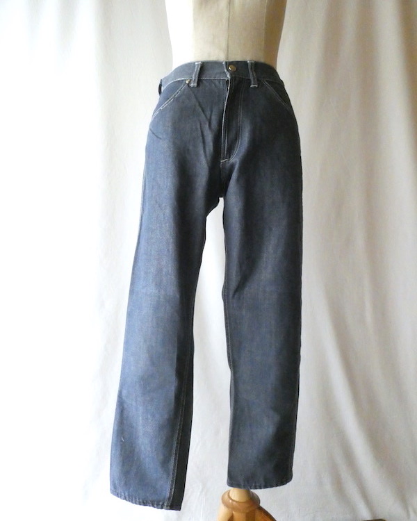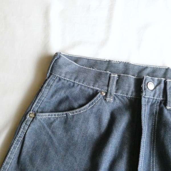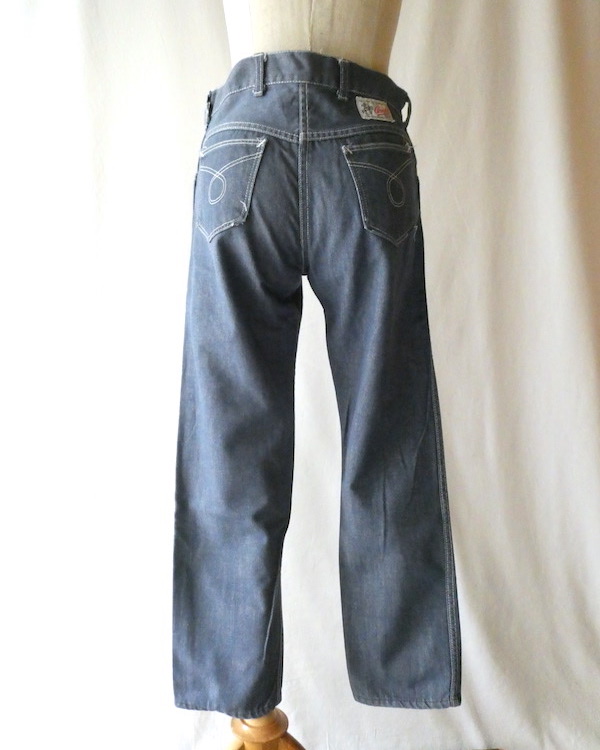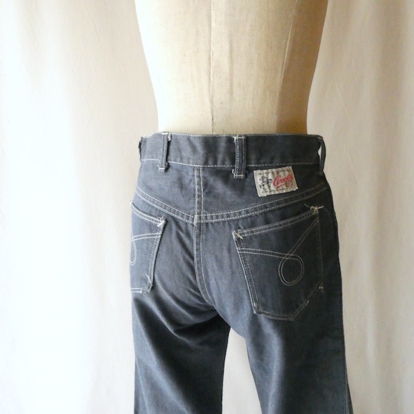 searsのデニム。コットンナイロン素材で、少しパリッとした質感のデニムです。青みが少ない暗めのカラーと白糸の混じりにホワイトステッチ。前右ポケットにだけリベットが付きます。プレーンなシルエットで、どんなテイストのアイテムとも馴染んでくれる1本です。裏側に充布のアイロンパッチがついていた跡があります(破れ等はありませんが、表側から見ると少し跡がわかります。トルソー画像等でも目立ち具合をご確認ください)