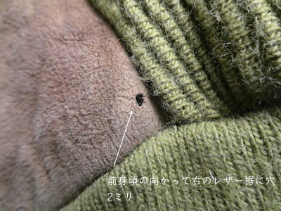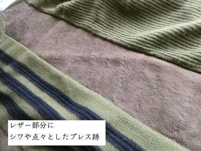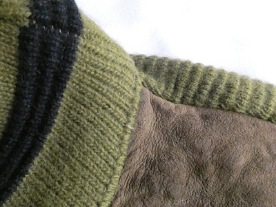 タウンクラフトの抹茶色のハイネックニット。フロントはモスグリーンっぽいモカ色ラムスエードのパネル。センターにブラックの3本ラインが入ります。渋めの抹茶色のハイゲージで、ゆるっと落ち感はありますが、しっかり目の詰まった質感です。ちょこちょこダメージはありますが色合わせが良い一枚.