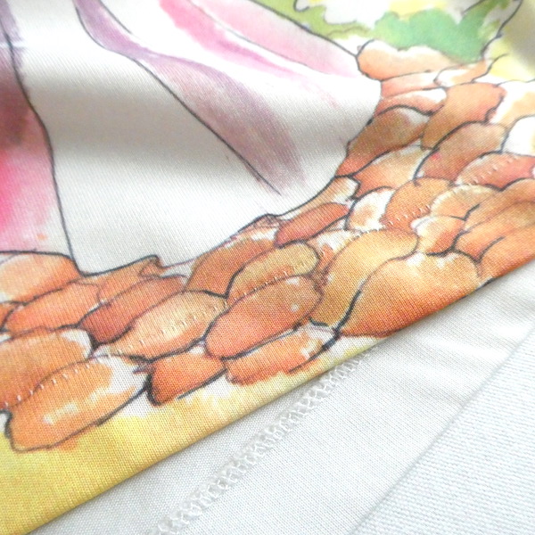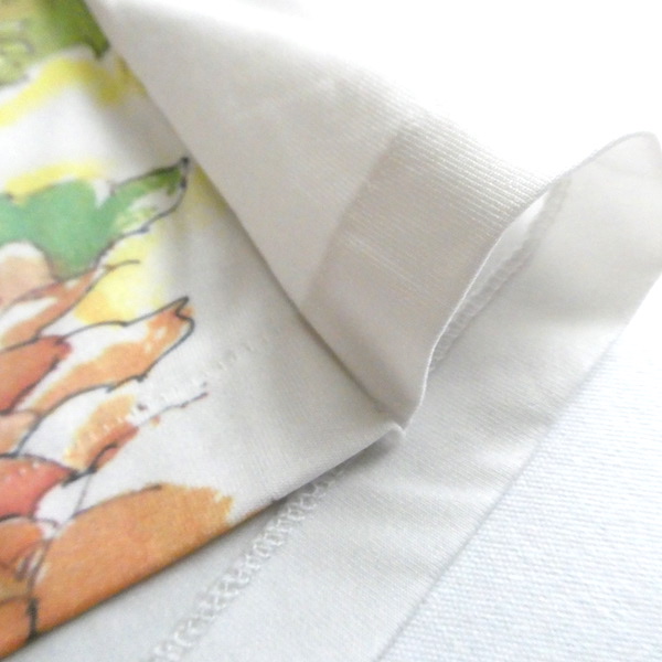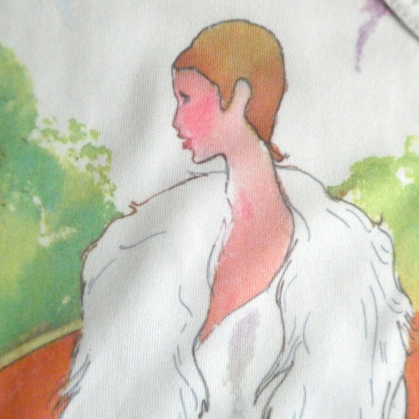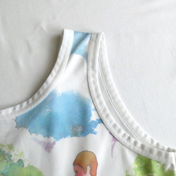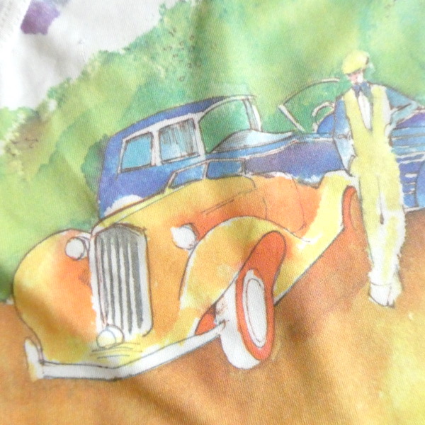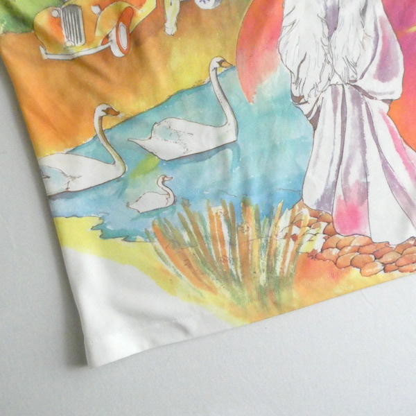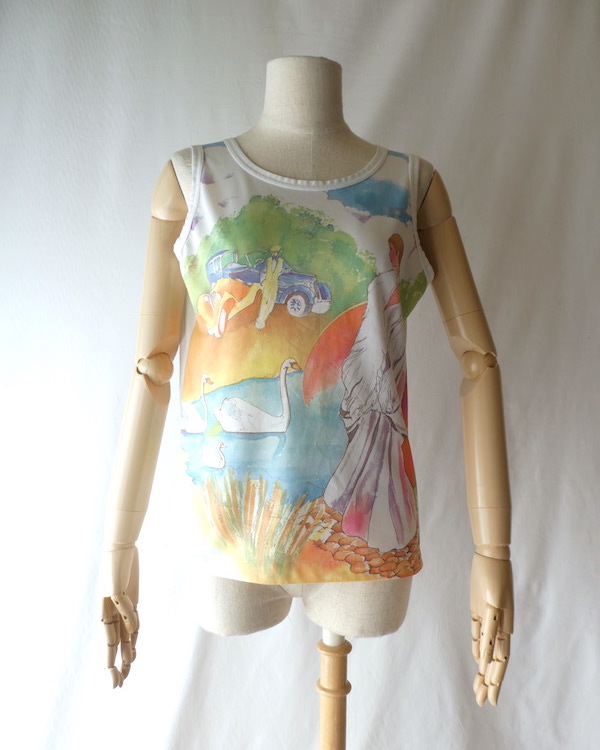 ポリエステル素材のタンクトップです。白地に前見頃には大きく全面プリント。水彩かカラーインクのような綺麗な色味のイラストです。白鳥がいる湖畔を挟んで、素敵な女性とクラシックカーの男性。奥行きのあるイラストと澄んだカラーが◎。インナーに色味を挿す感じで使えて便利ですよ。