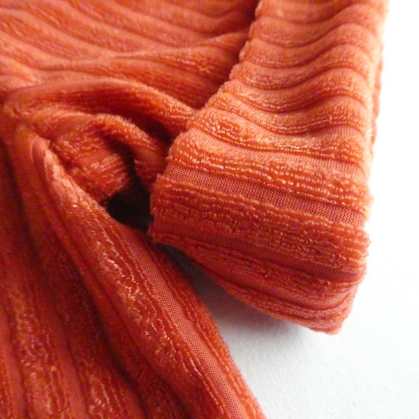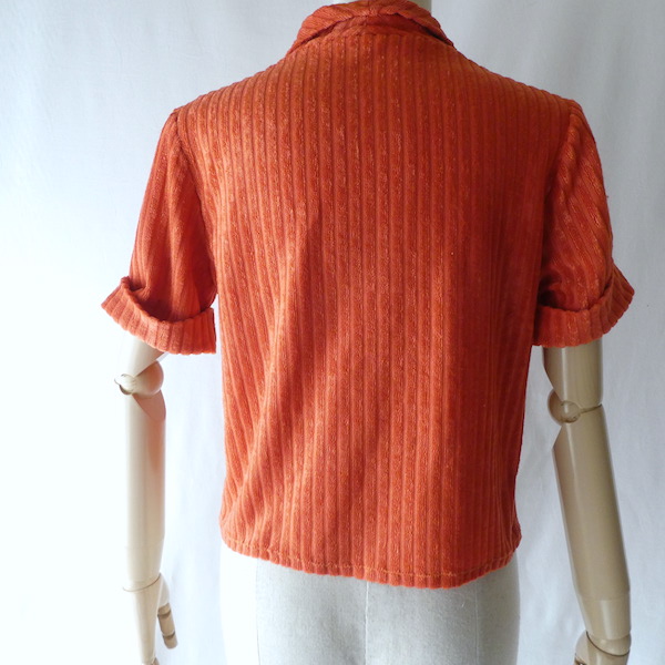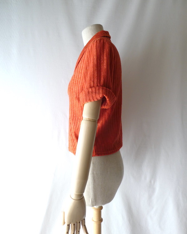 パイル地の半袖トップスです。少し光沢のあるポリエステルのオレンジパイルのストライプ。小さめのショールカラーで、全体的に小ぶりなサイズ感です。おへそ位のショート丈でバランス良く着れるアイテム。