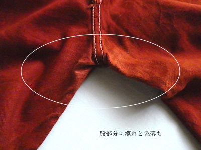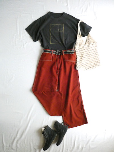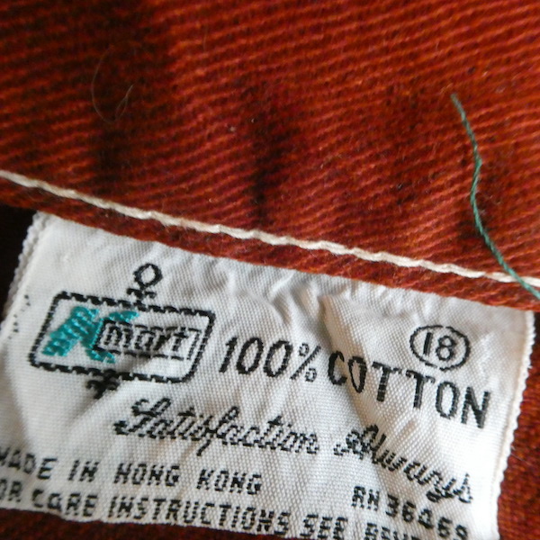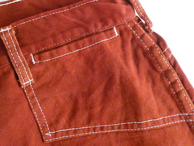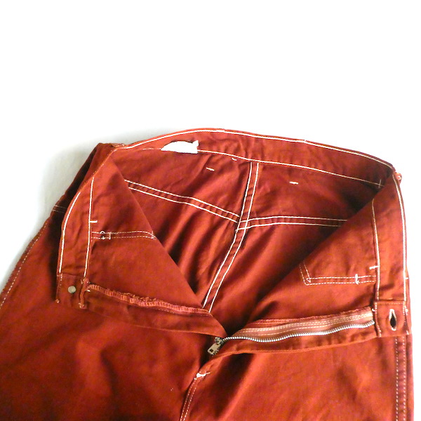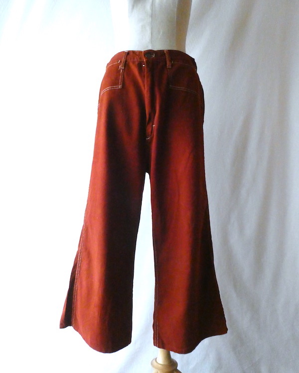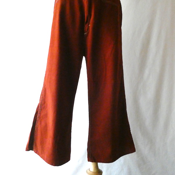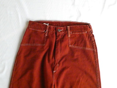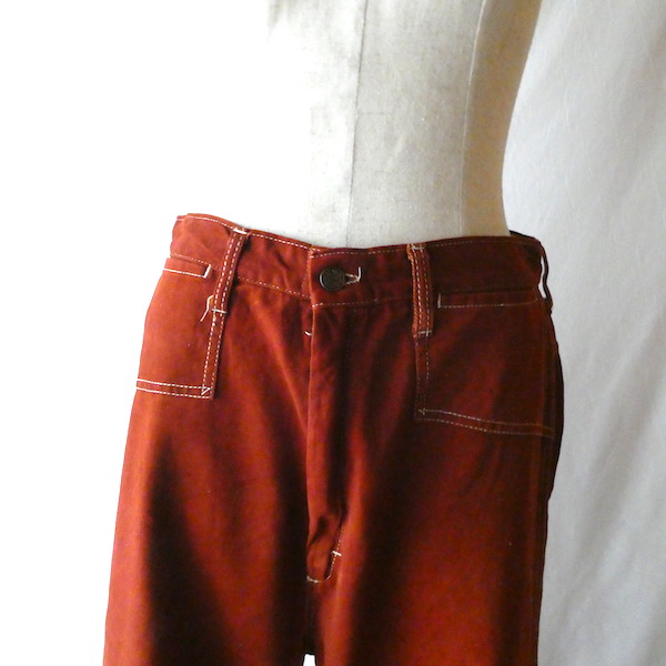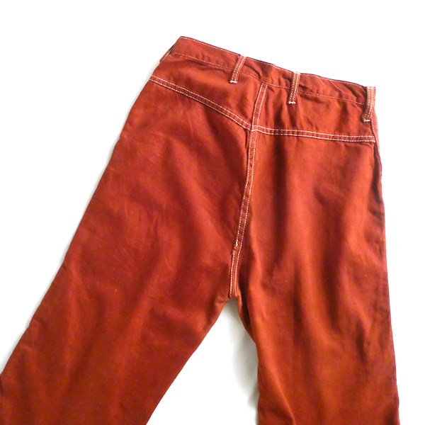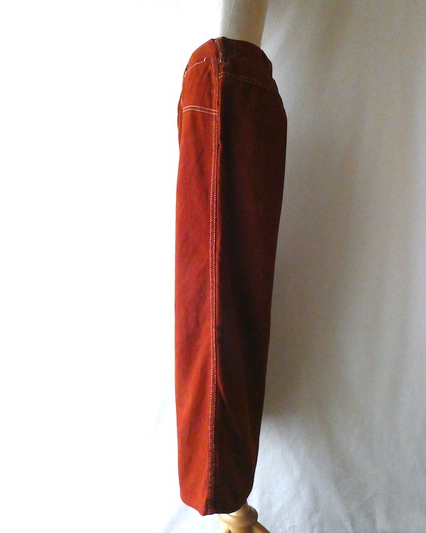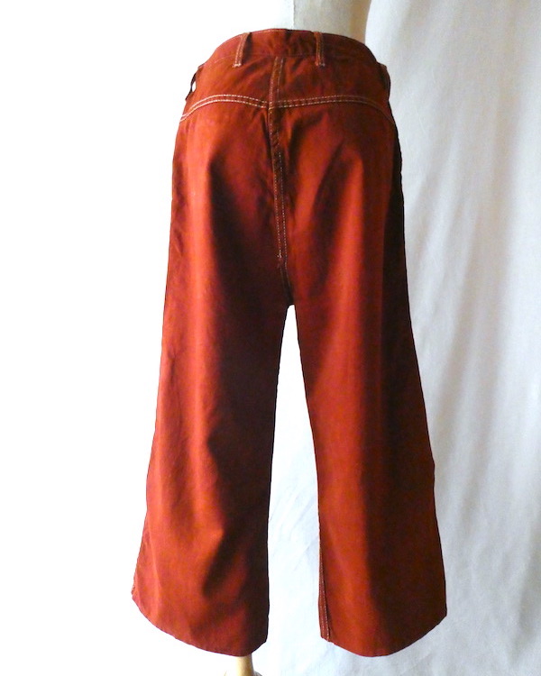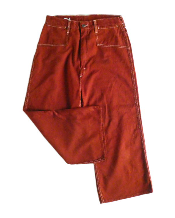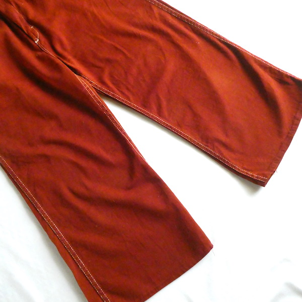 K-martのカラーパンツ。深いテラコッタブラウンにホワイトステッチが効いたアイテム。ポケットの少し変わった作りが白ステッチで際立ちます(少し大きめのコインポケットのみ)元々薄手の生地が洗い込まれてくったり柔らかな質感。ワイドフレアなシルエットに深すぎる股上、中途半端に短めの丈感でアンバランスさが逆にダサ目で可愛いアイテム。ギュンと締めてジャストウエストも、ゆるっと腰を落として着ても◎