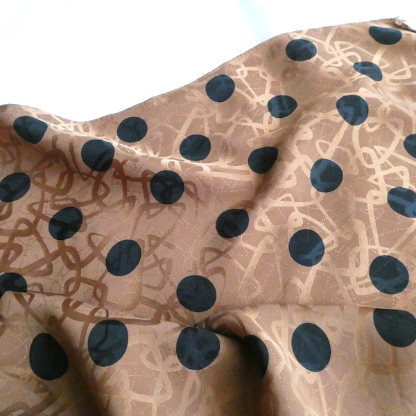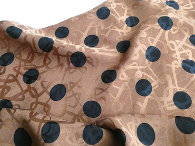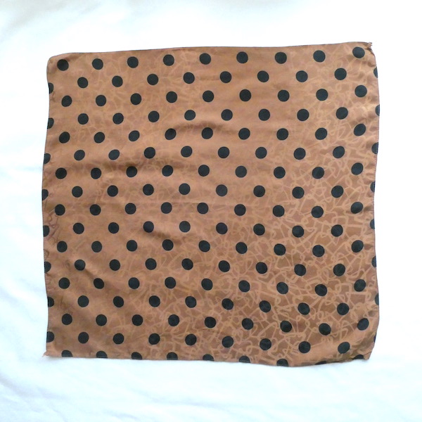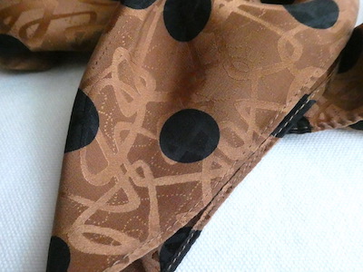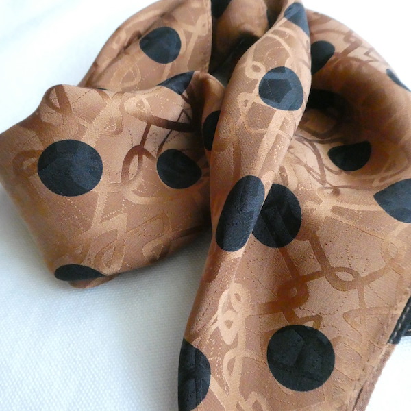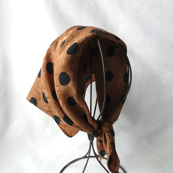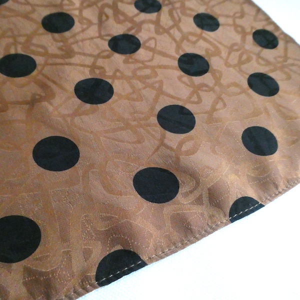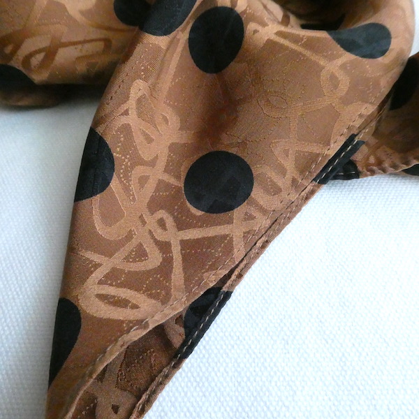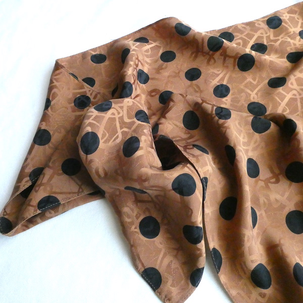 シルクの正方形スカーフです。織柄の入った光沢のあるブラウン生地に、大きめの黒いドットがプリントされています。軽くやわかなシルク生地。中判サイズで、頭にも、首にも使い易い大きさです。