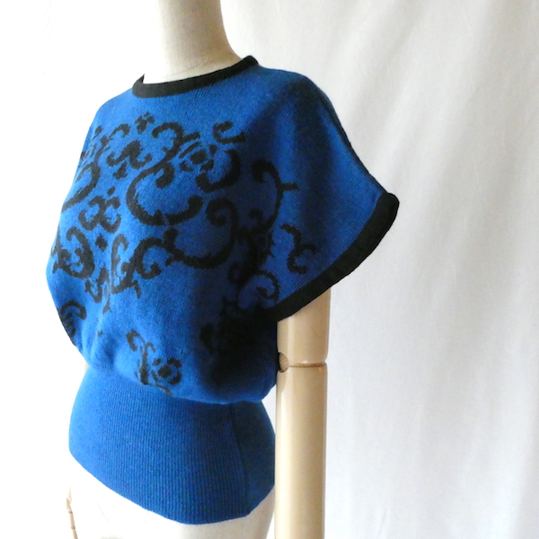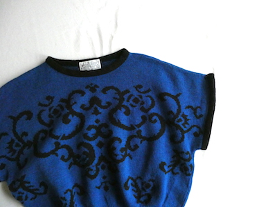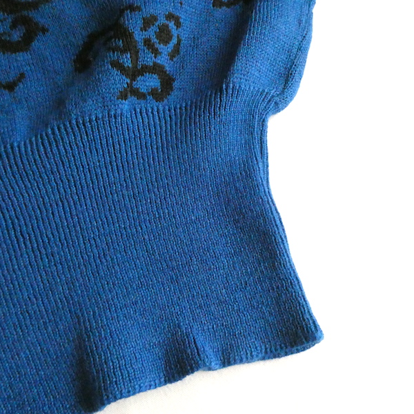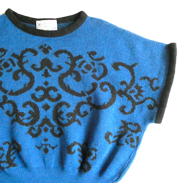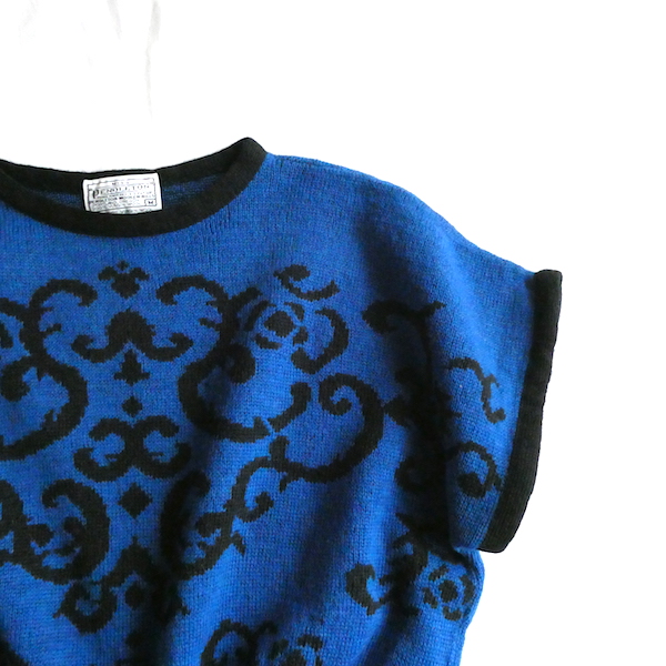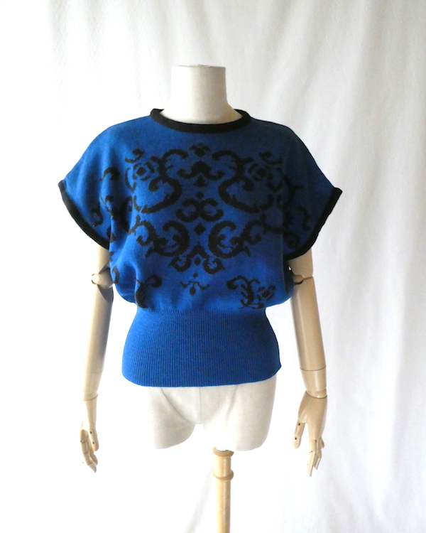 ペンドルトンの半袖ニットです。前身頃には深いブルーにブラックでアラベスク調の柄入り。50年代のニットのように裾リブ長めでショート丈でキュッと着れるアイテム。半袖ですが肩が隠れる長さがあるので着易いですよ。季節の狭間にも便利です。