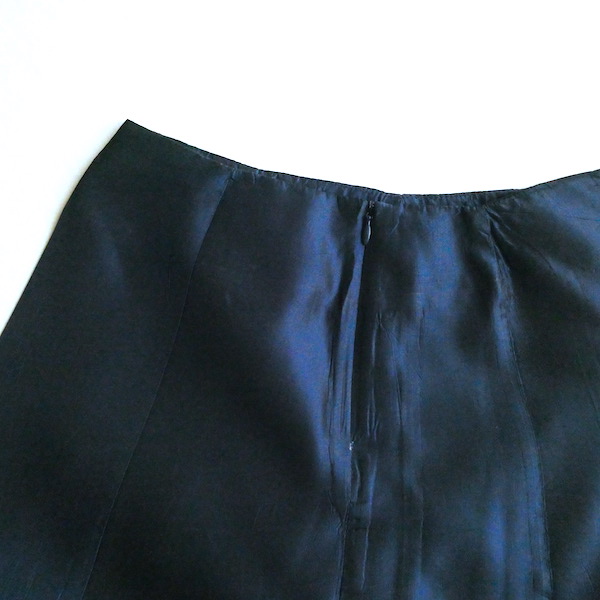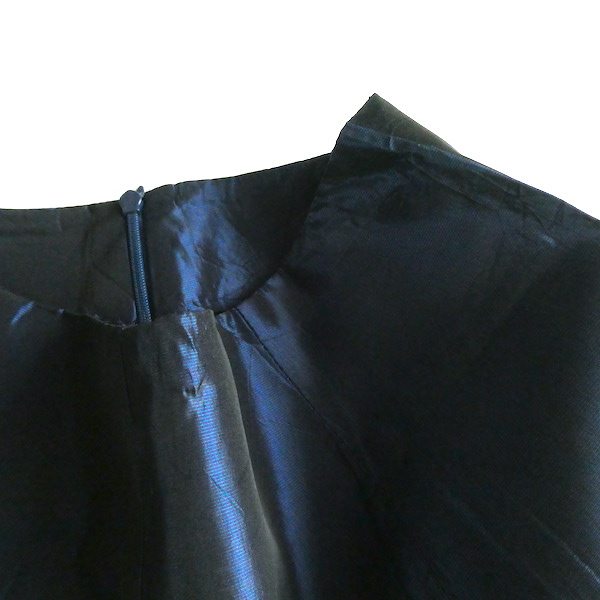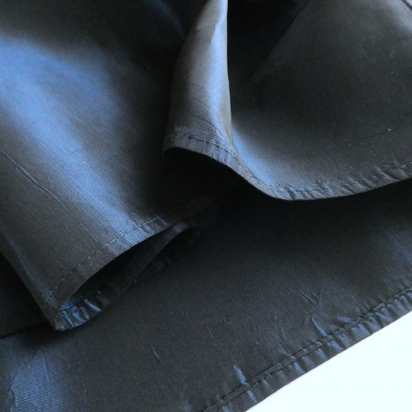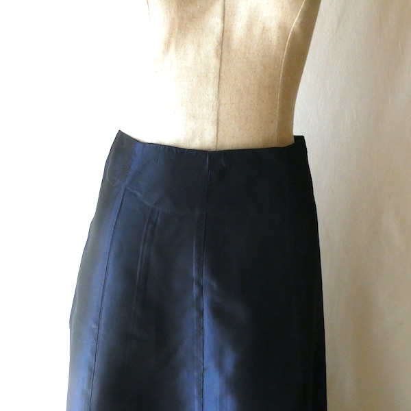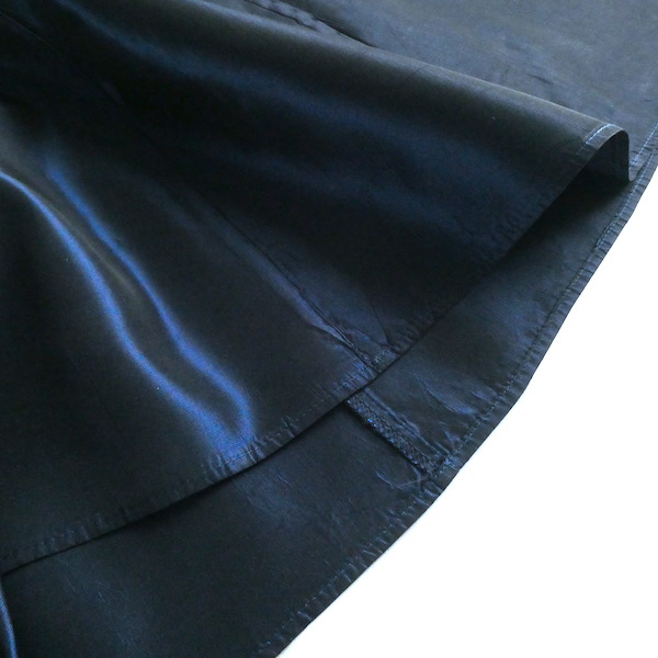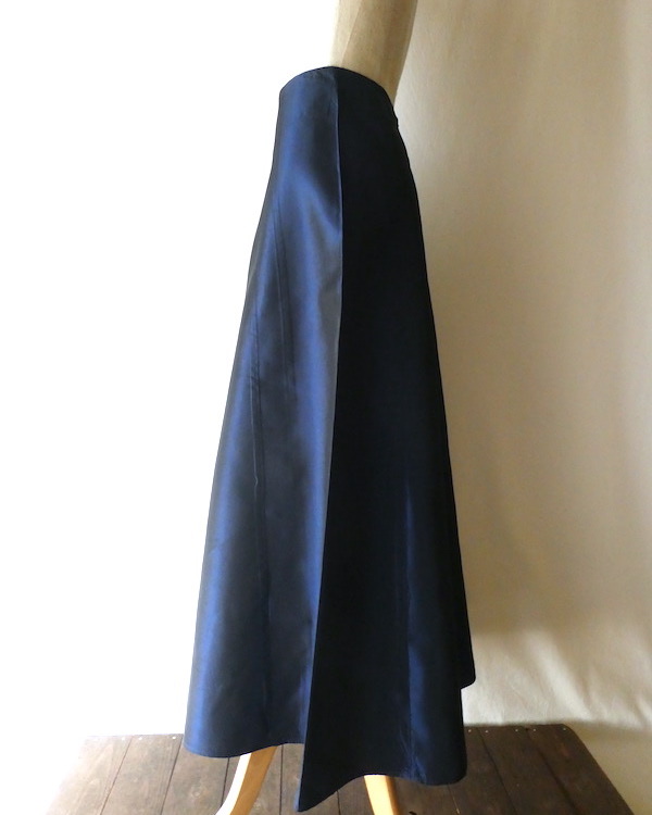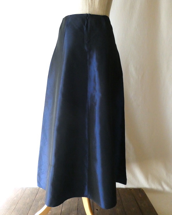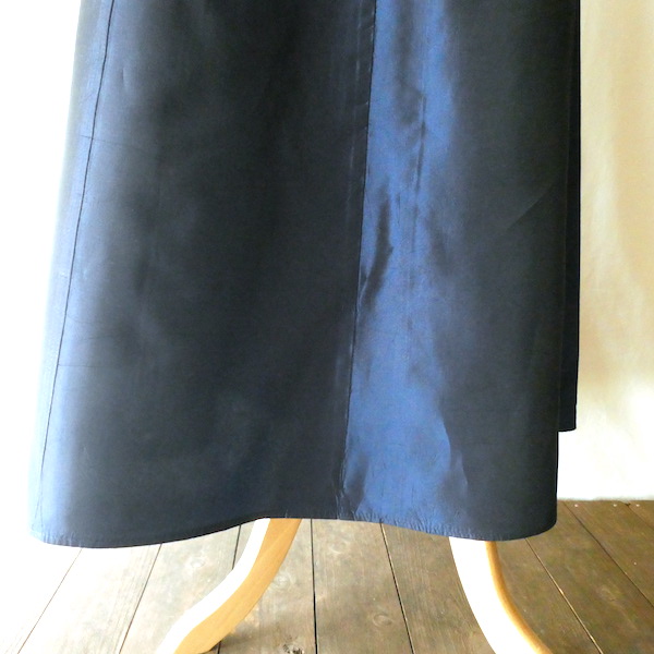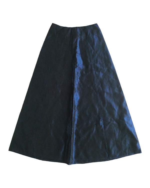 光沢のある深いブルーのロングスカート。黒、青糸で織られた玉虫のような反射がメタリックで大人っぽいアイテム。張りのあるしっかりめ生地のフレアシルエット。シーズン問わずお使い頂けそうな素材感です。