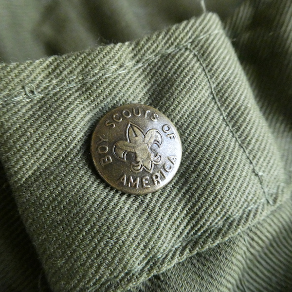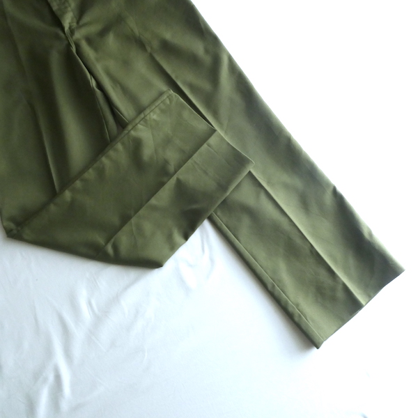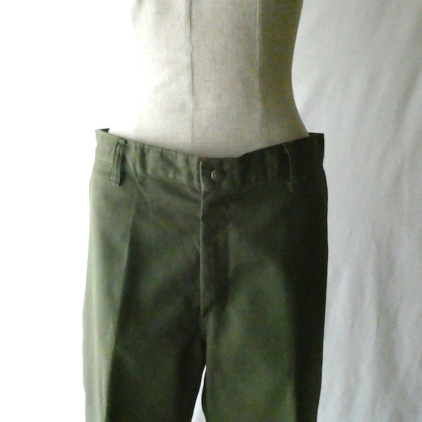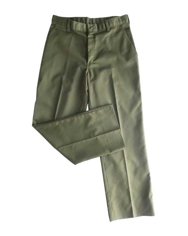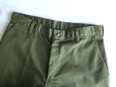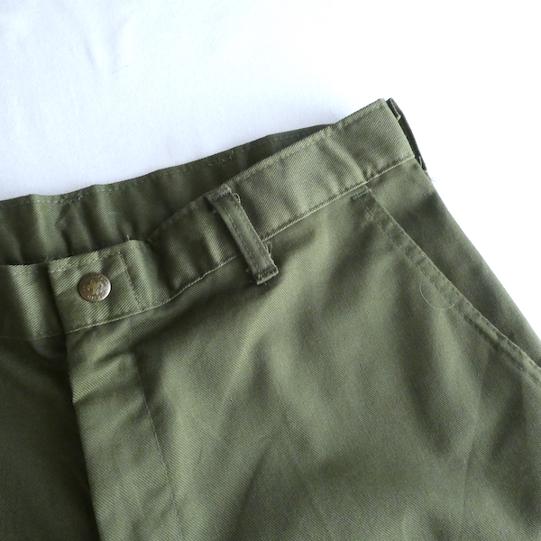 ボーイスカウトのパンツ。濃いめアーミーグリーンのツイル生地。コットンポリでまだ色もしっかり残った状態です。比較的太めのシルエットで、腰回りからストンと綺麗に落ちます。気負わずガンガン使えて、持っていると便利なアイテムです。