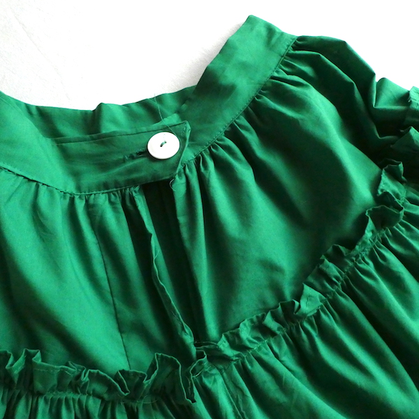 5段ティアードのマキシ丈スカートです。派手すぎずの良い色味のグリーン。5段ティアードですが単色なので大人っぽい印象です。当時の方のハンドメイドのようでファスナー等も無くコスチュームの類かと思います。生地ボリュームがある分、少々重量ありますが、実際に着てしまうと気になりません。スニーカー等と合わせてデイリーに使いたいアイテムです。