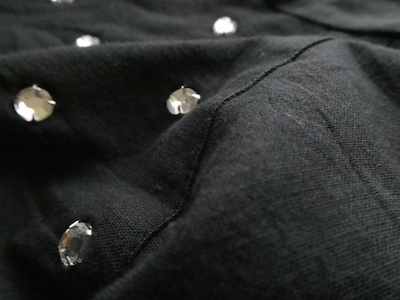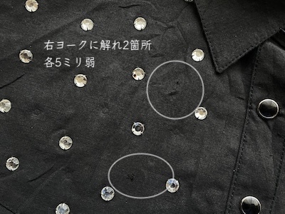 長袖のブラックコットンシャツです。スナップボタンにV字ヨークのウェスタンシャツデザイン。ヨーク部分にはクリアなビジューが沢山。フロントを前閉じしてインしてキリッと着ても、全開してサラッと羽織るにも便利なサイズ感です。